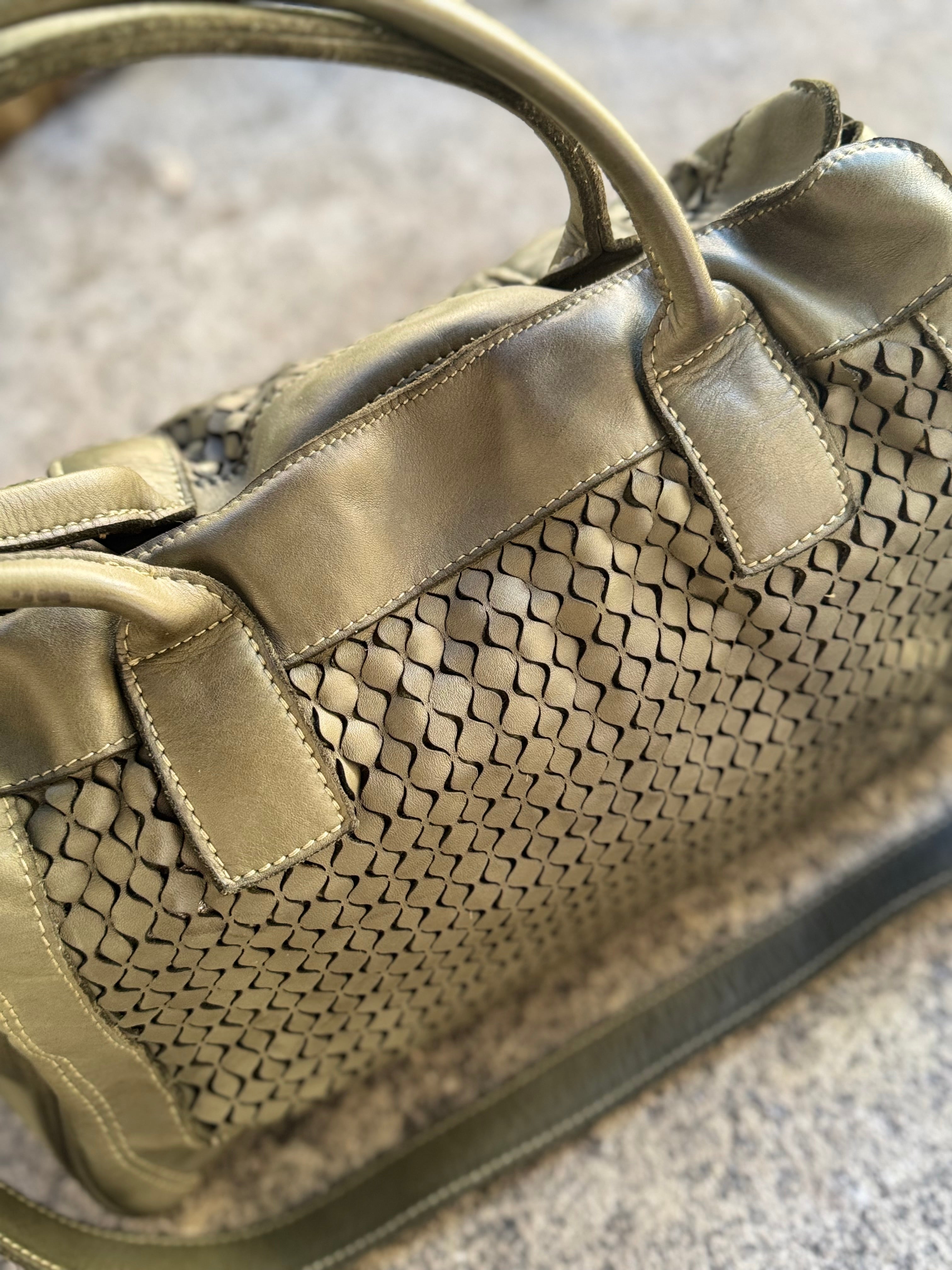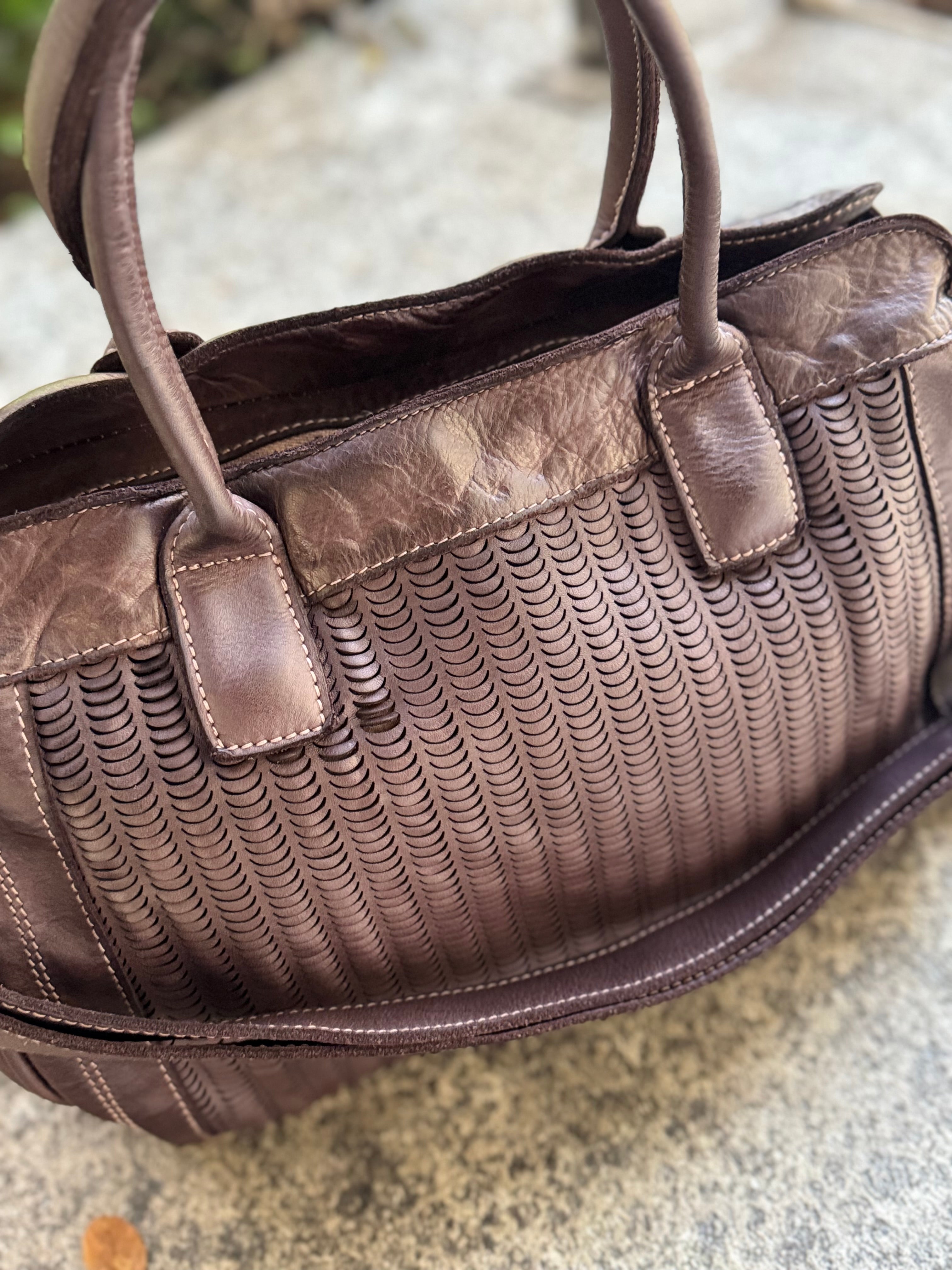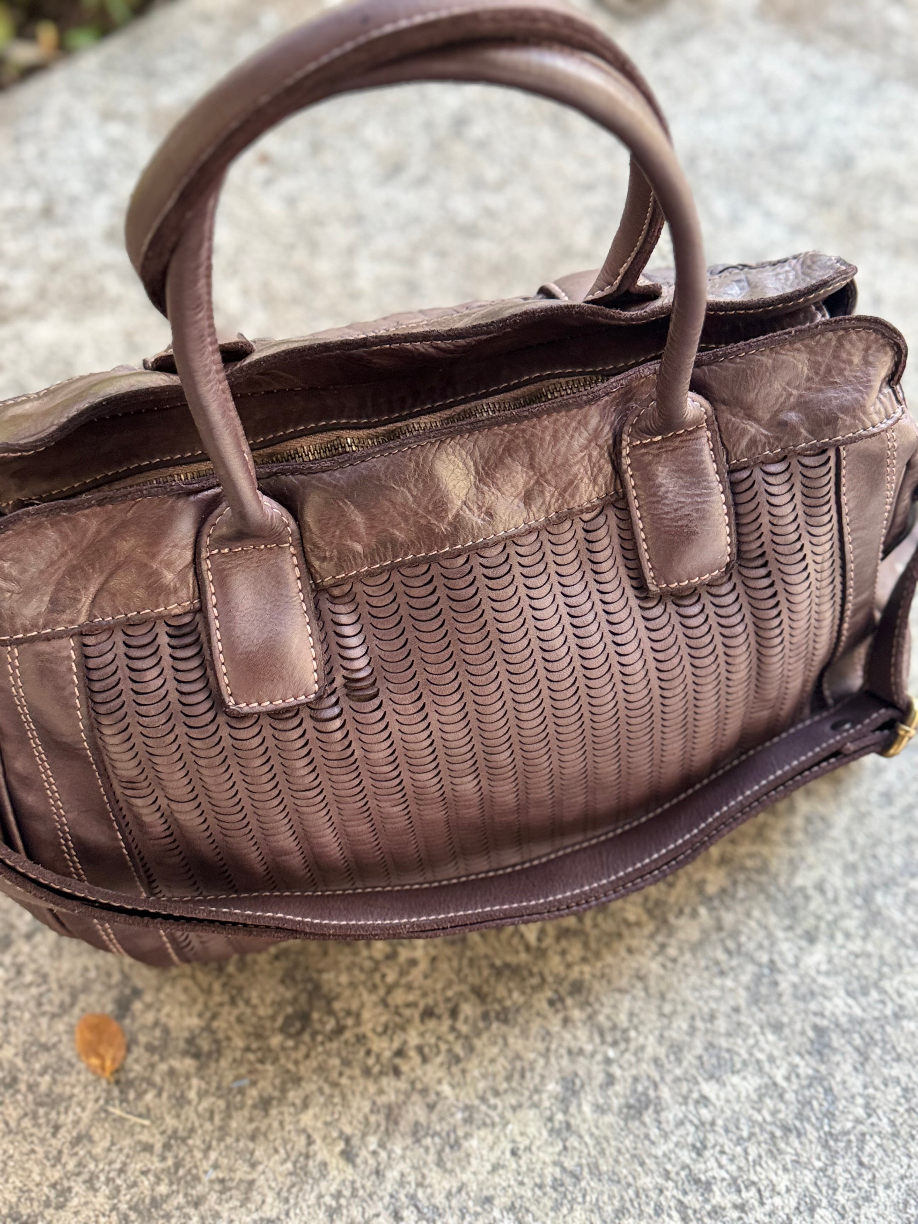 Borsa grande in vera pelle con lavorazione taglio laser, cerniera, tracolla e manici lunghi, fodera in cotone in tinta unita, tasche interne