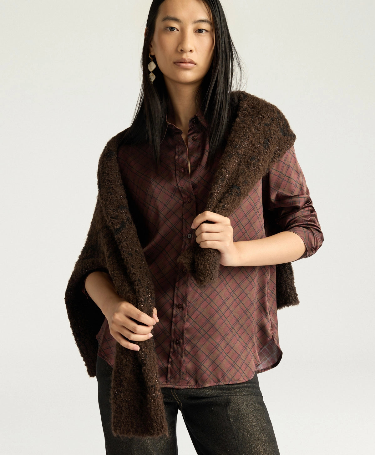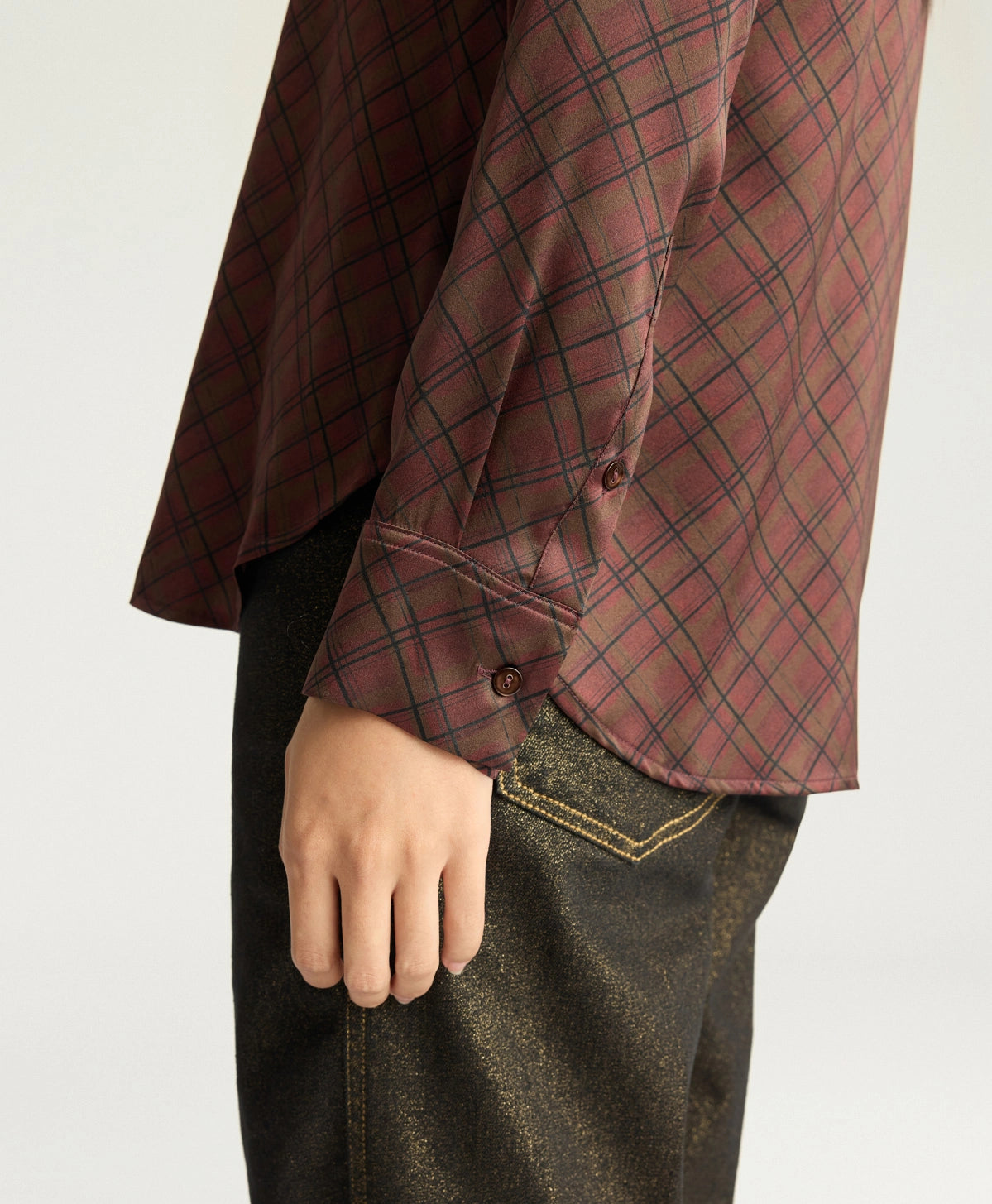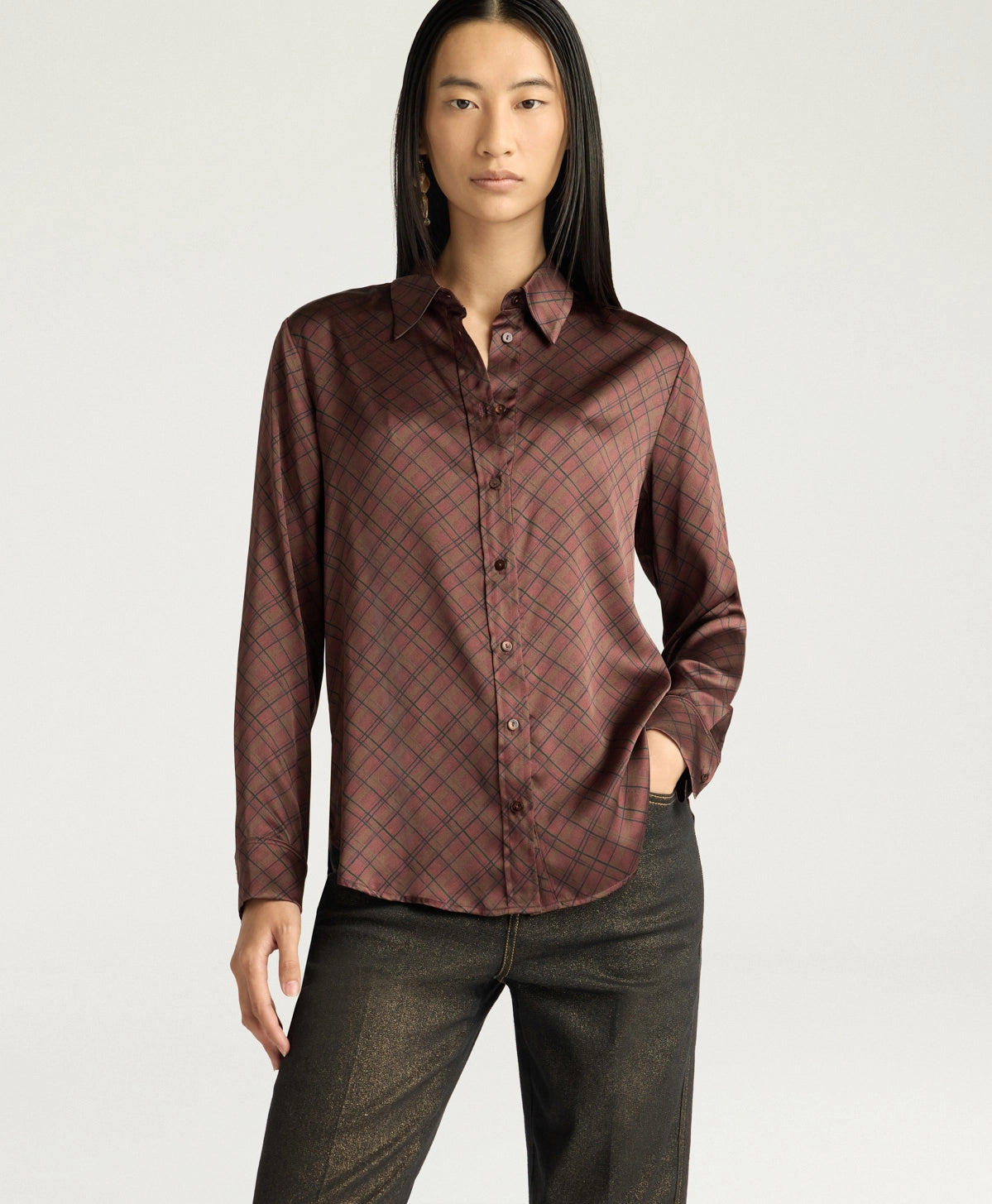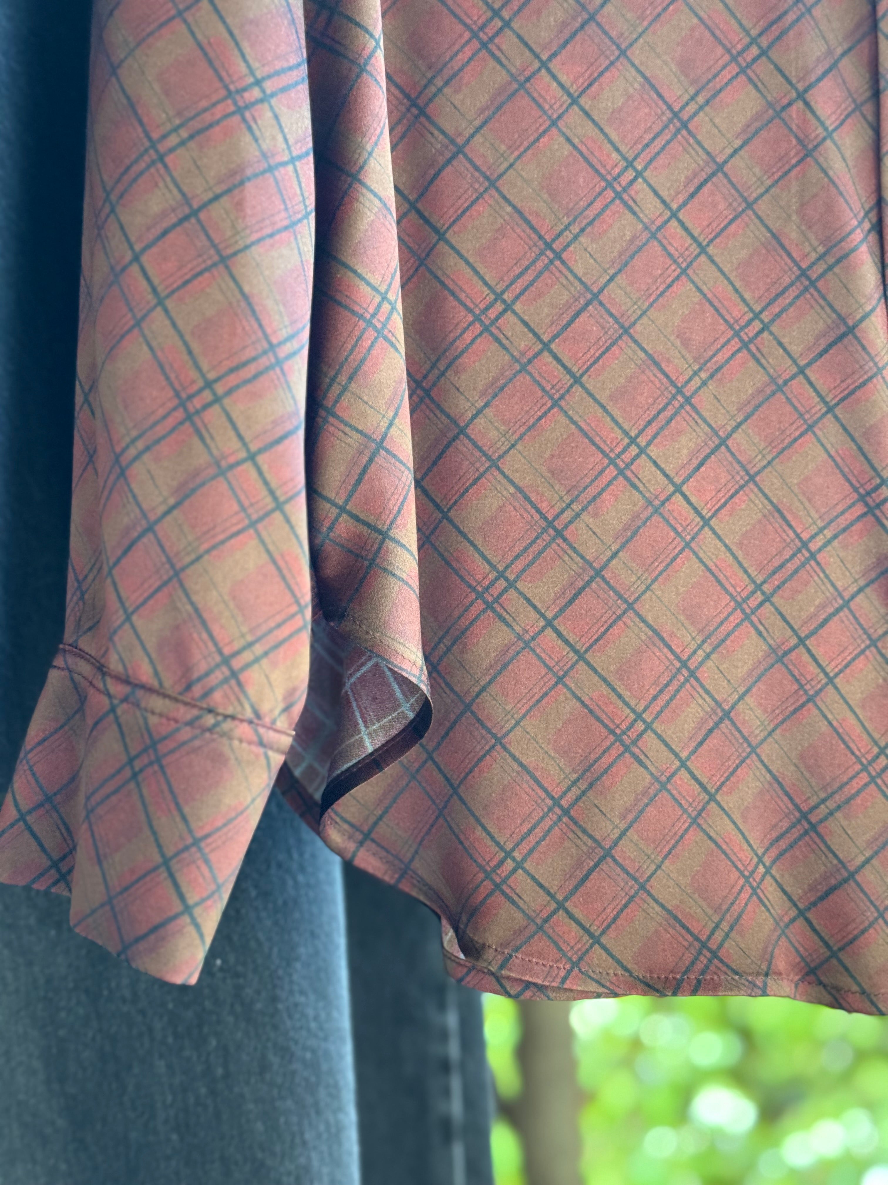 Camicia sciancrata in prezioso raso stretch di pura seta stampata. Cora si caratterizza dall’asciutta linera maschile con fondo sagomato ed impunture a due aghi. Bottoni in madreperla.