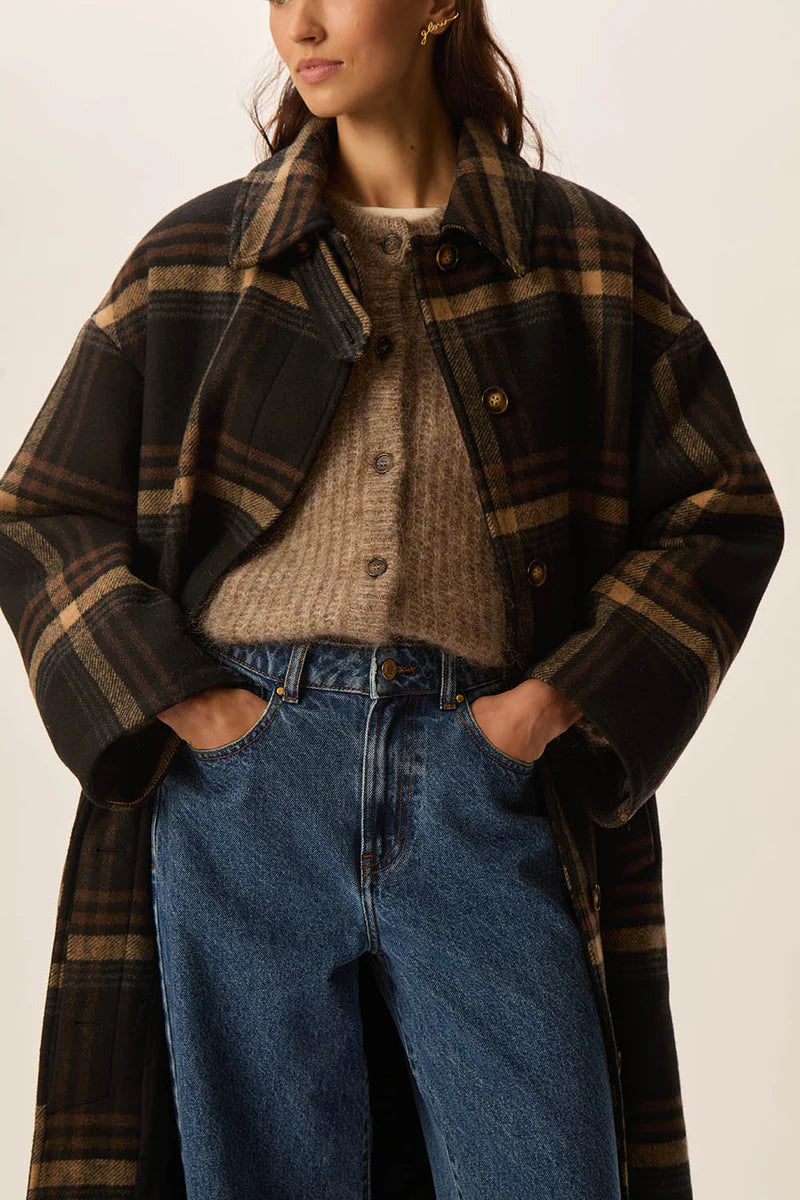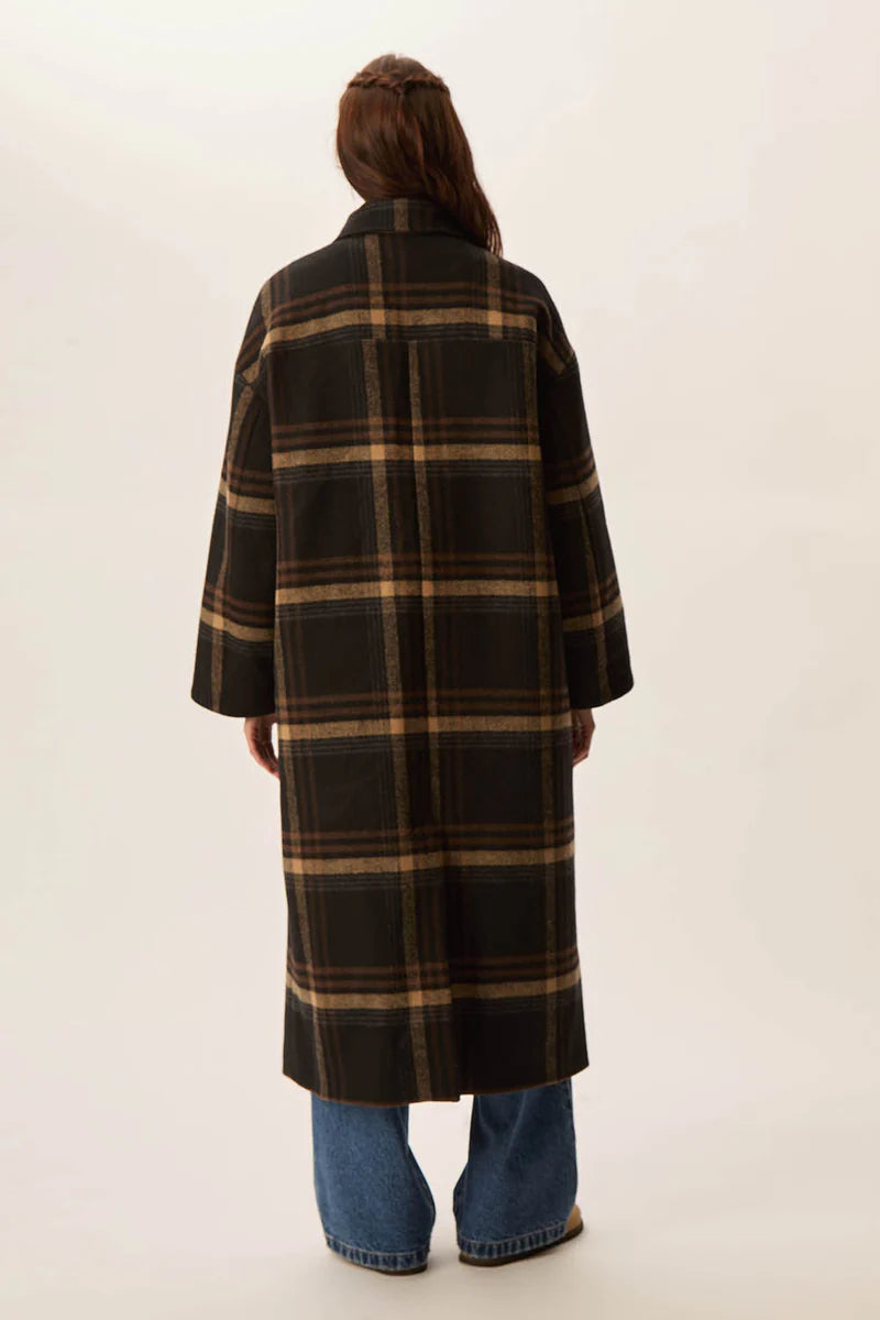 Cappotto lungo in misto lana marrone a quadri, completamente foderato, vestibilità ampia