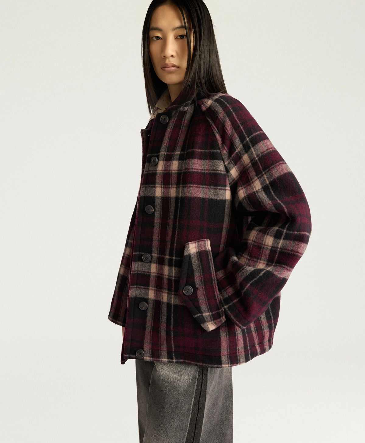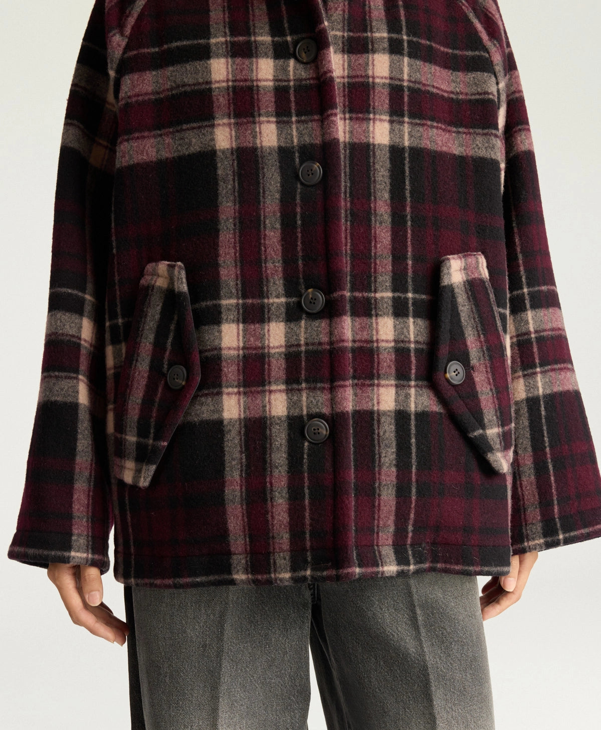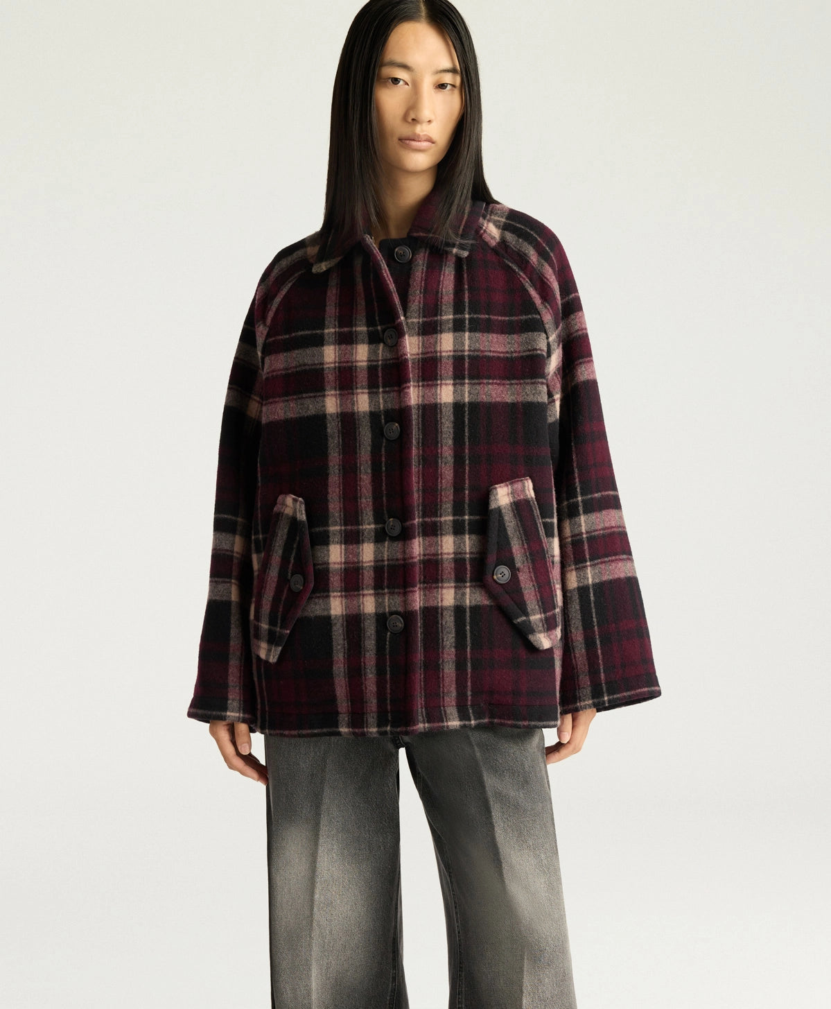 Caban over monopetto sfoderato in panno double di lana con disegno tartan. Linea boxy, manica raglan e tasche con aletta rendono questo capo raffinato e passpartout. Interno in colore unito.
