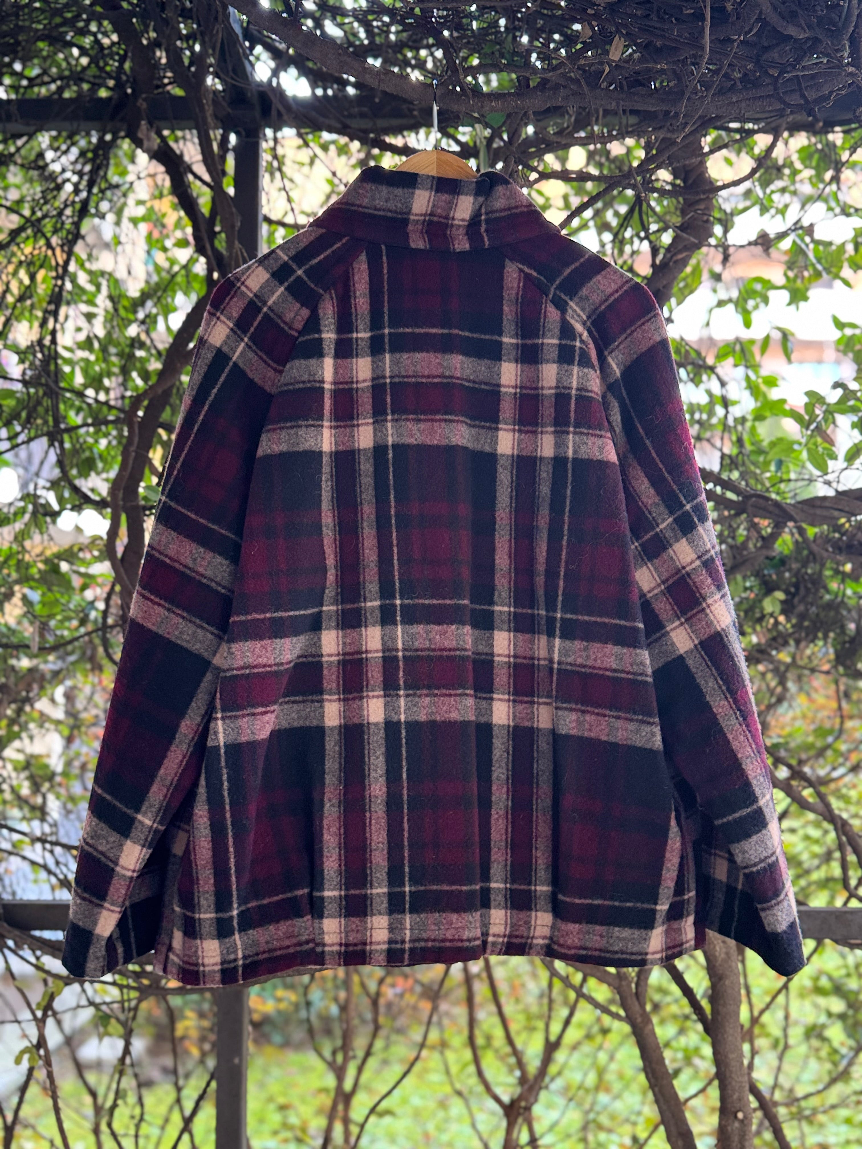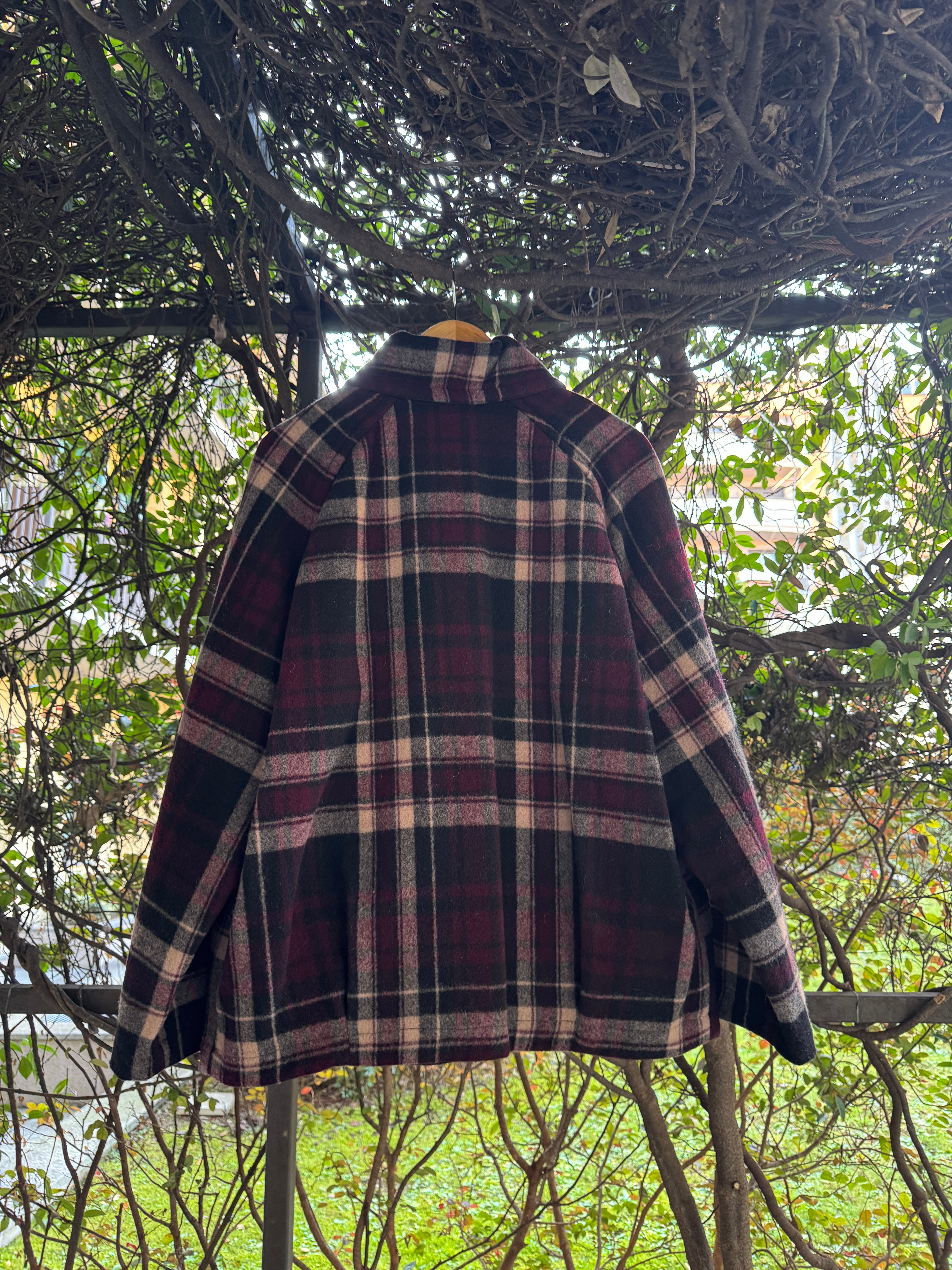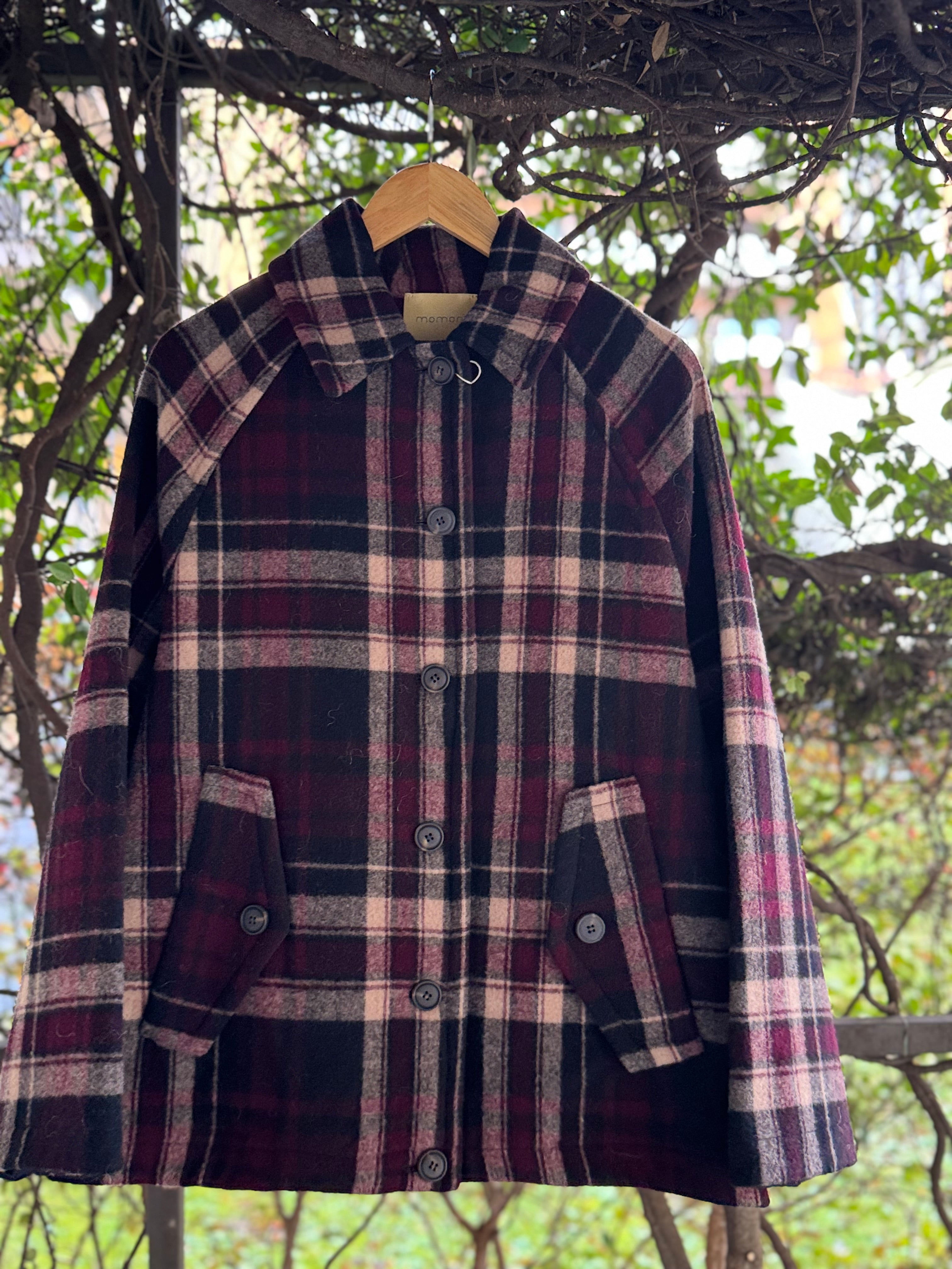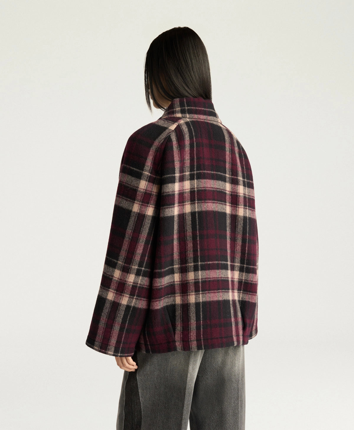 Caban over monopetto sfoderato in panno double di lana con disegno tartan. Linea boxy, manica raglan e tasche con aletta rendono questo capo raffinato e passpartout. Interno in colore unito.