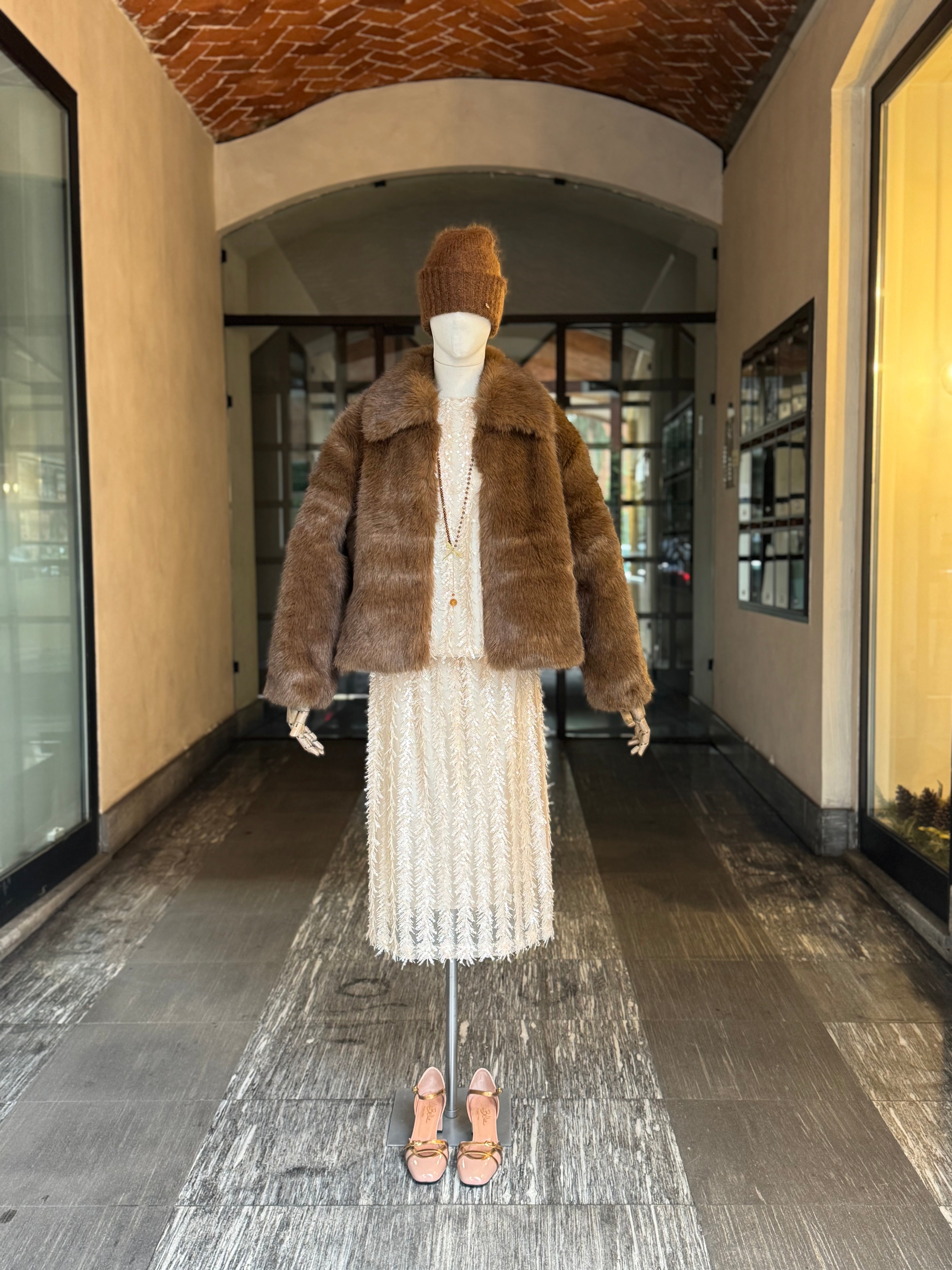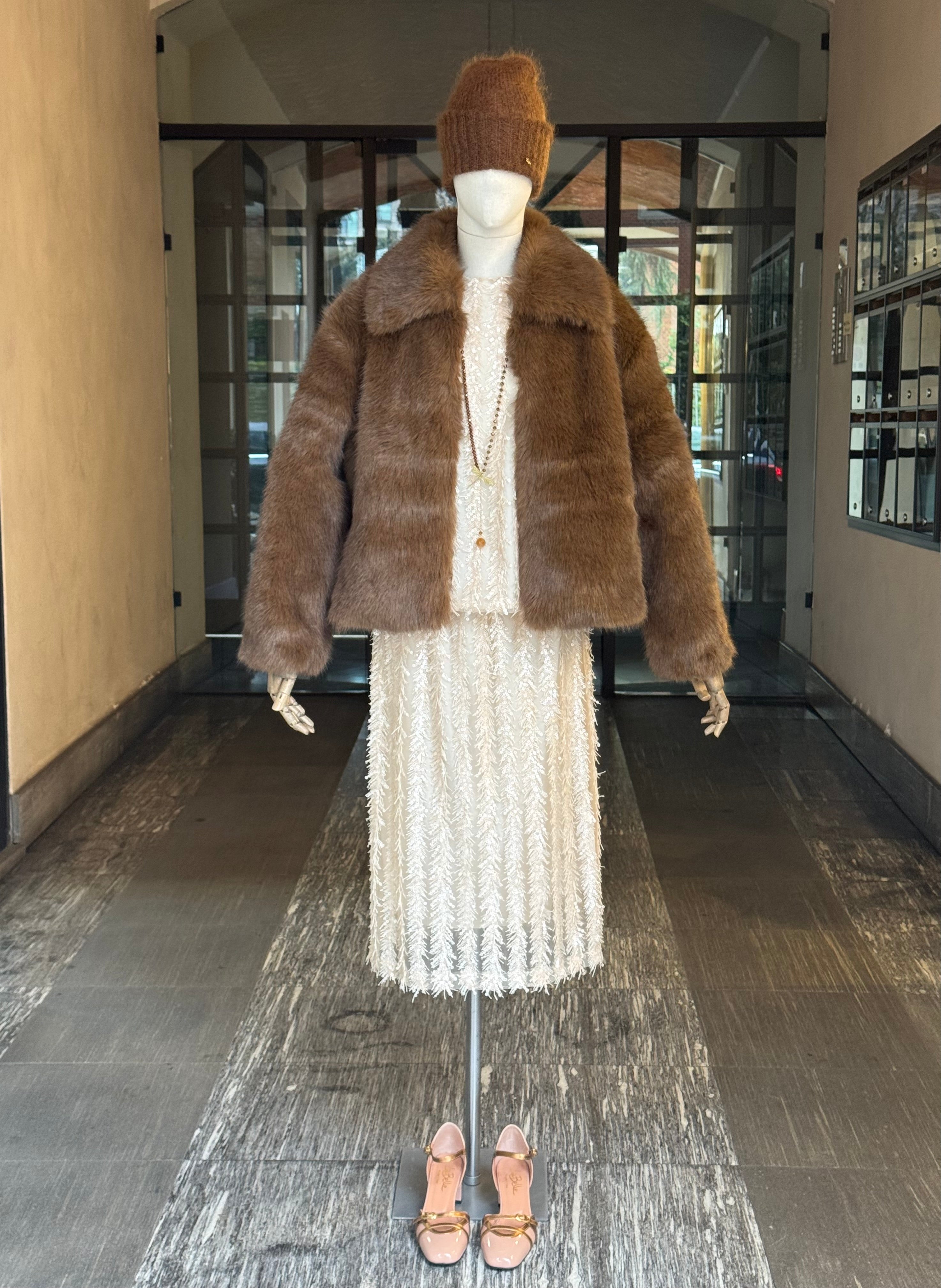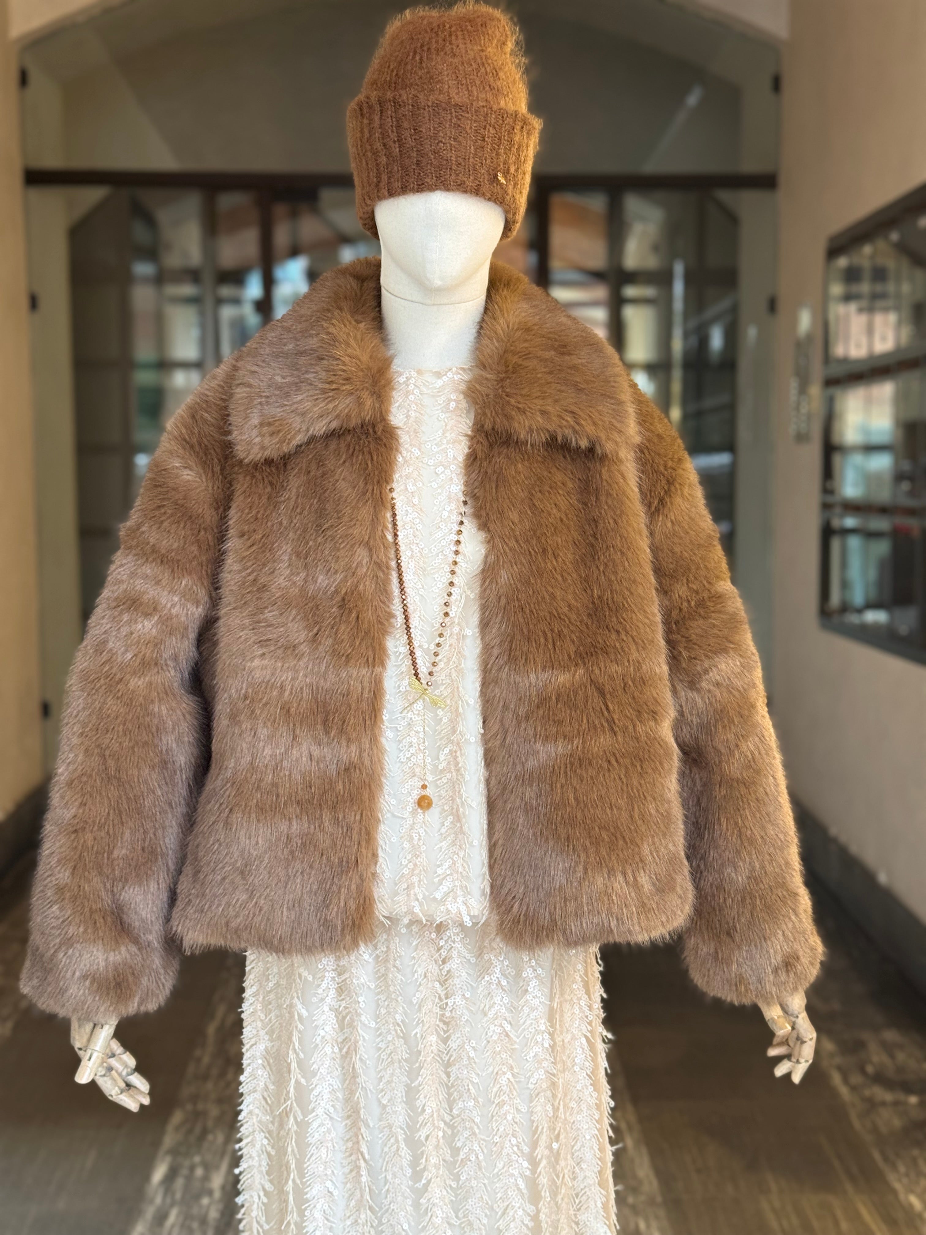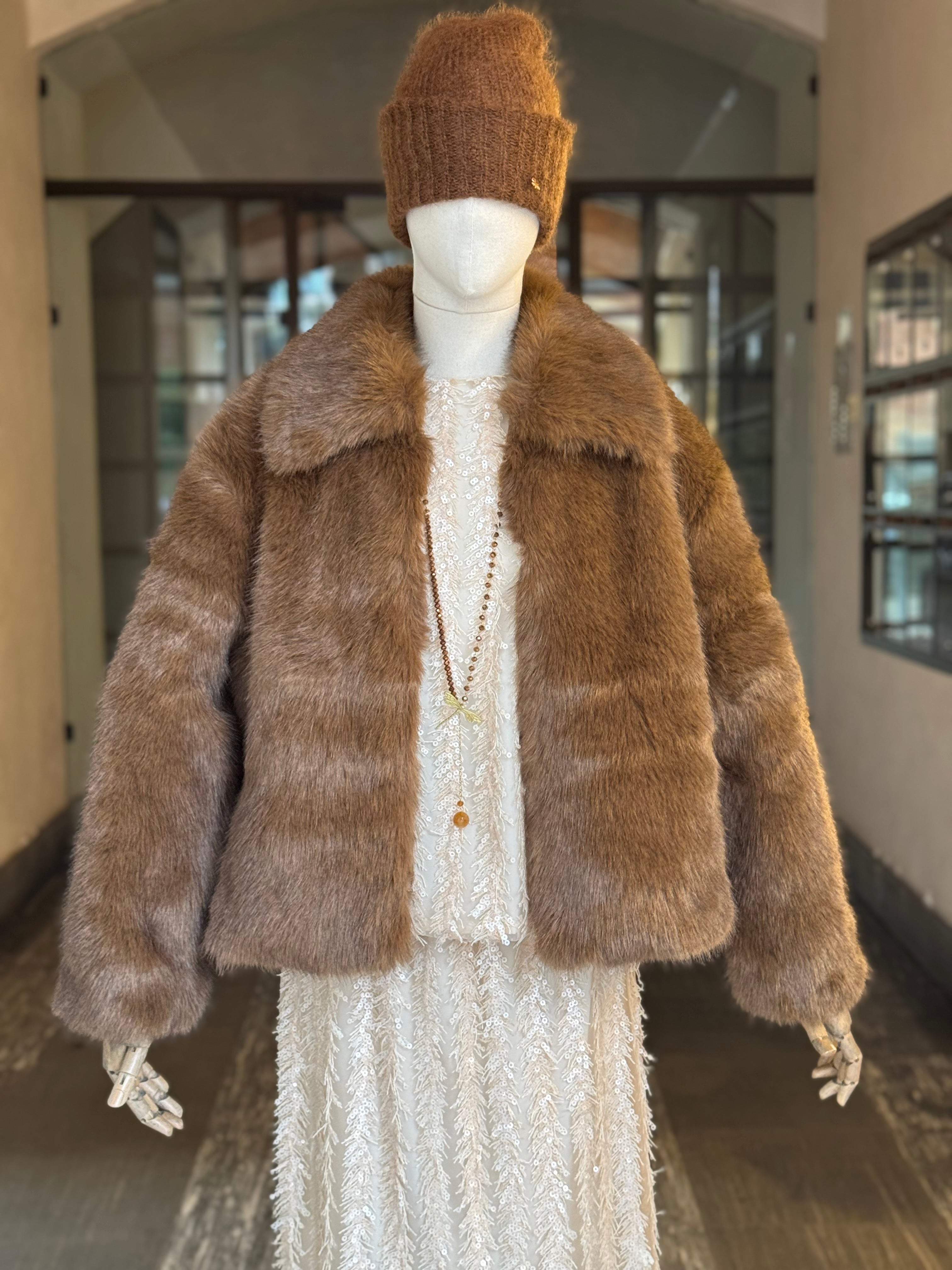 Giacca corta in eco pelliccia moka dal taglio comodo, chiusura con gancetti a scomparsa, tasche laterali, completamente foderata