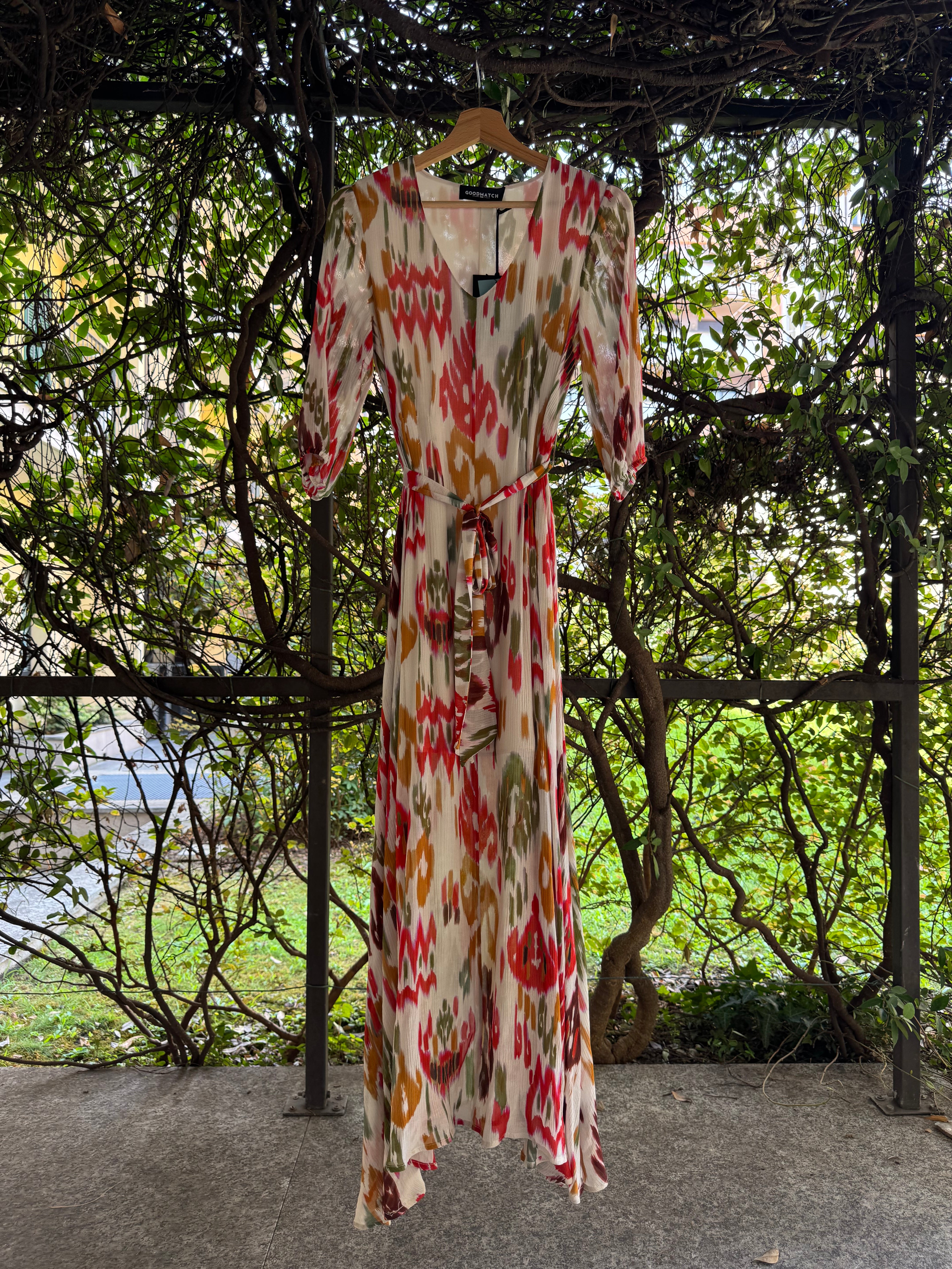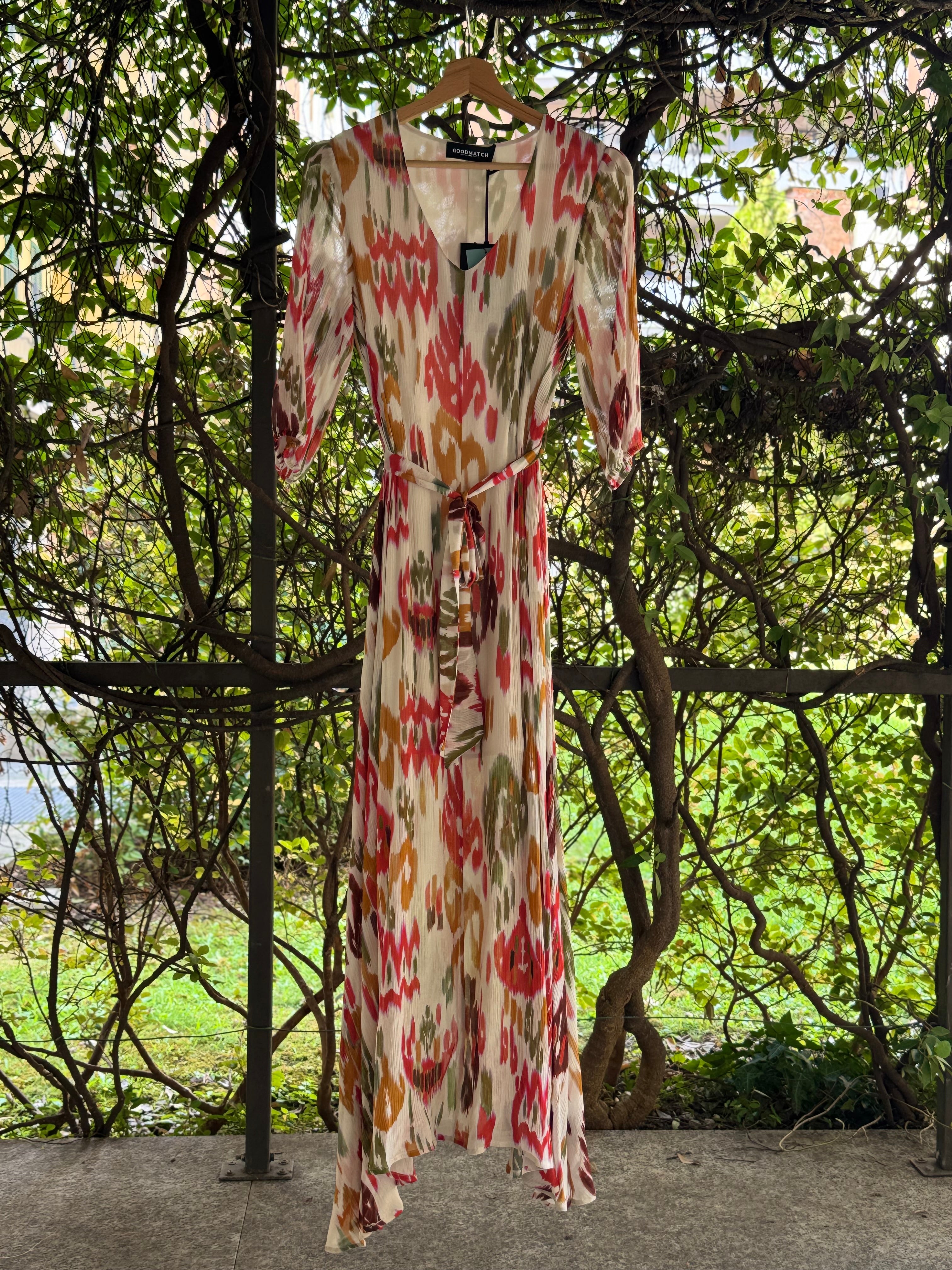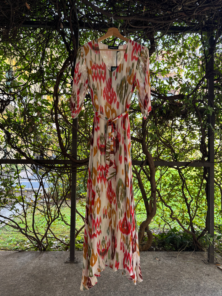 Abito lungo in crêpe di viscosa e seta stampata, con manica al gomito ampia. Si chiude con cerniera zip a scomparsa sul fianco, cintura in tessuto da allacciare sul punto vita, scollo a V