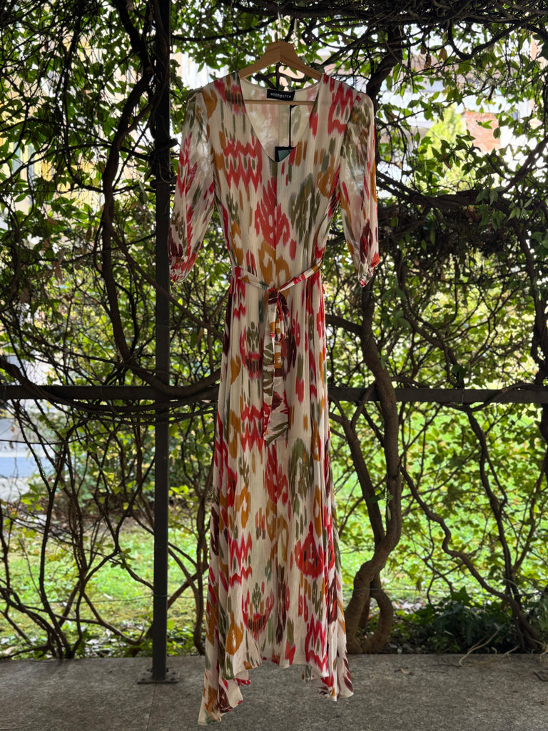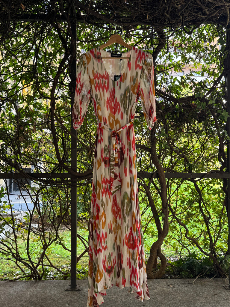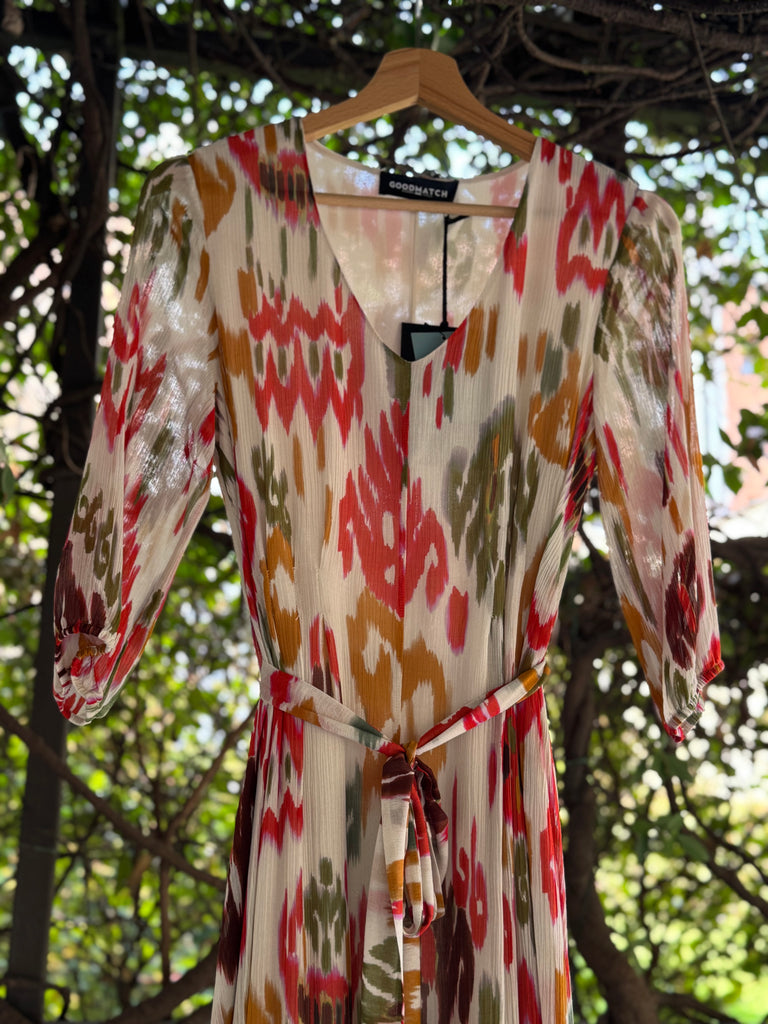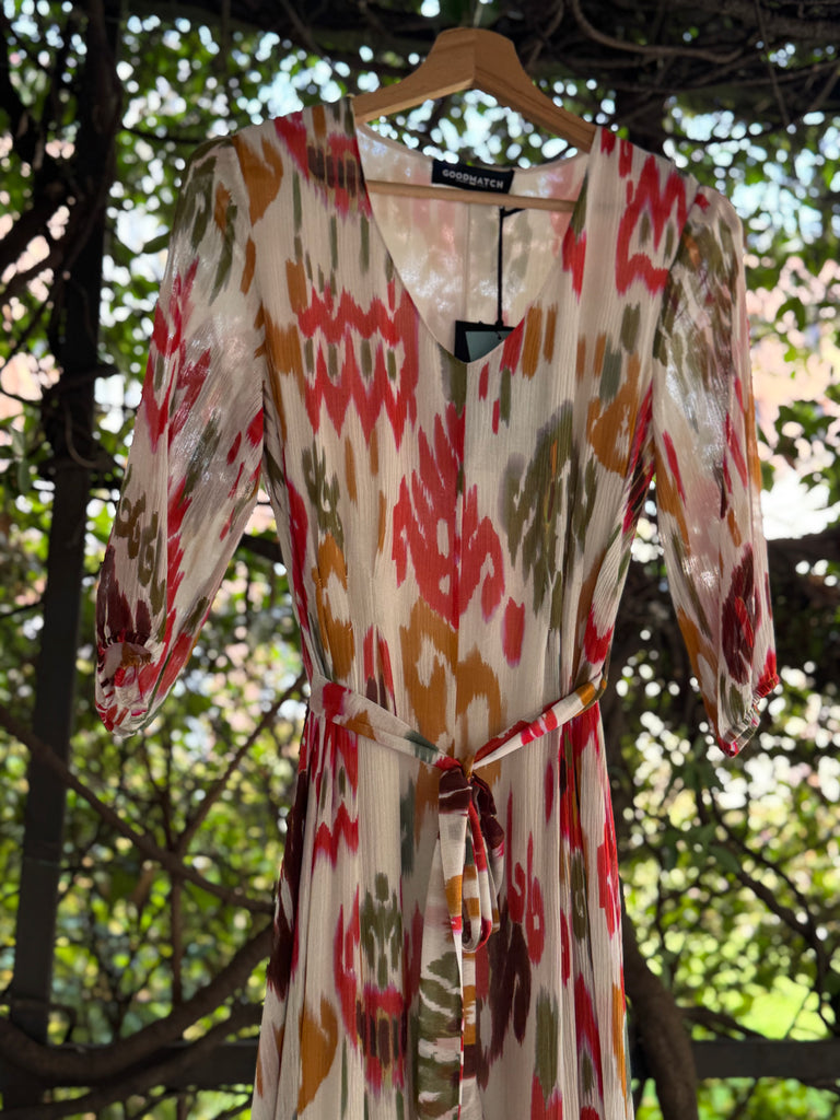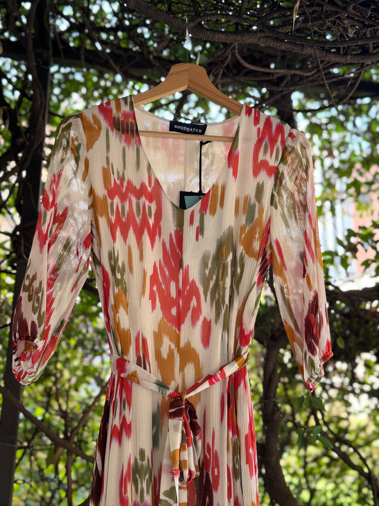 Abito lungo in crêpe di viscosa e seta stampata, con manica al gomito ampia. Si chiude con cerniera zip a scomparsa sul fianco, cintura in tessuto da allacciare sul punto vita, scollo a V