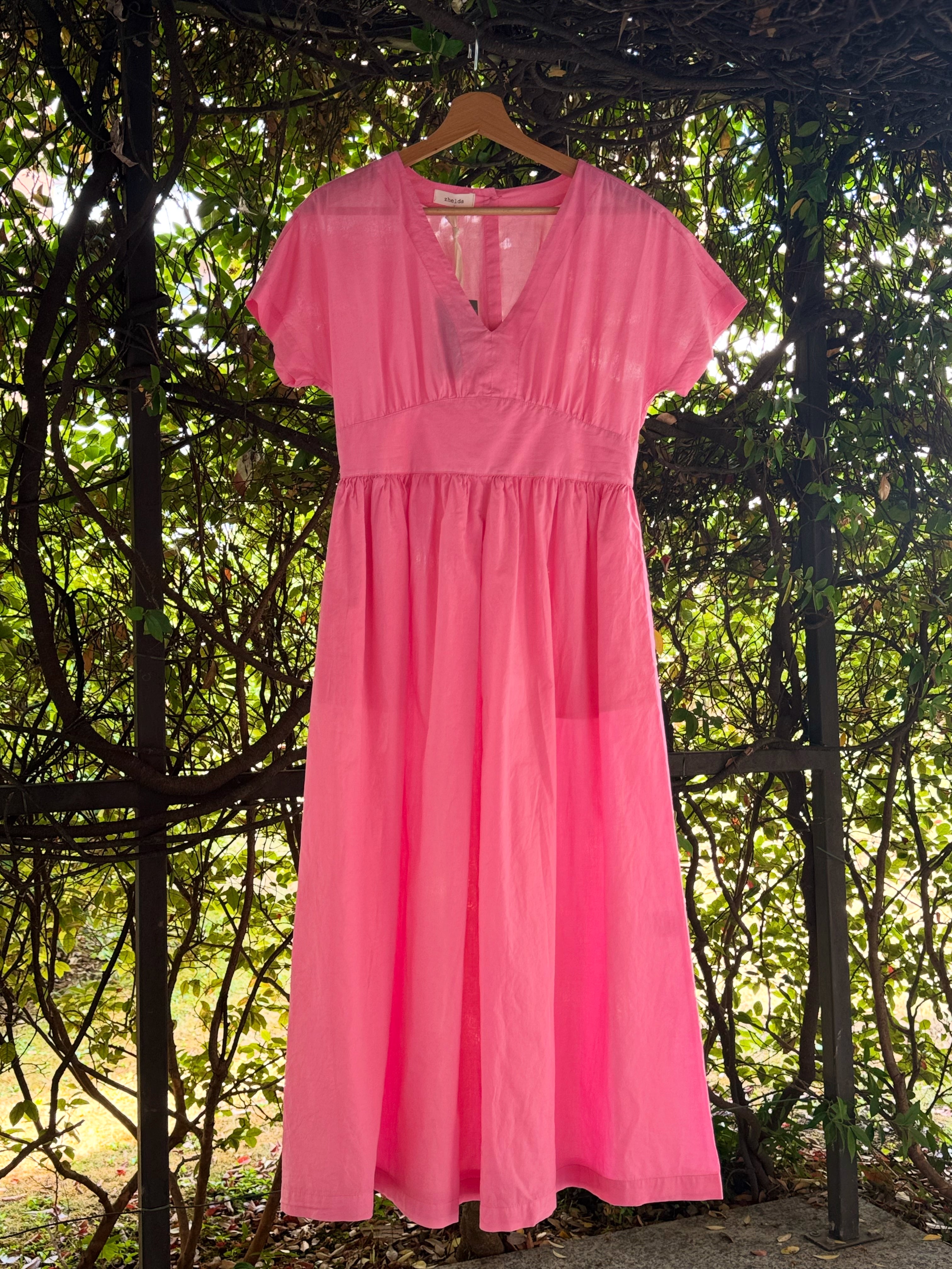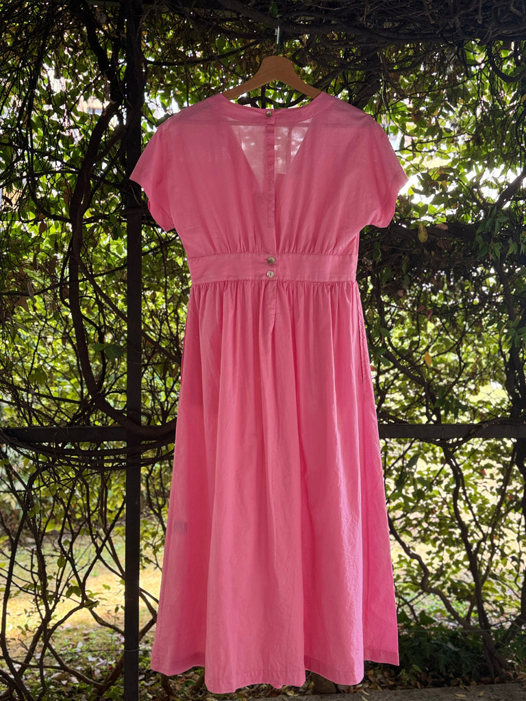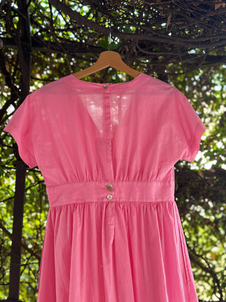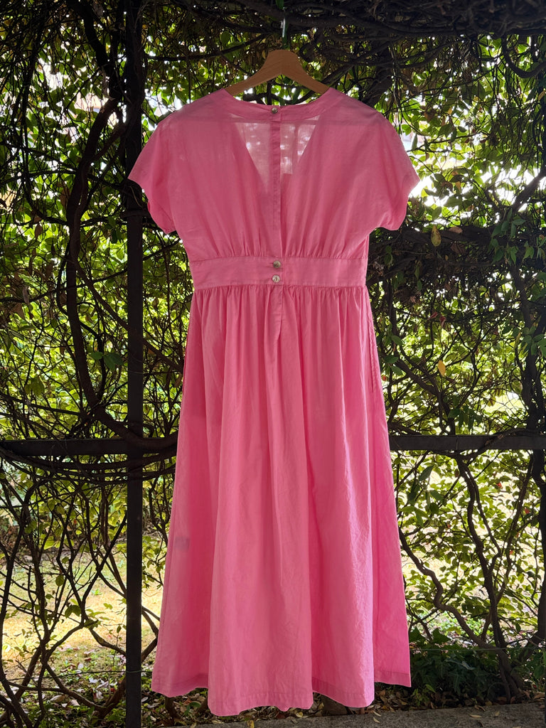 Abito svasato in popeline leggero estivo con piccola manica scesa, allacciatura doppia sulla schiena, tasche laterali. Made in Italy