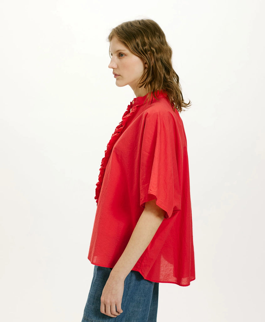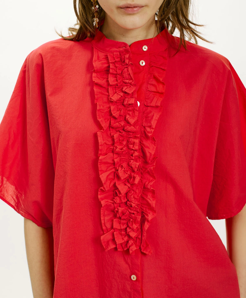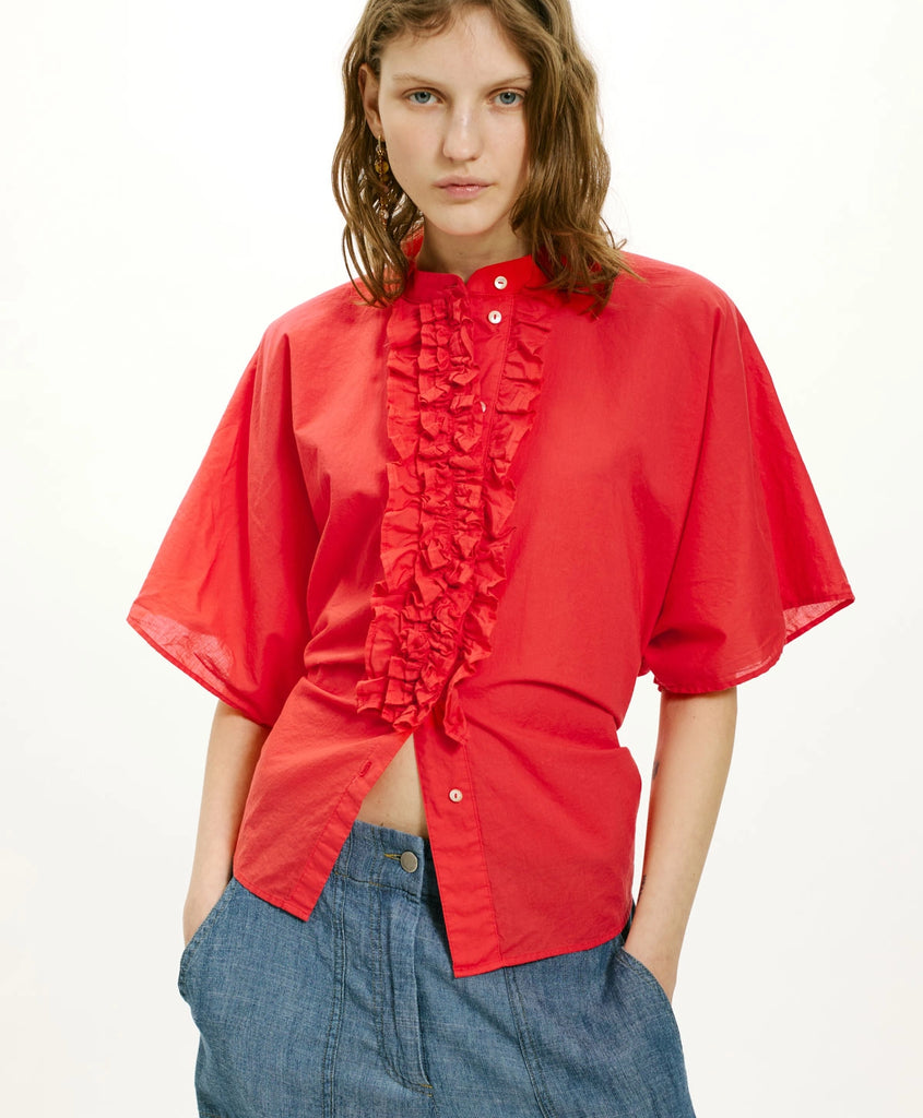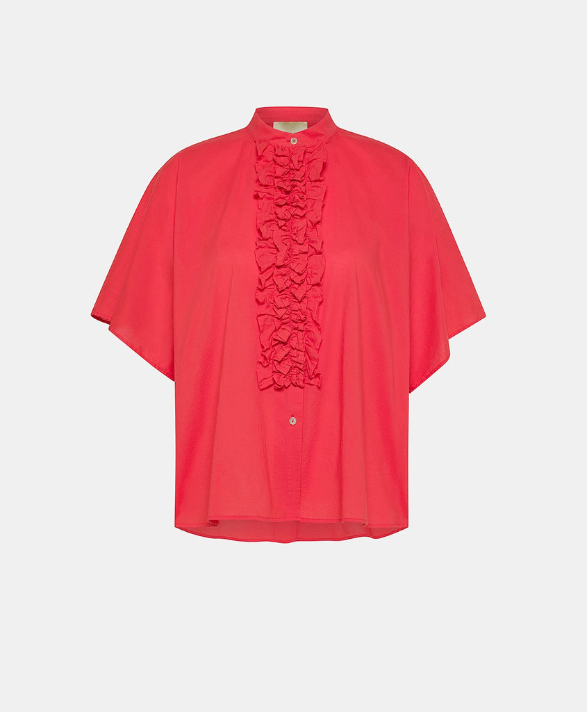 Camicia in cotone con linea oversize enfatizzata da ampie maniche corte a kimono. Abbottonatura a vista delineata da ricche rouches e colletto alla coreana