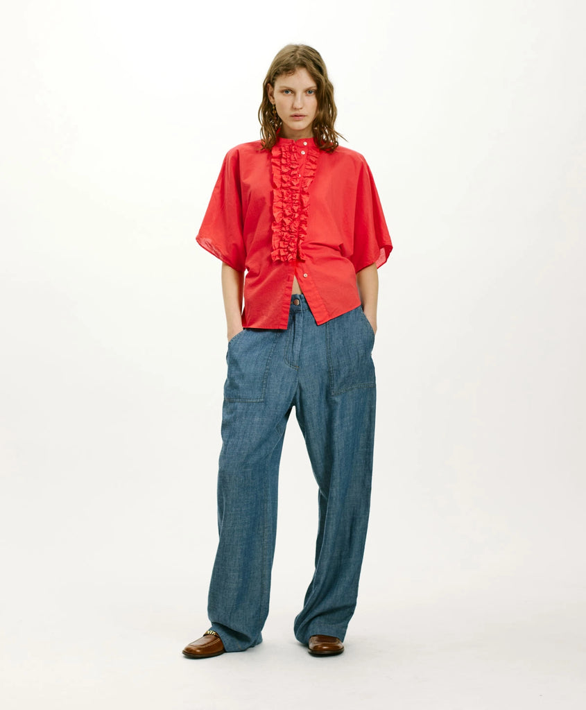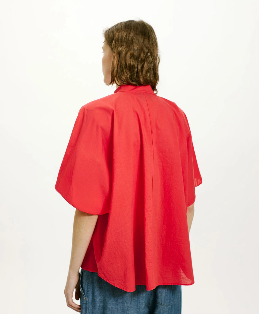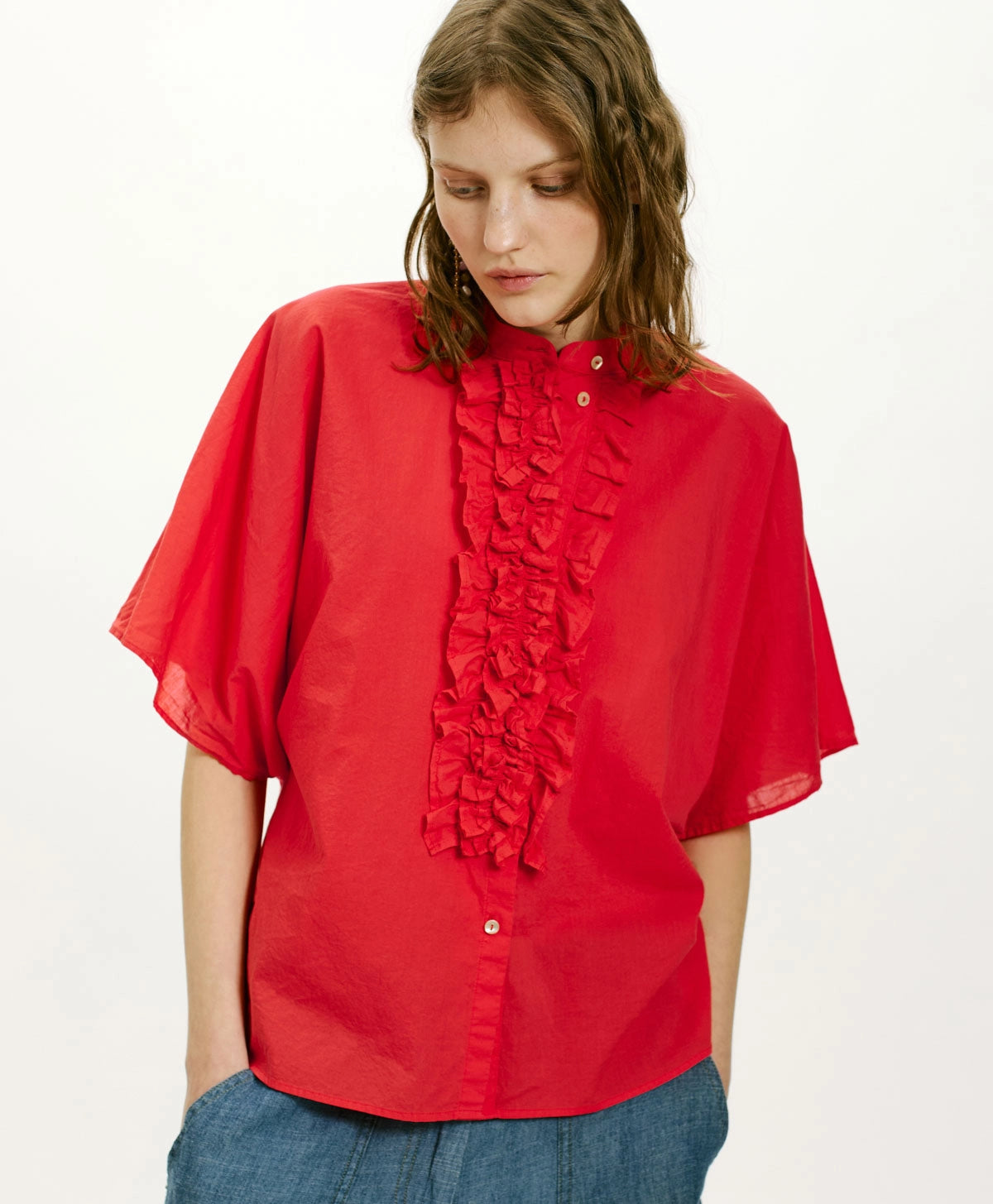 Camicia in cotone con linea oversize enfatizzata da ampie maniche corte a kimono. Abbottonatura a vista delineata da ricche rouches e colletto alla coreana