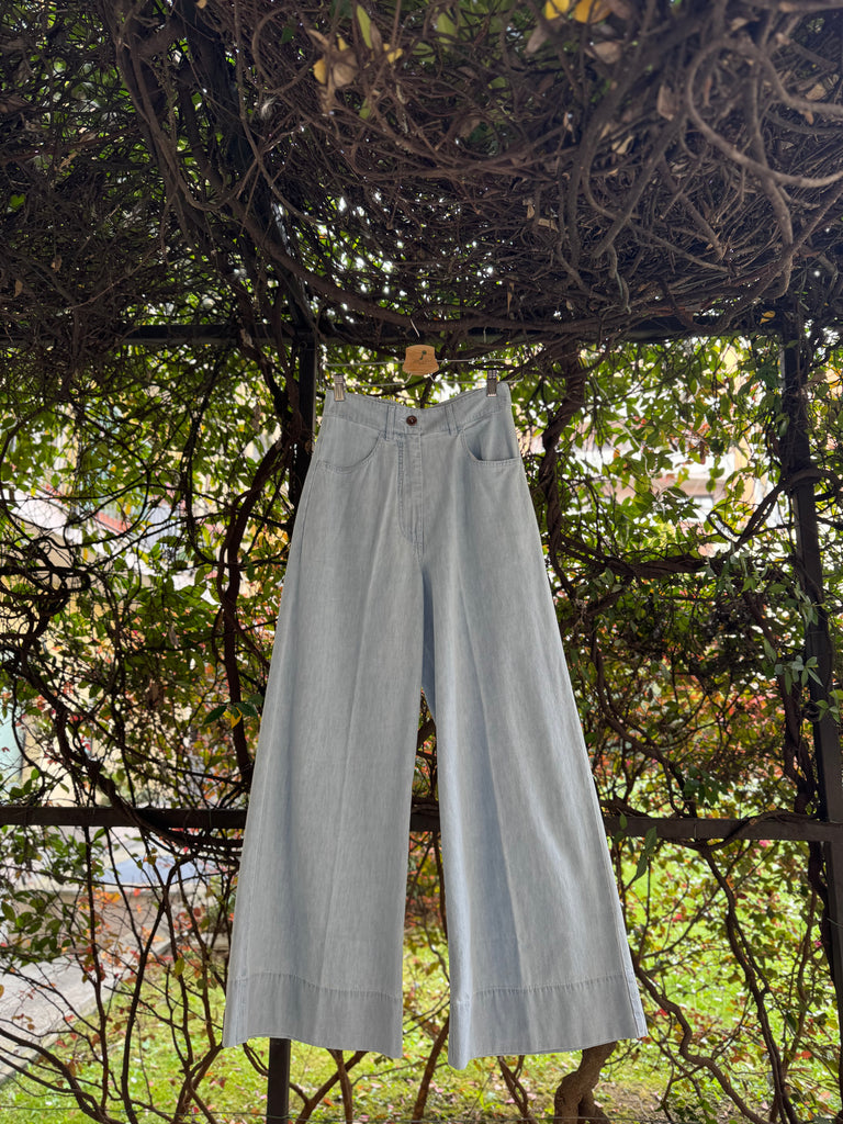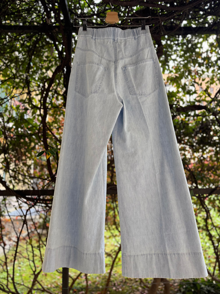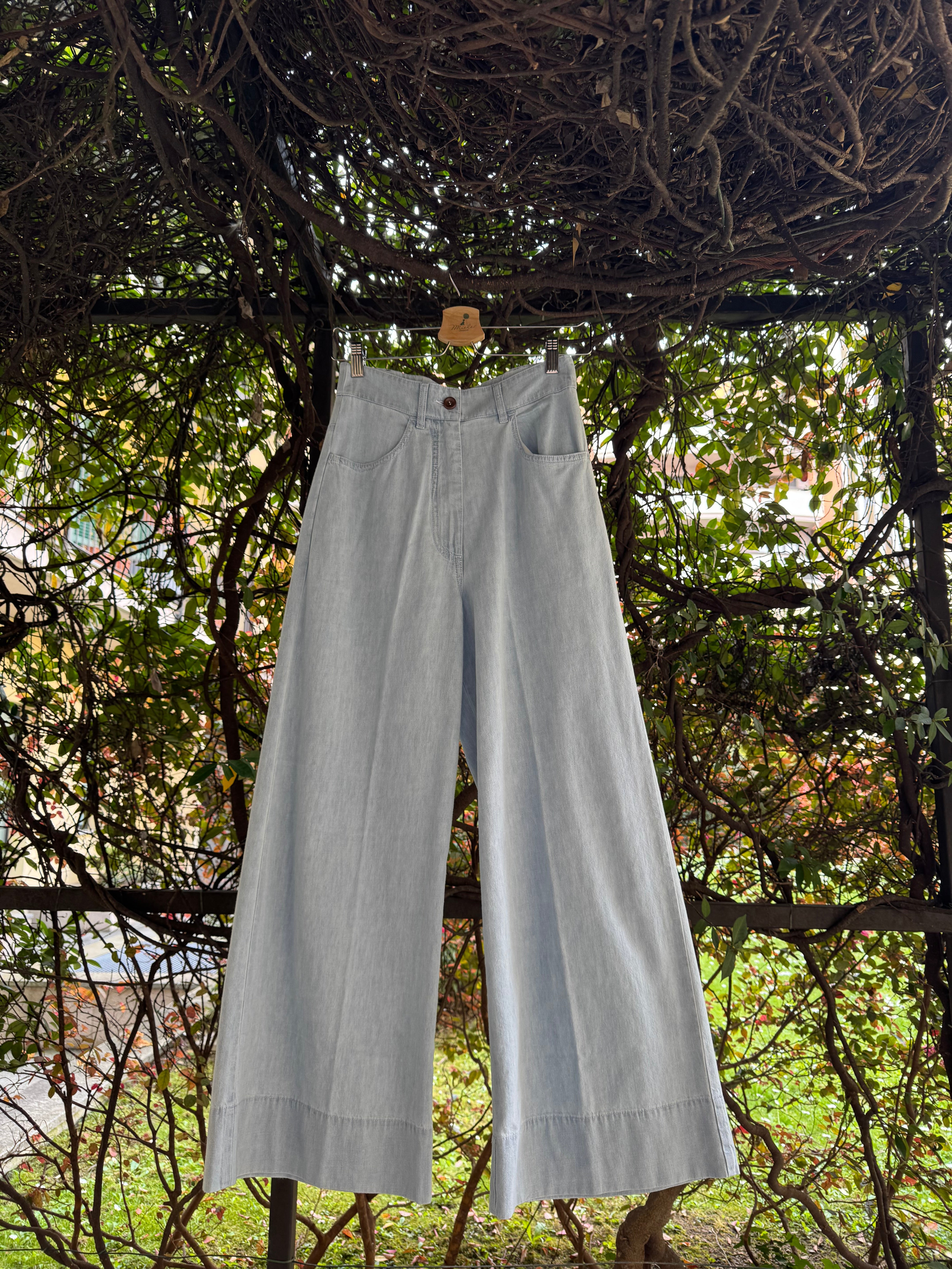 Denim chiaro a vita alta, in cotone leggero, modello cinque tasche con gamba molto ampia svasata sul fondo, veste in modo regolare, elastico nel bordo solo dietro. Vestibilità non piccola. Made in Italy