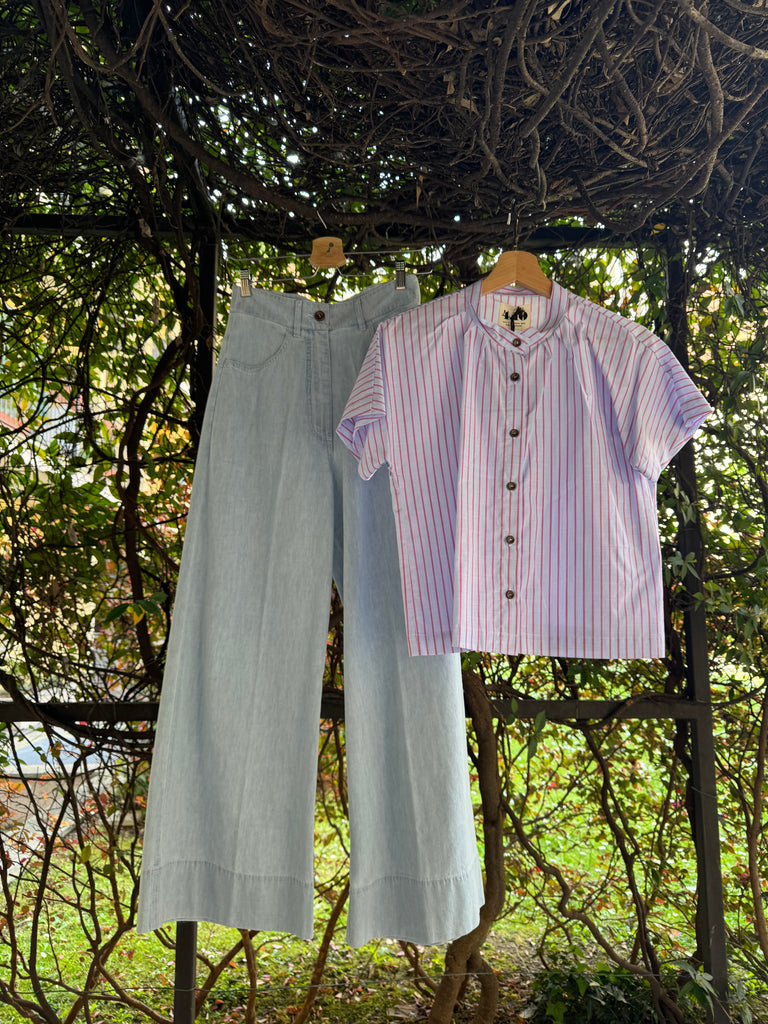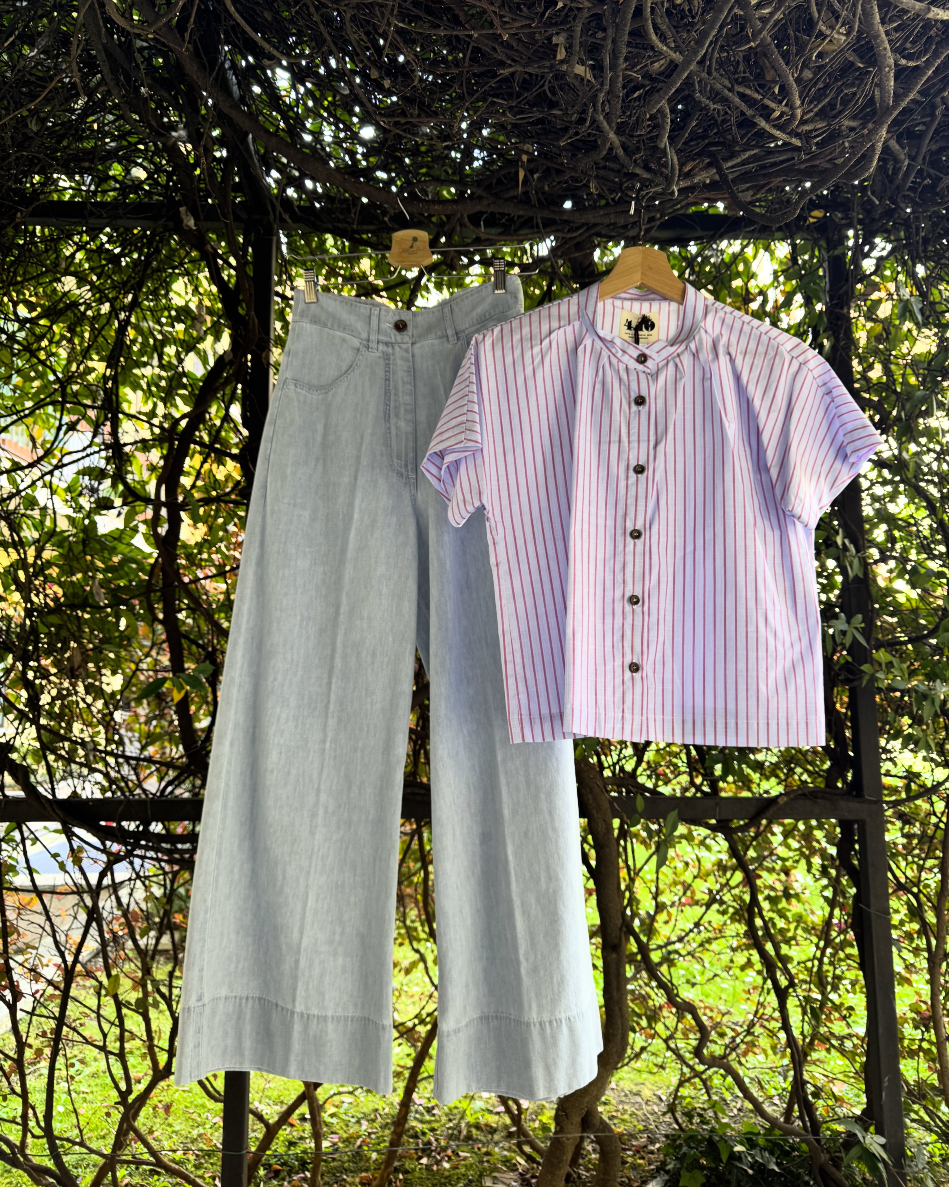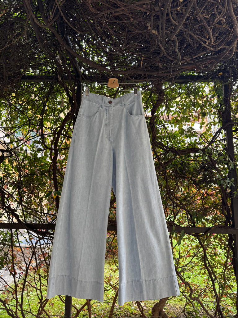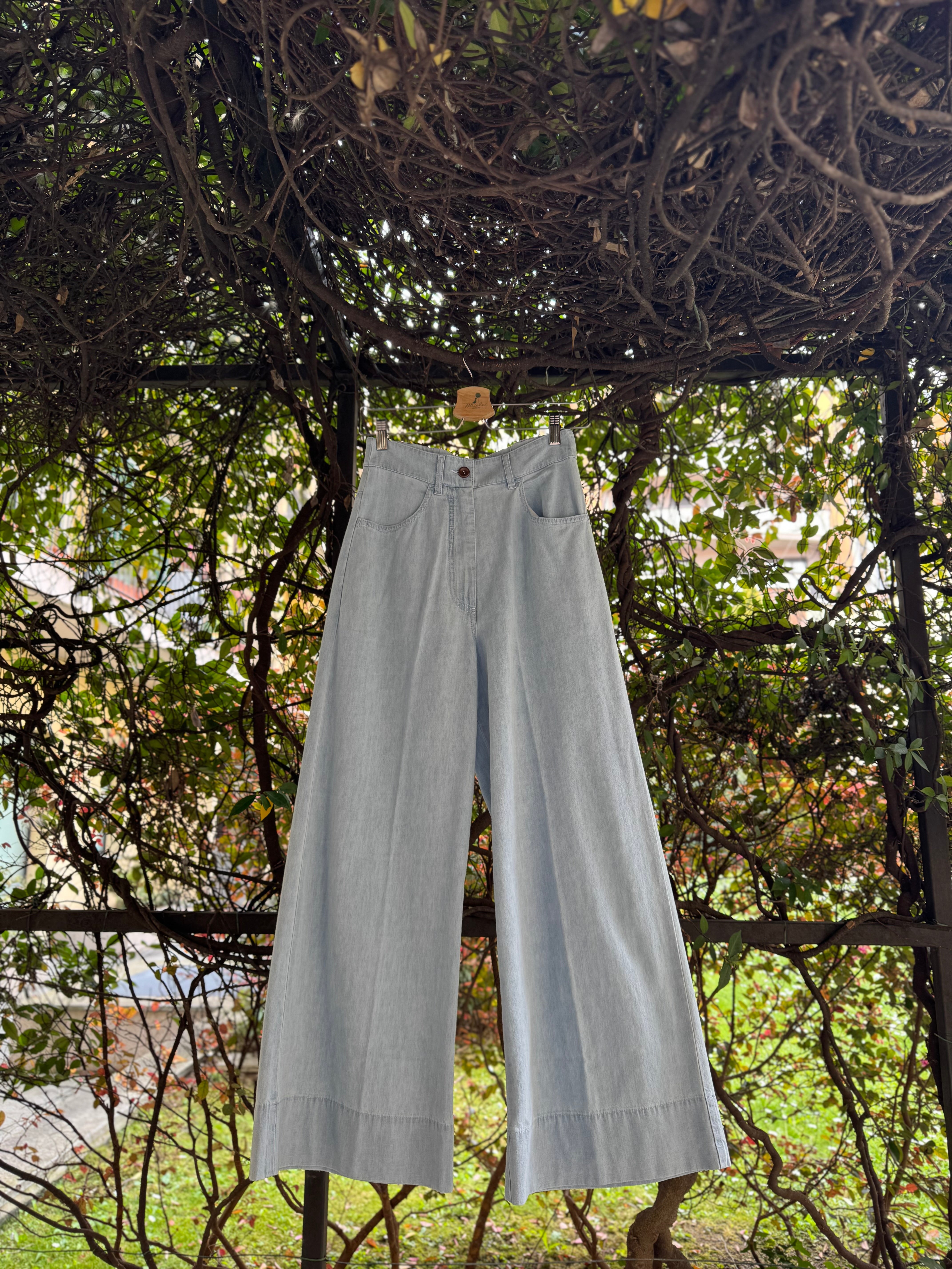 Denim chiaro a vita alta, in cotone leggero, modello cinque tasche con gamba molto ampia svasata sul fondo, veste in modo regolare, elastico nel bordo solo dietro. Vestibilità non piccola. Made in Italy