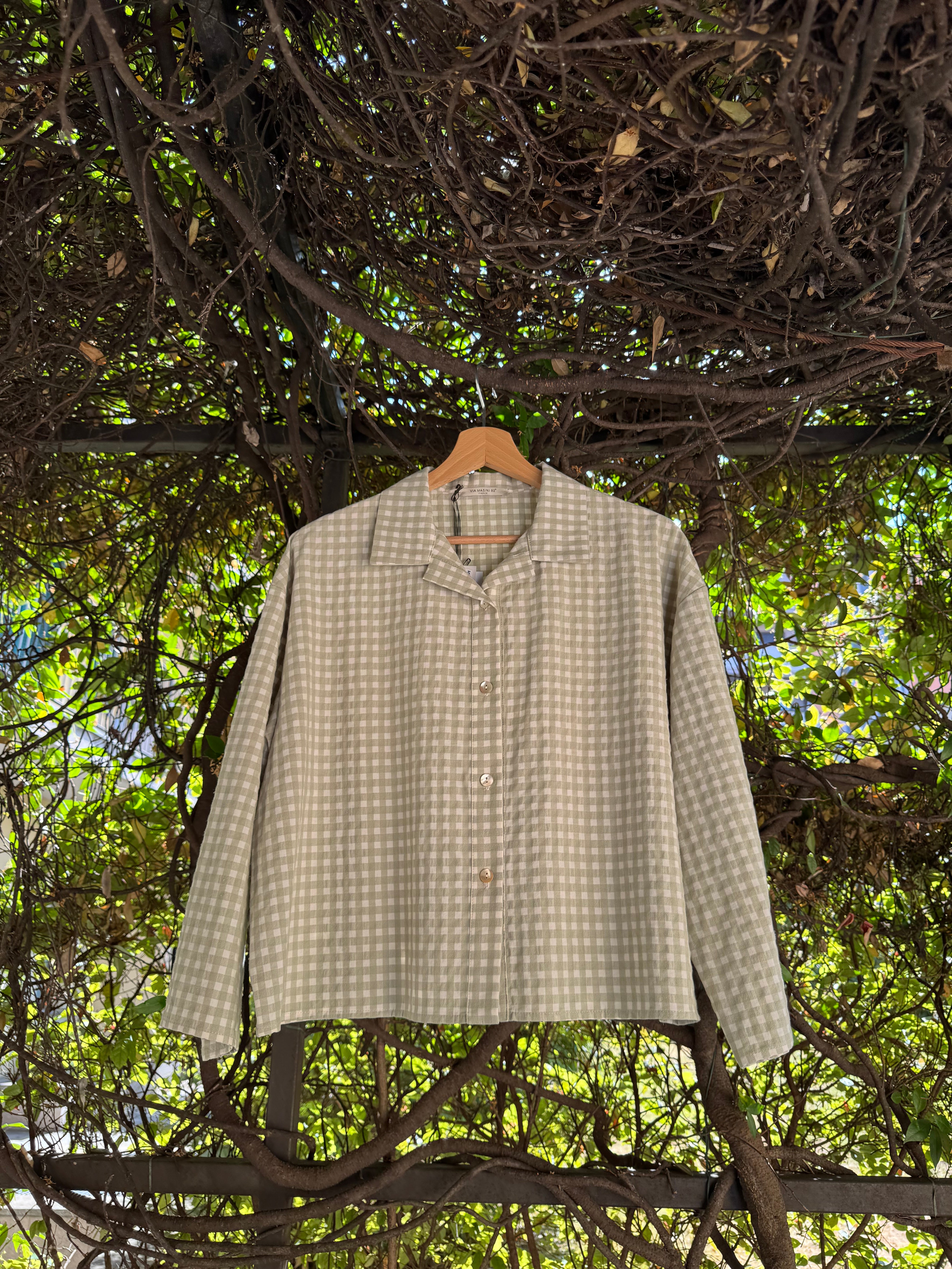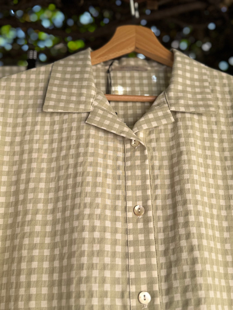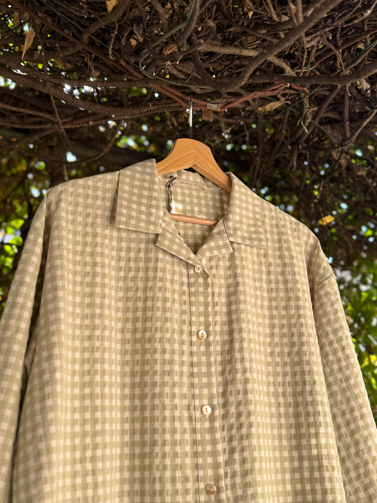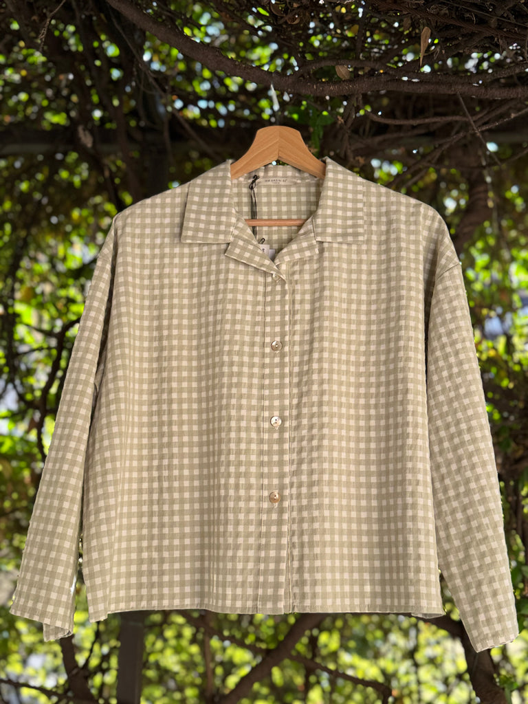 Giacca camicia.ampia, taglio a scatoletta, in cotone vichy a quadretti verde salvia e panna, con bottoncini a vista. Made in Italy