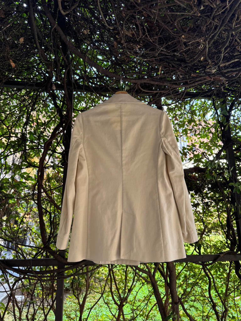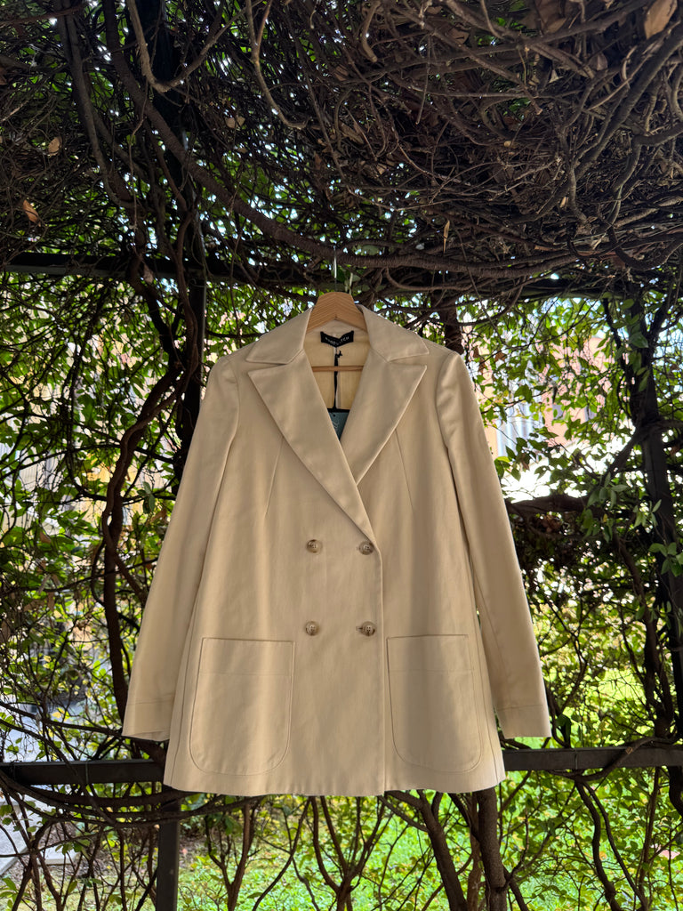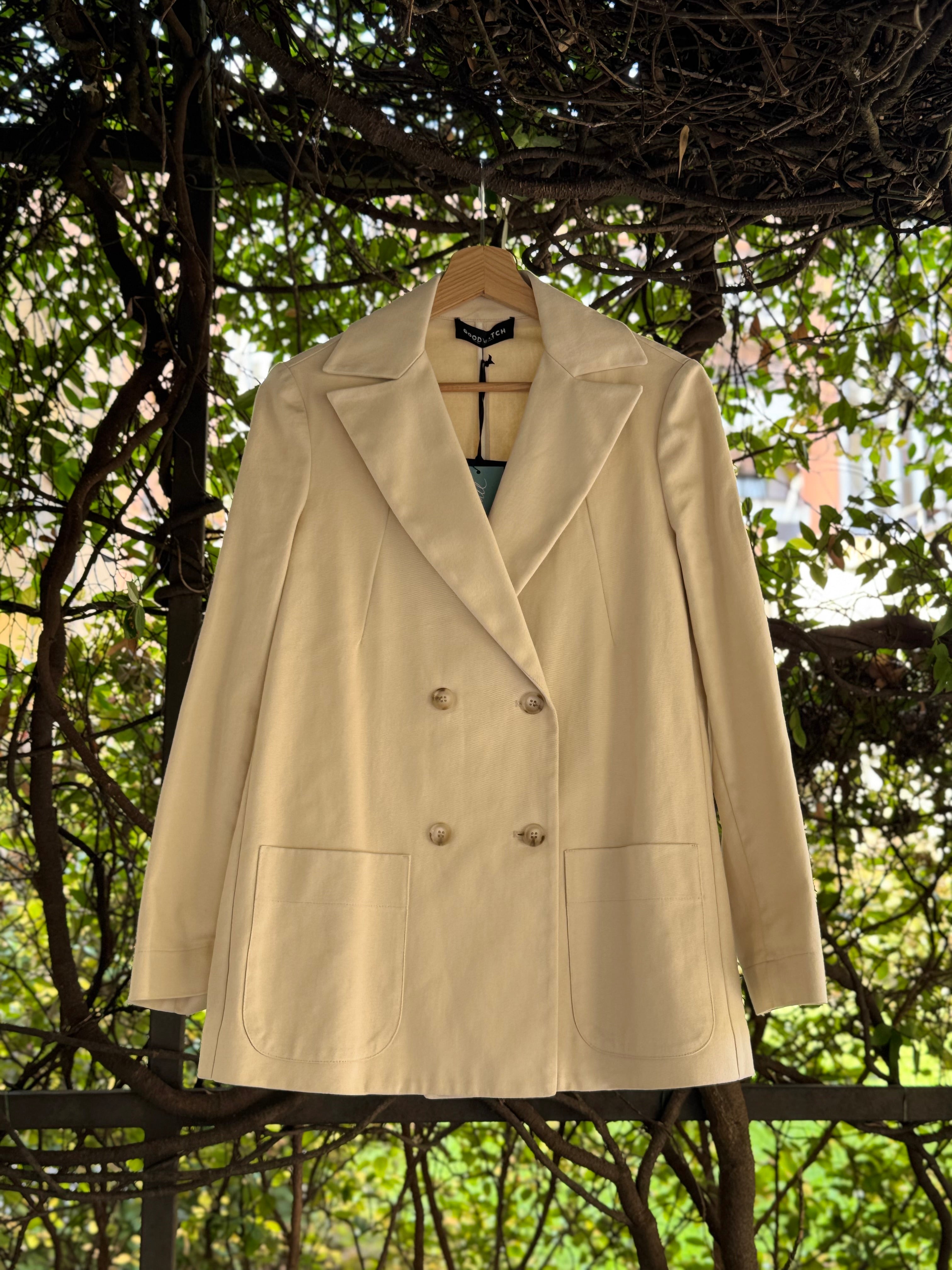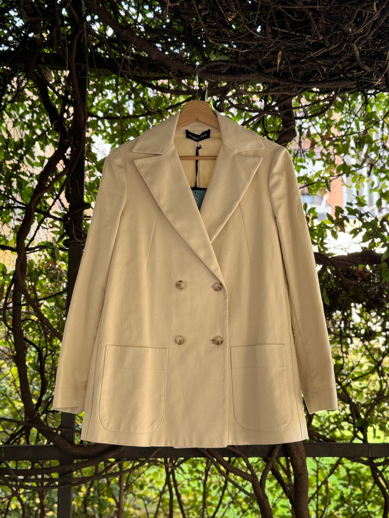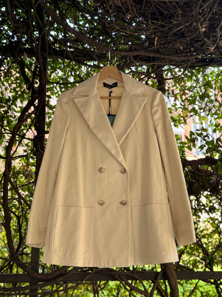 Giacca peacoat doppiopetto in cotone pesante panna, taglio leggermente svasato, spacco sul dietro, ampie tasche applicate. Made in Italy