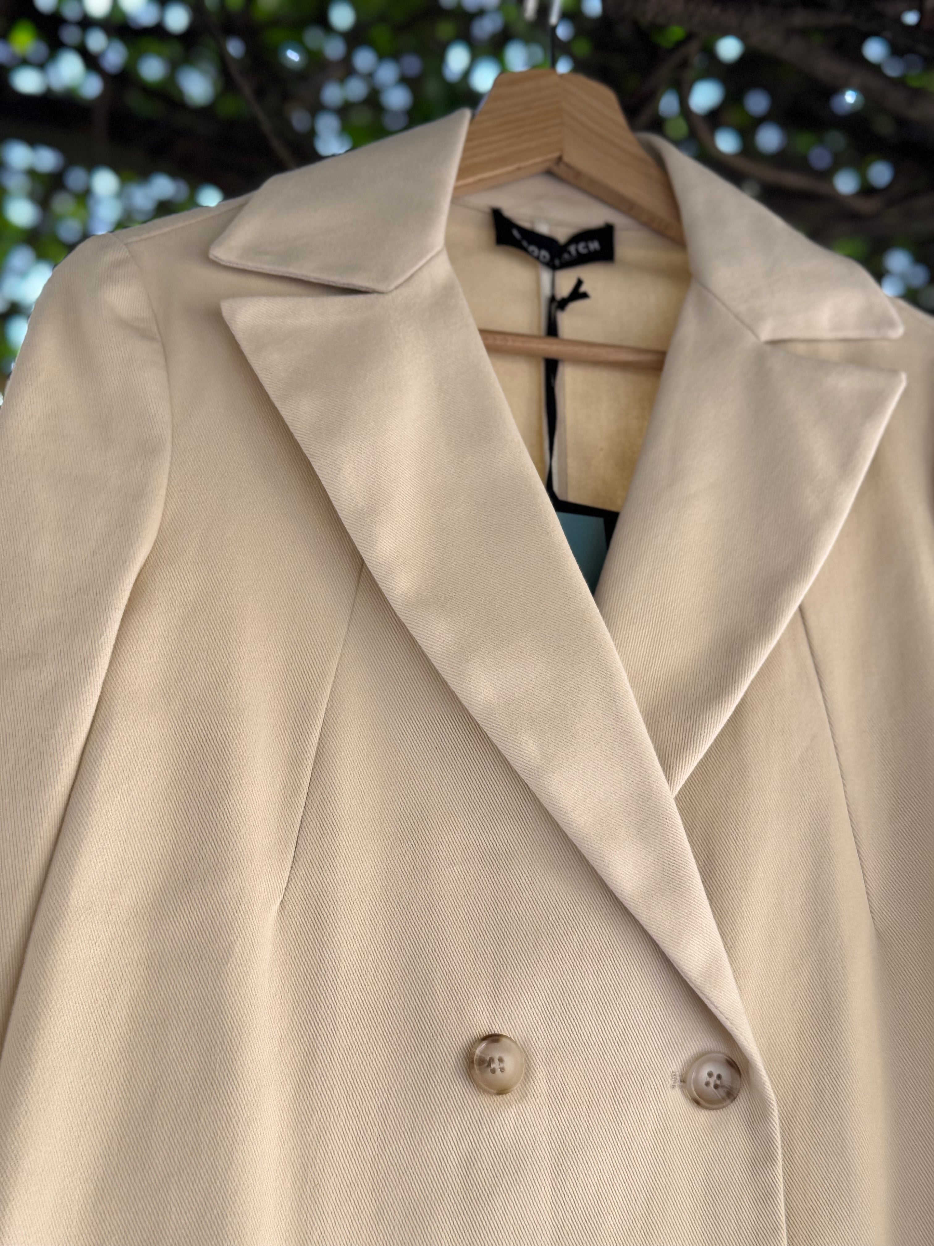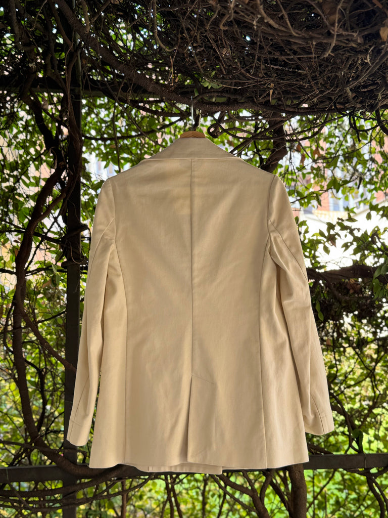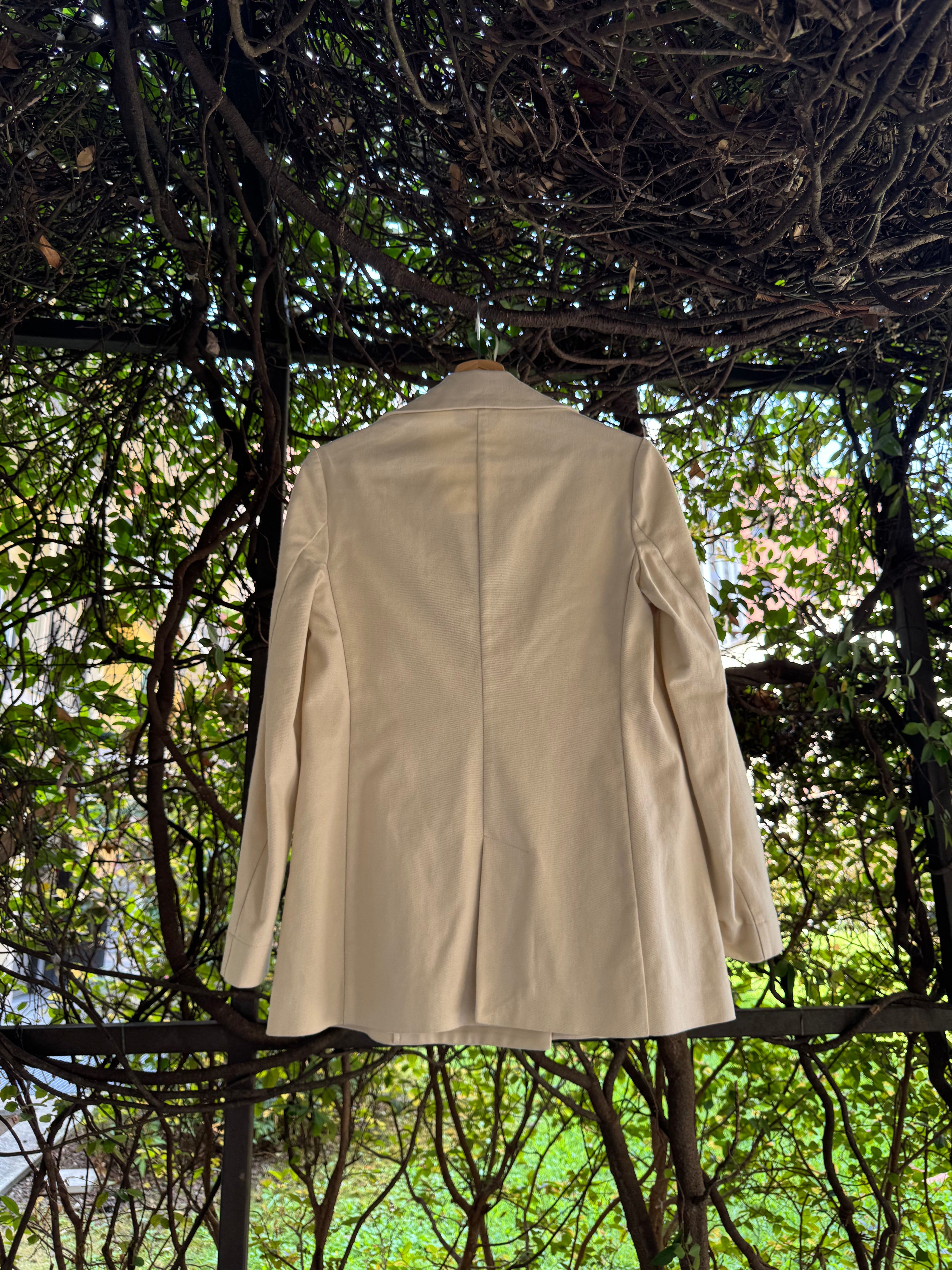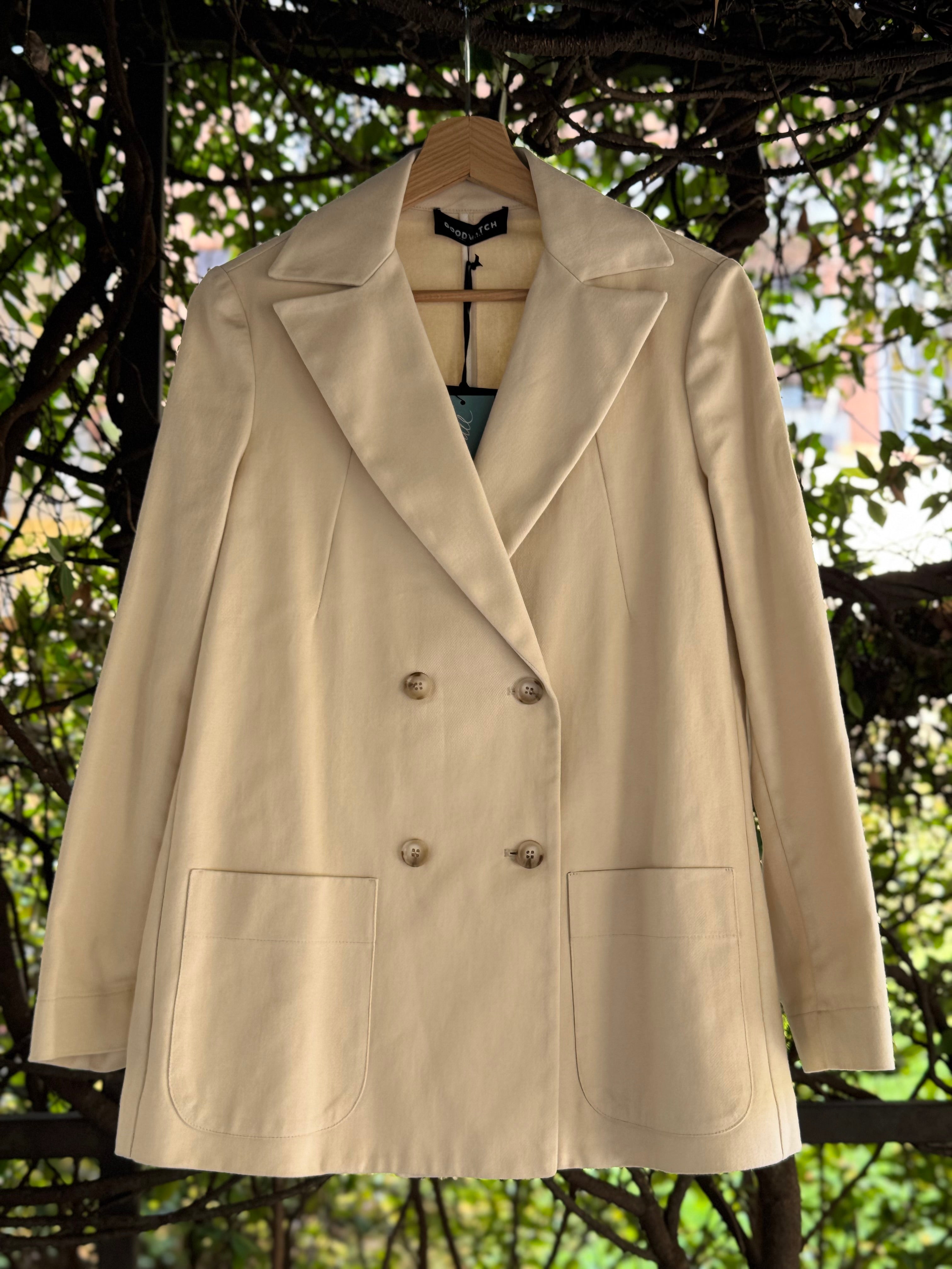 Giacca peacoat doppiopetto in cotone pesante panna, taglio leggermente svasato, spacco sul dietro, ampie tasche applicate. Made in Italy