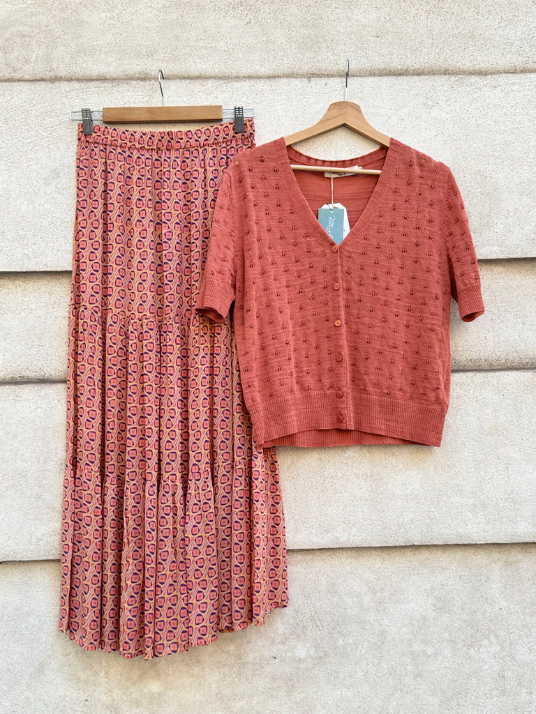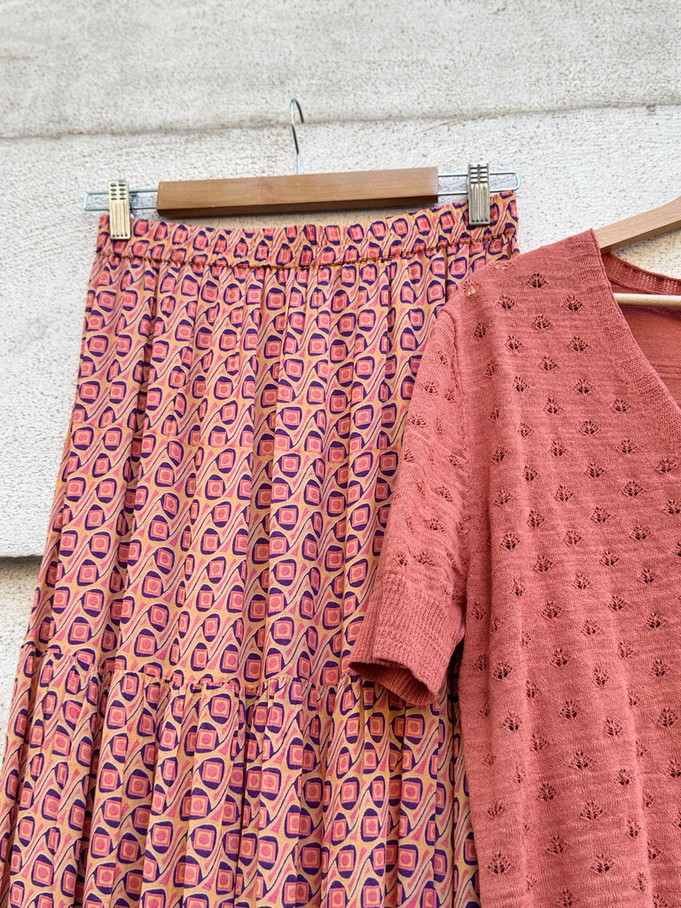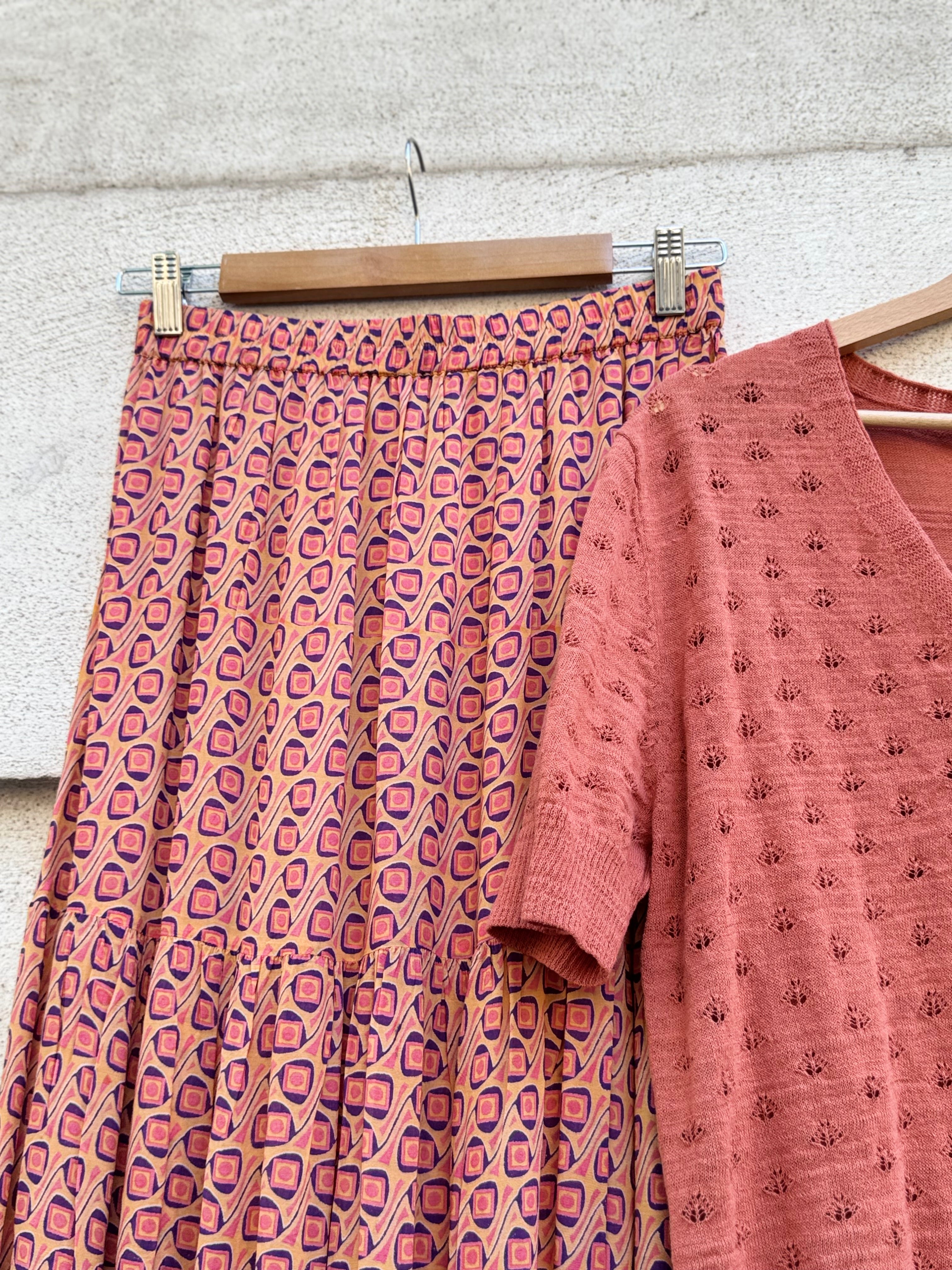 Gonna lunga in tessuto di cotone leggero stampato, con balze, foderata con elastico in vita
