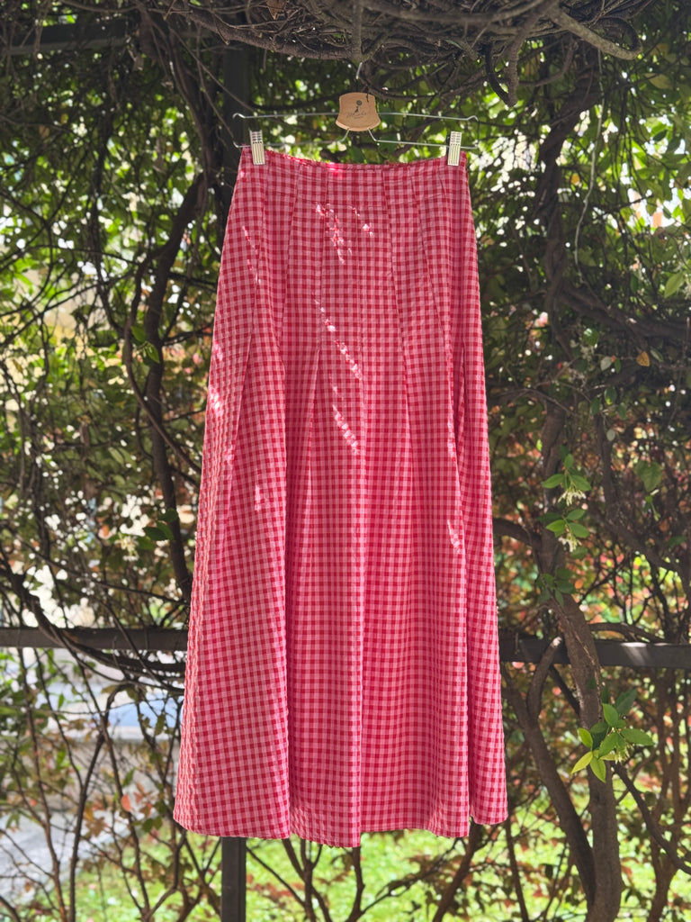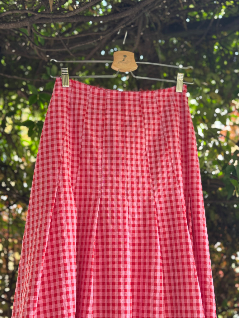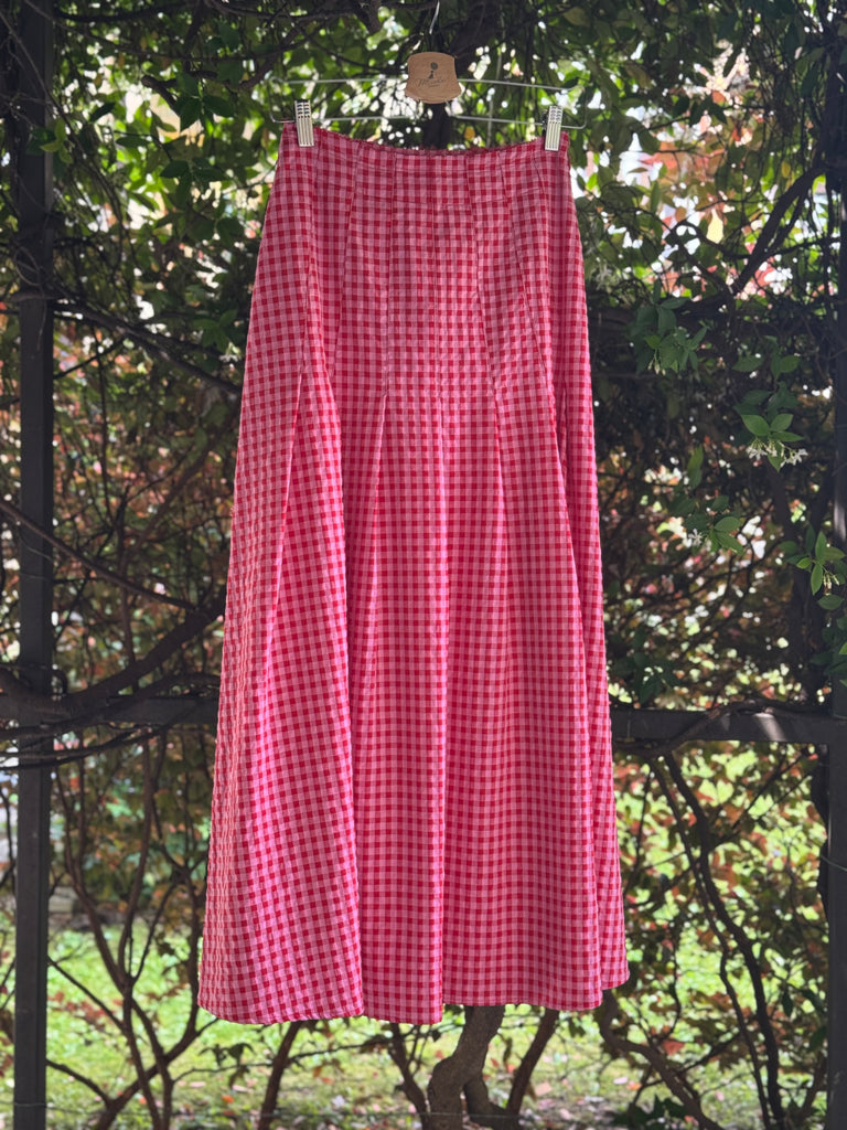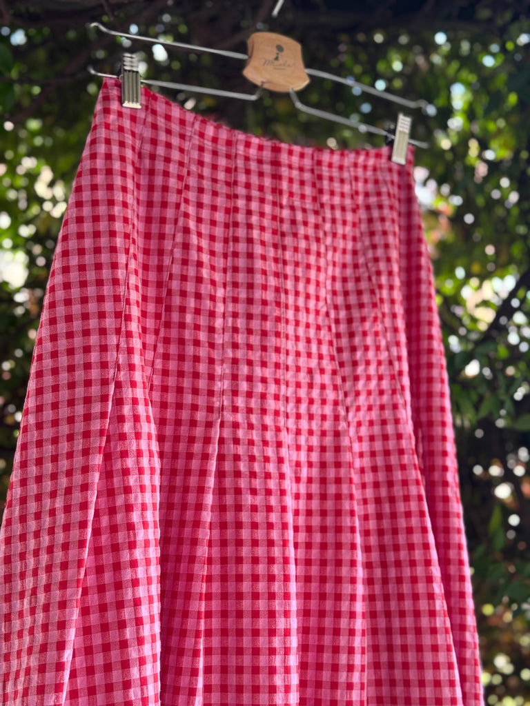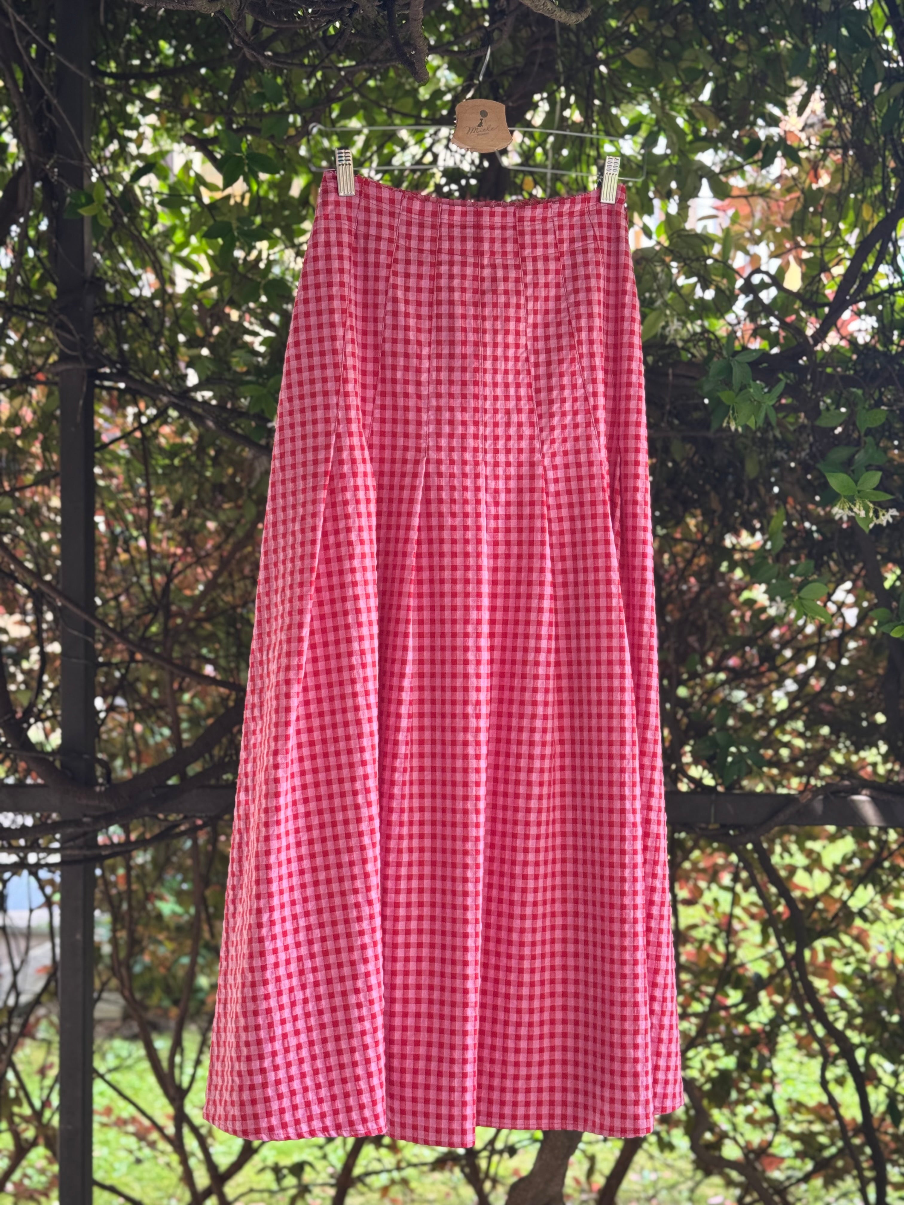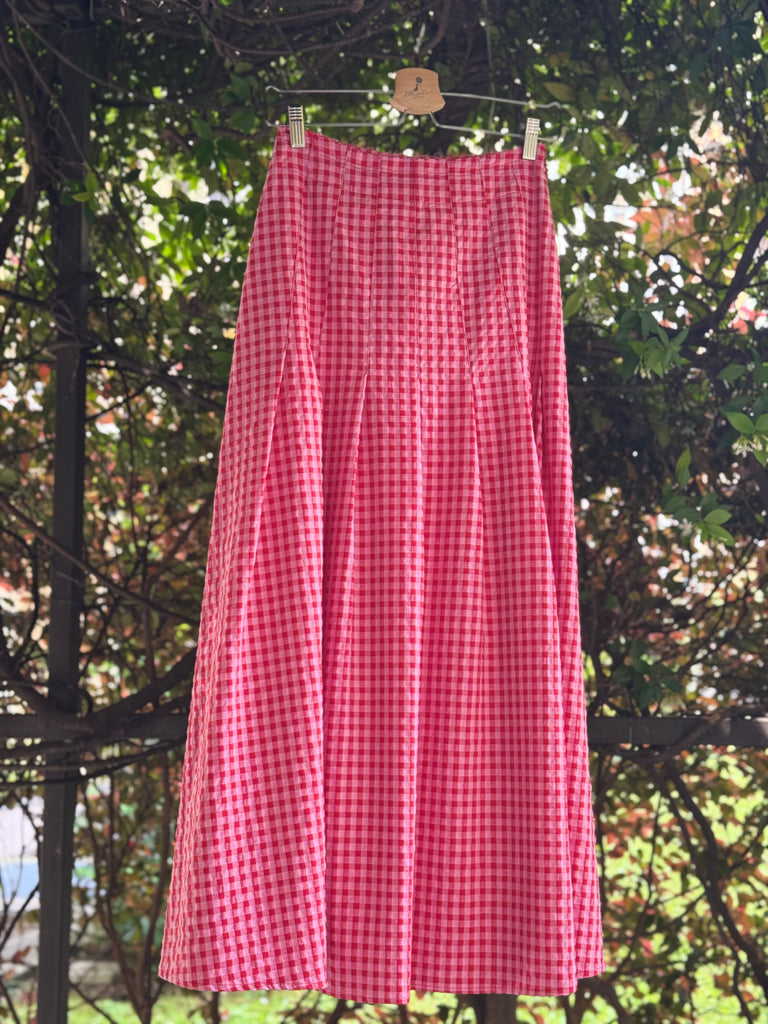 Gonna lunga con piegoni ampi piatti, in cotone quadretti rosa e rosso, cerniera laterale. Made in Italy