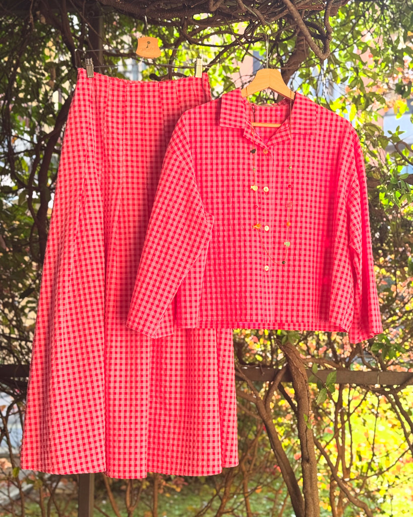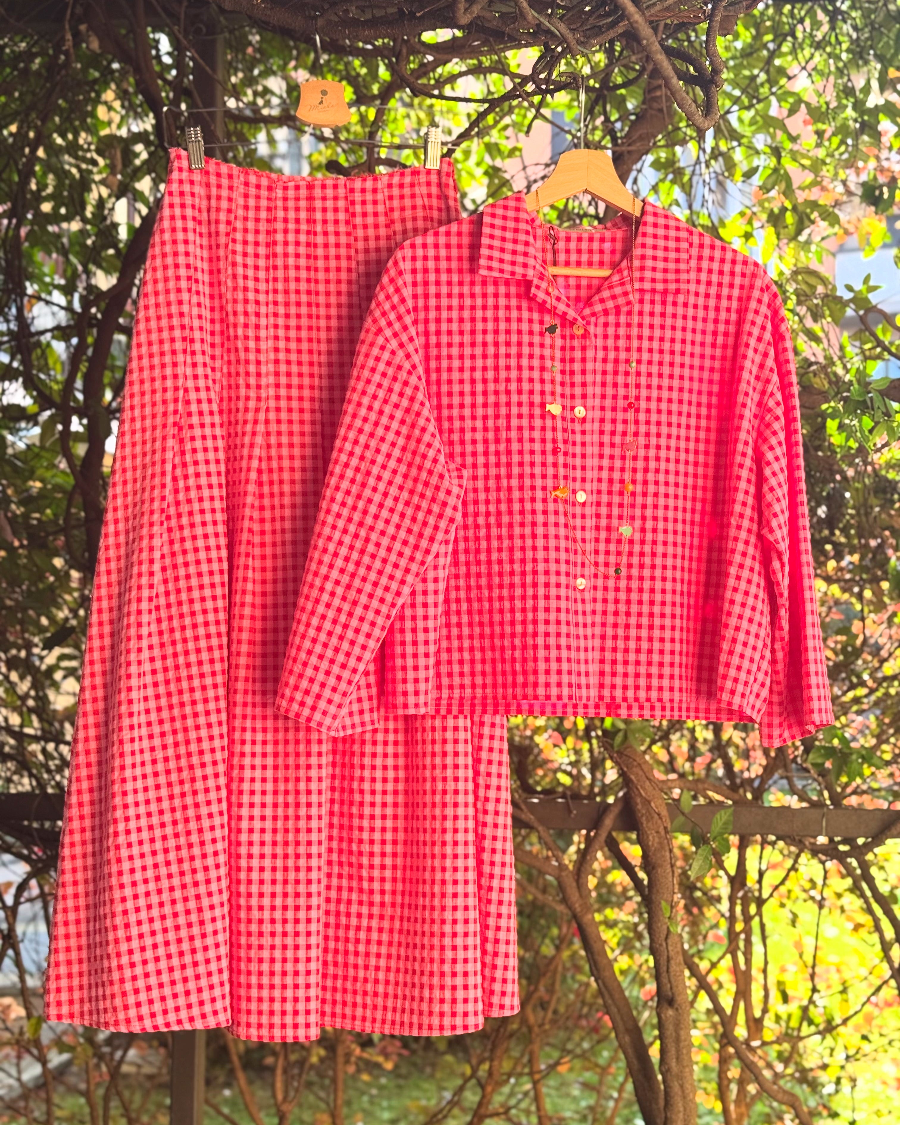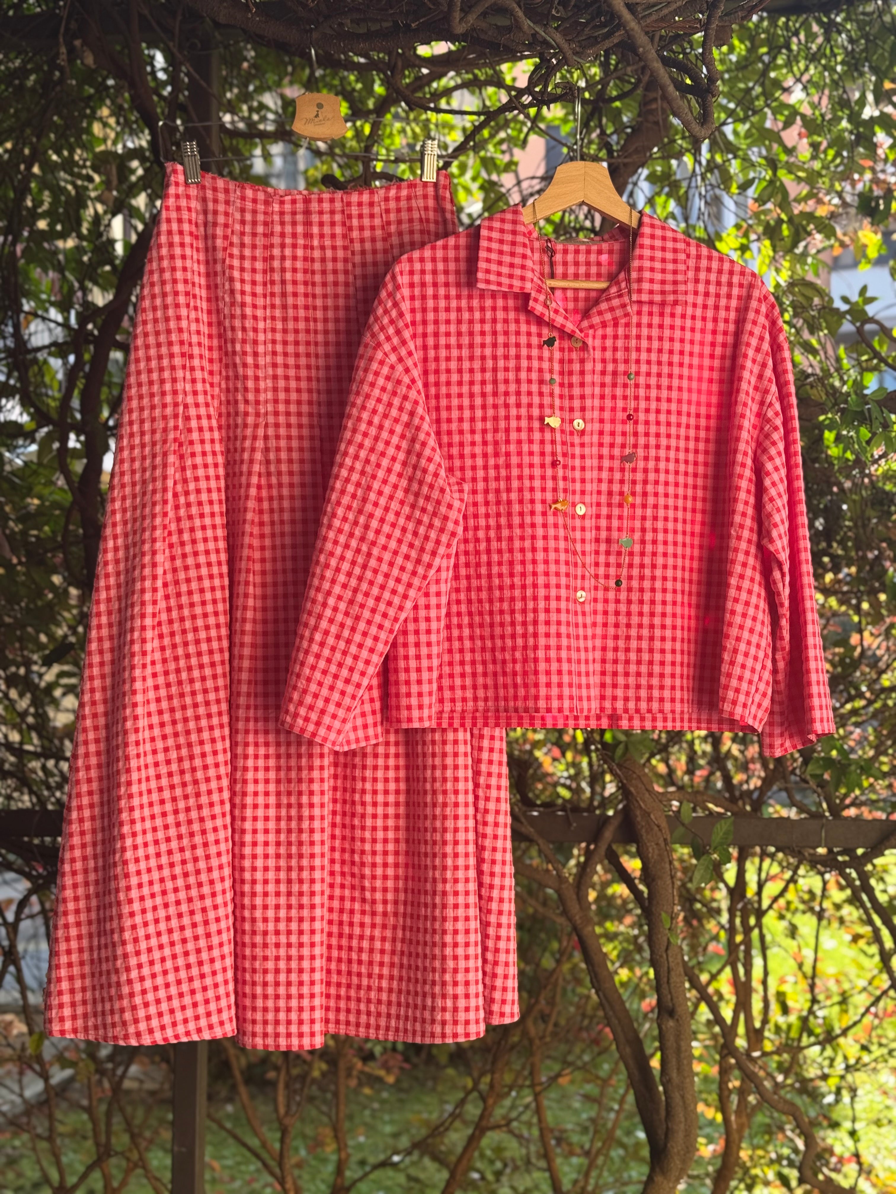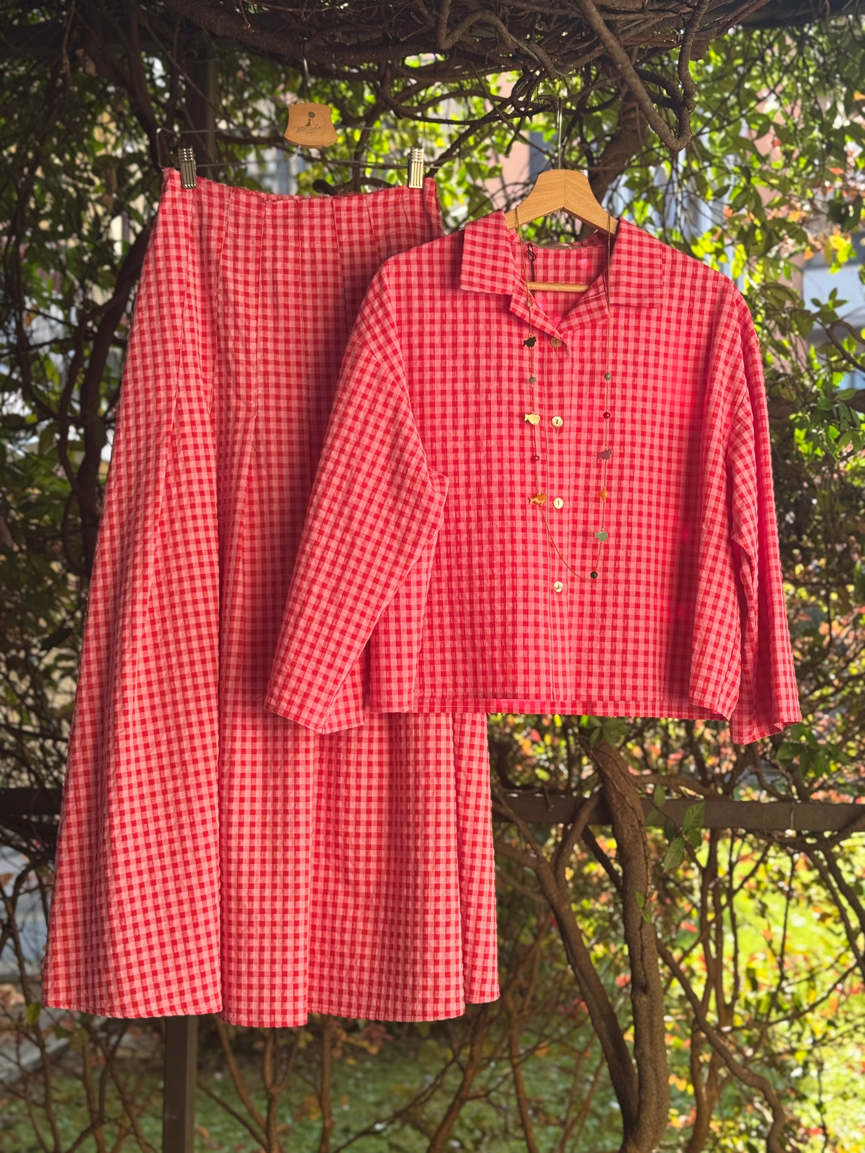 Gonna lunga con piegoni ampi piatti, in cotone quadretti rosa e rosso, cerniera laterale. Made in Italy