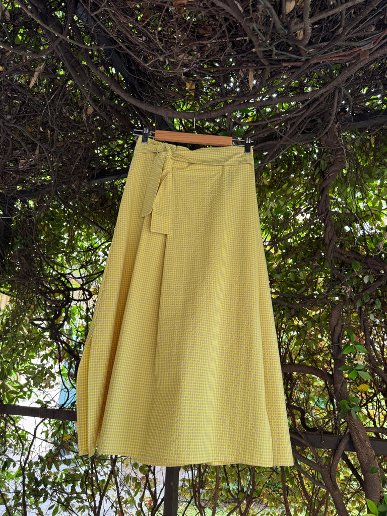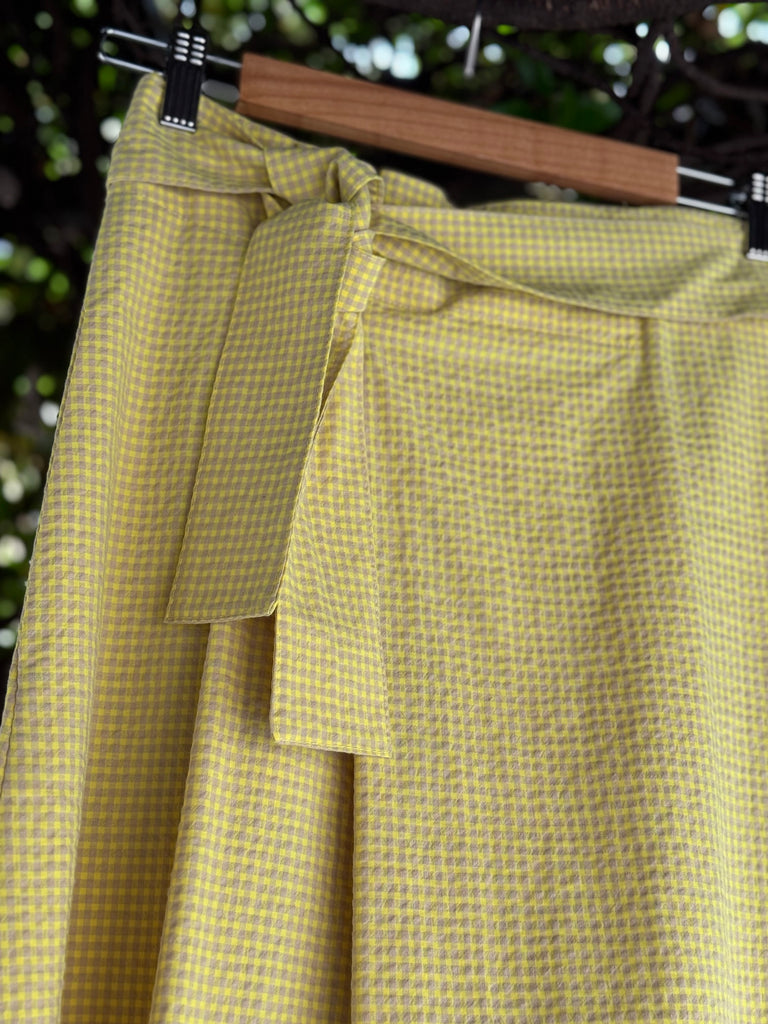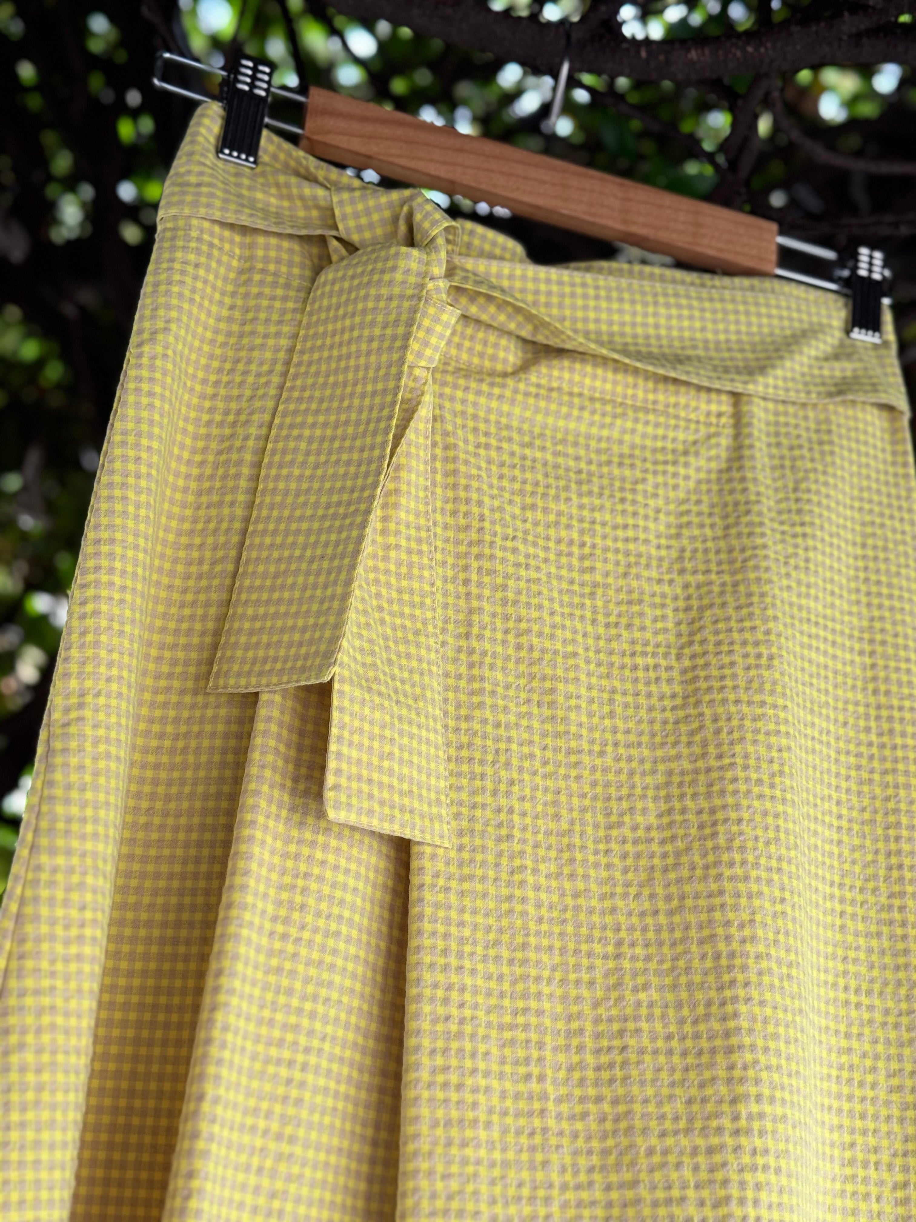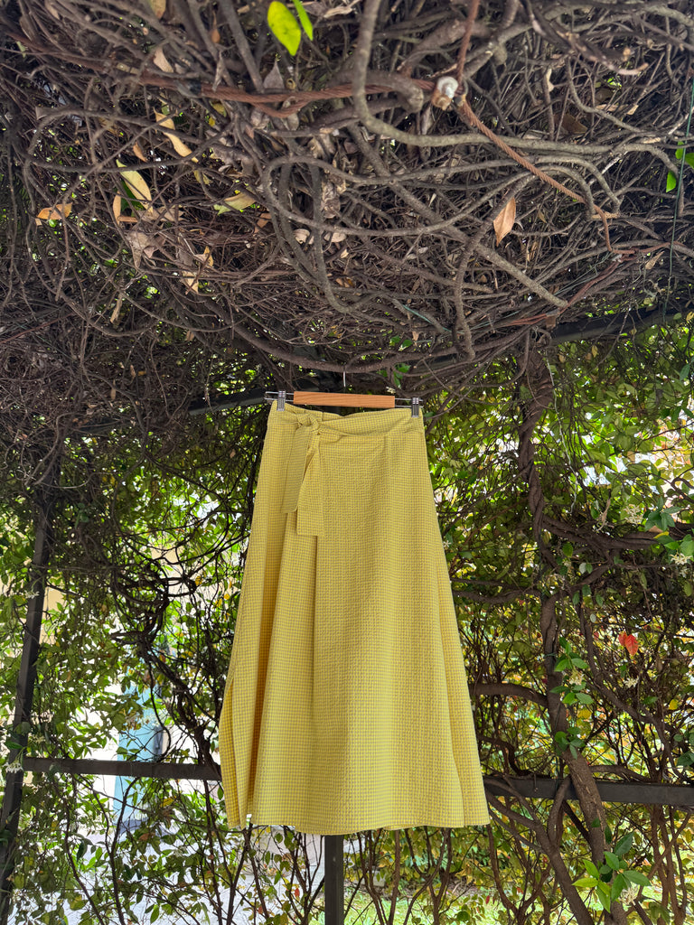 Gonna lunghezza Midi a portafoglio in tessuto di cotone a micro quadretti in rilievo giallo sole e sabbia, con piegoni ampi piatti e fusciacca in vita.  Made in Italy