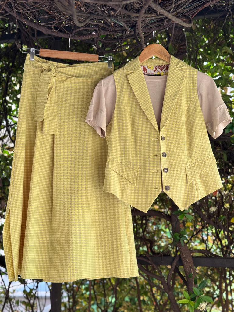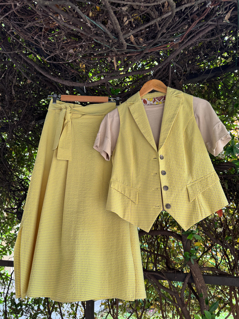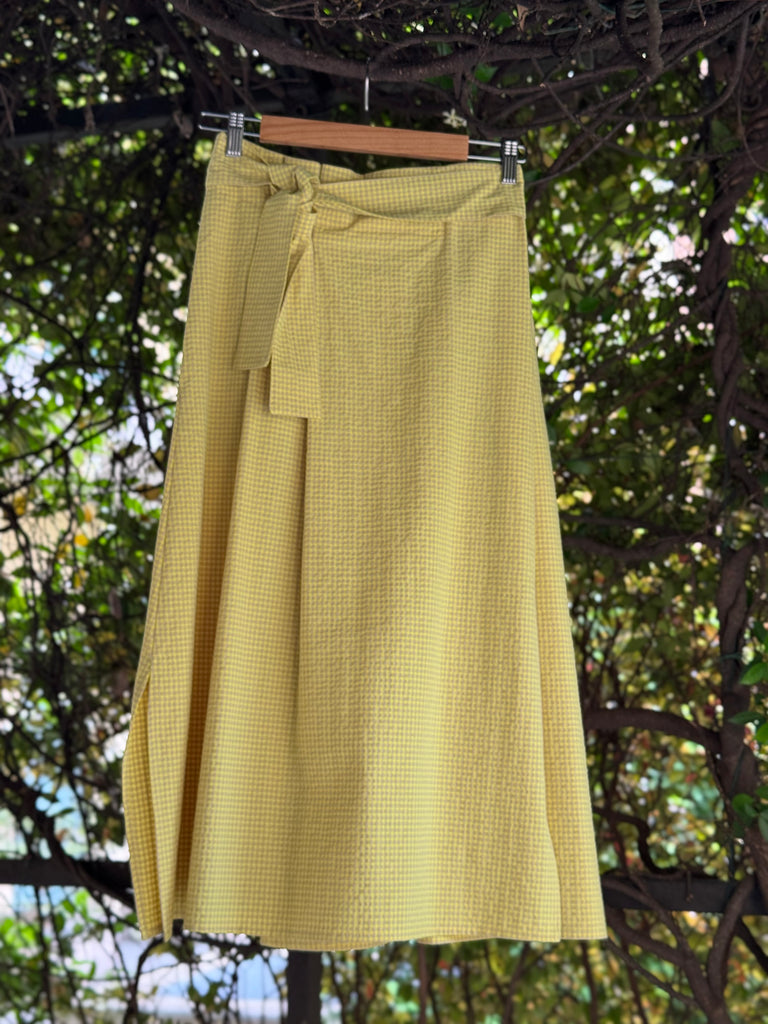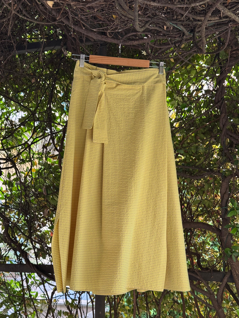 Gonna lunghezza Midi a portafoglio in tessuto di cotone a micro quadretti in rilievo giallo sole e sabbia, con piegoni ampi piatti e fusciacca in vita.  Made in Italy