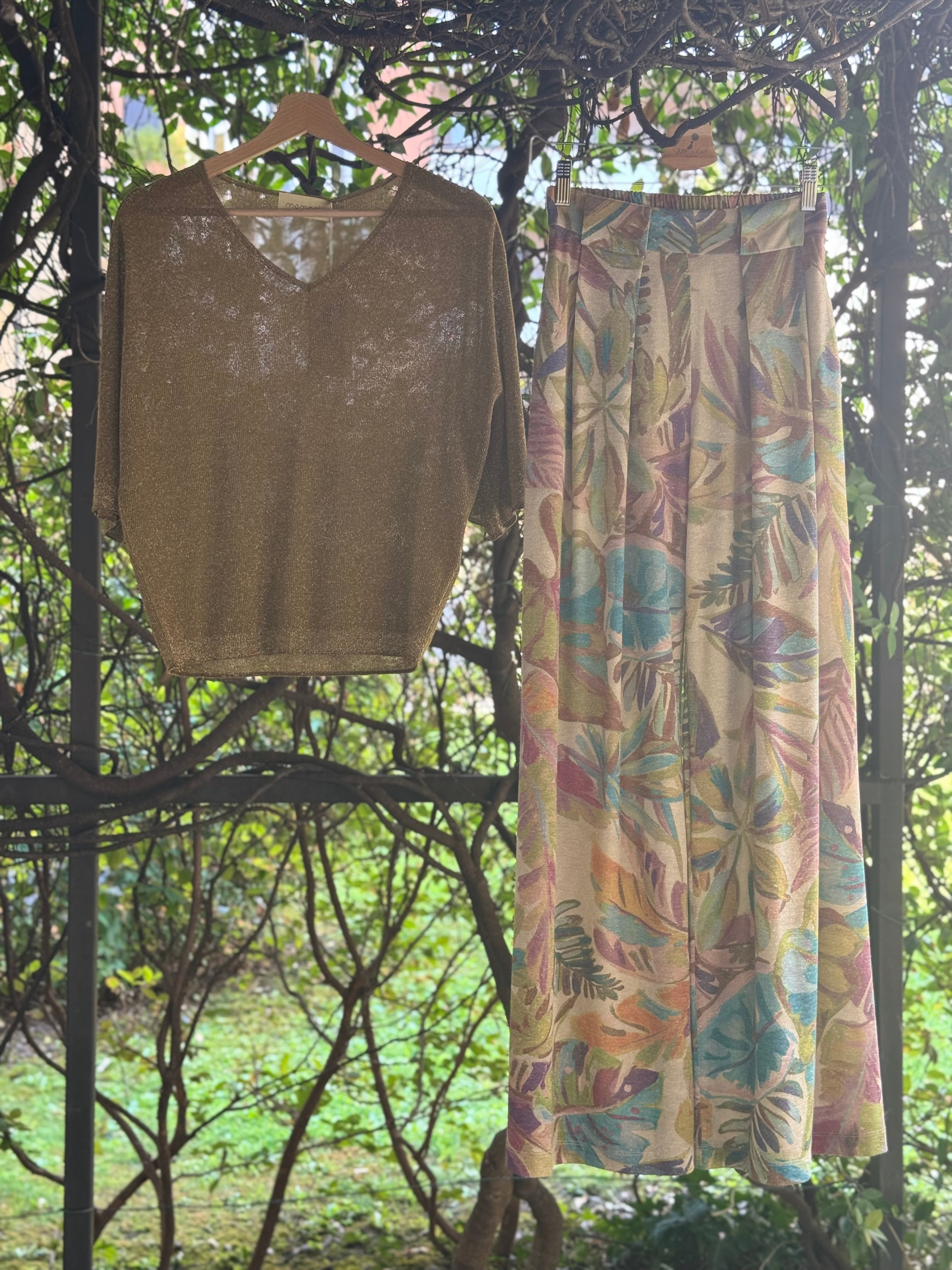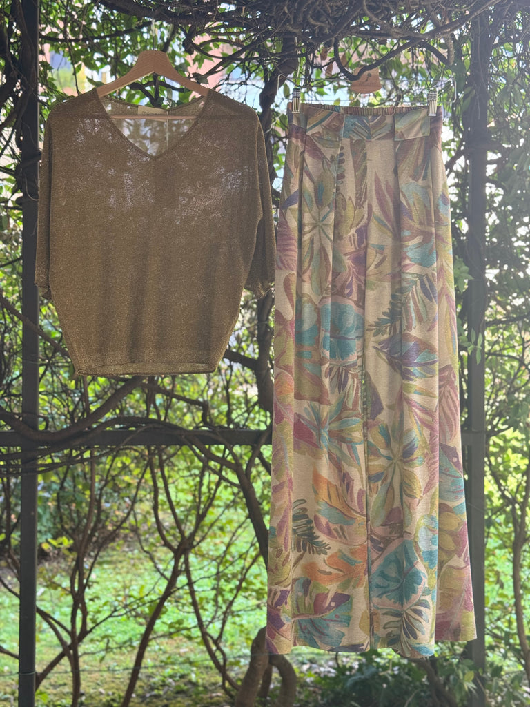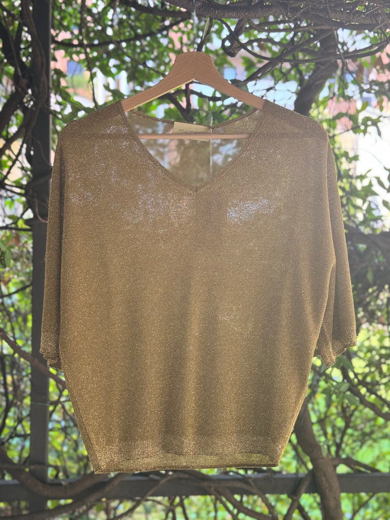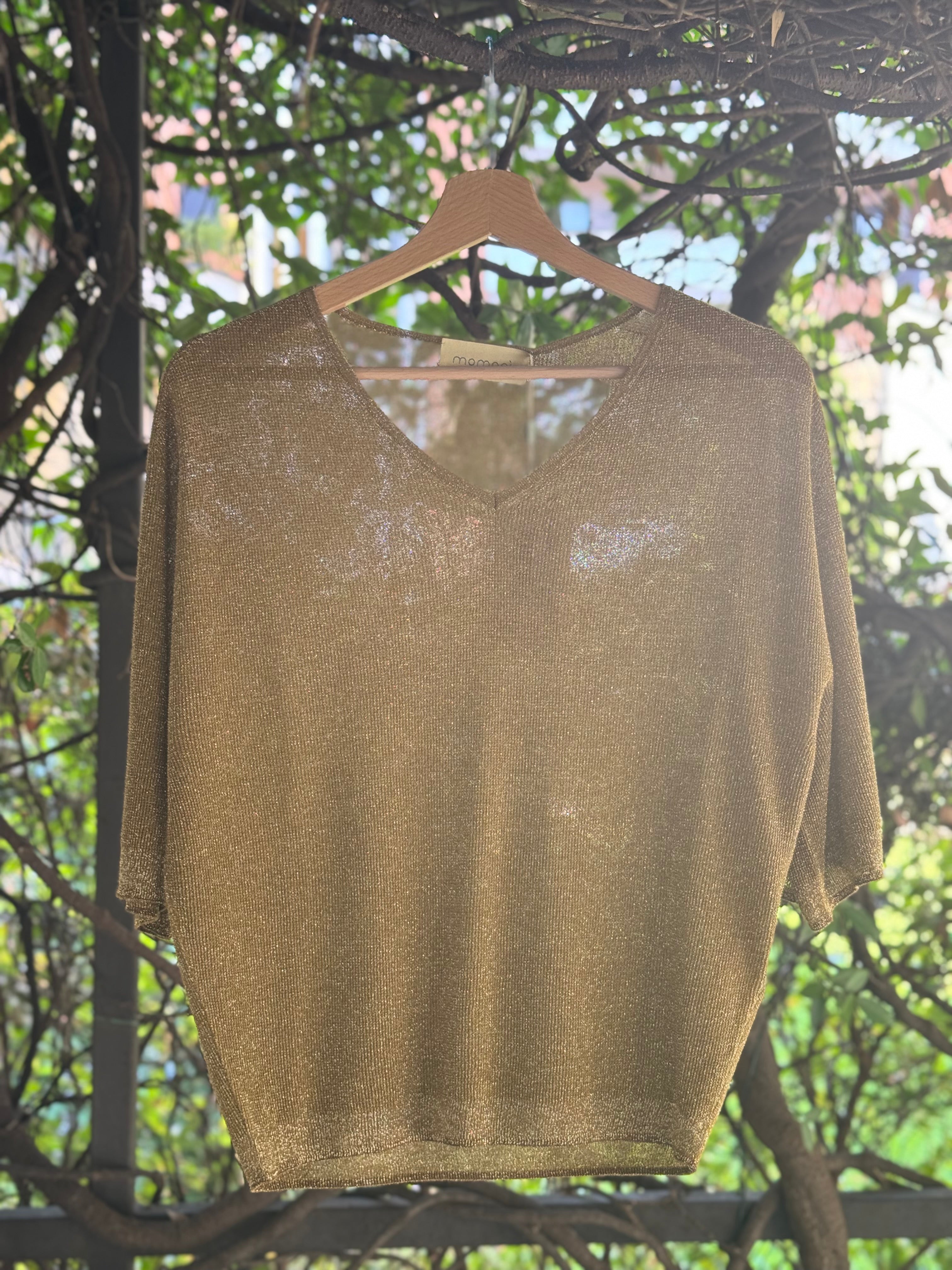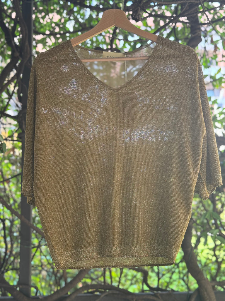 Scollo a "v" in maglia perlata di viscosa lurex. Blas è caratterizzata da una linea a pipistrello, con ampie maniche diritte. Un capo raffinato ed elegante, adatto al quotidiano come alla cerimonia. Made in Italy.