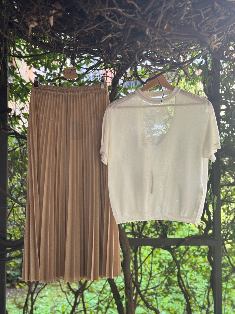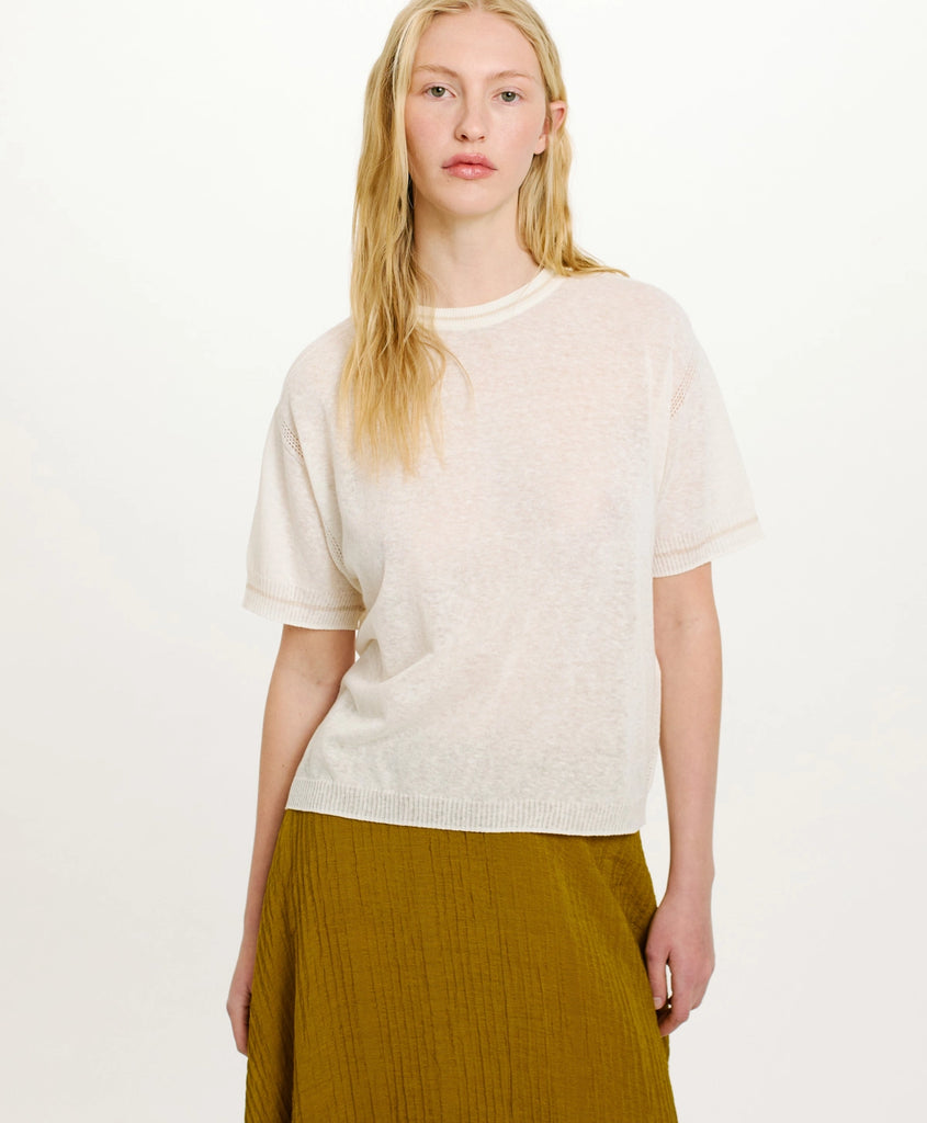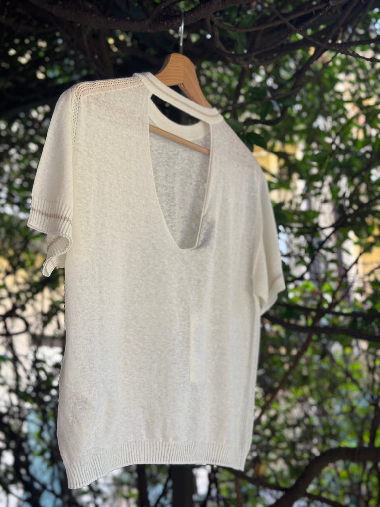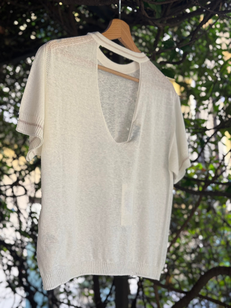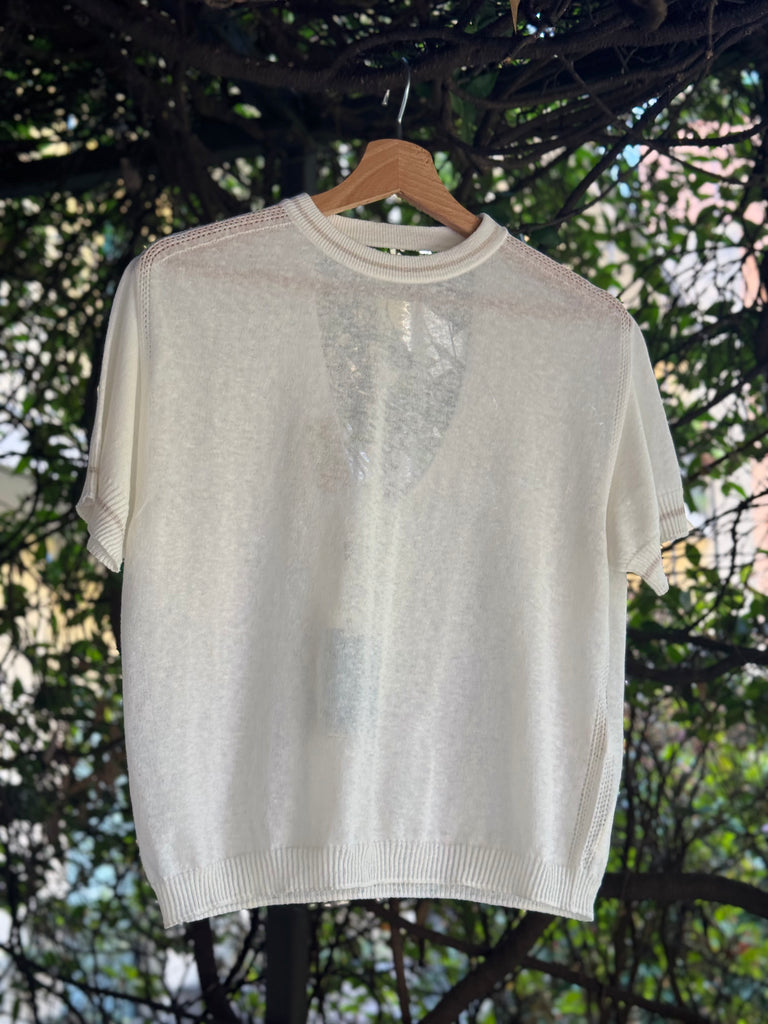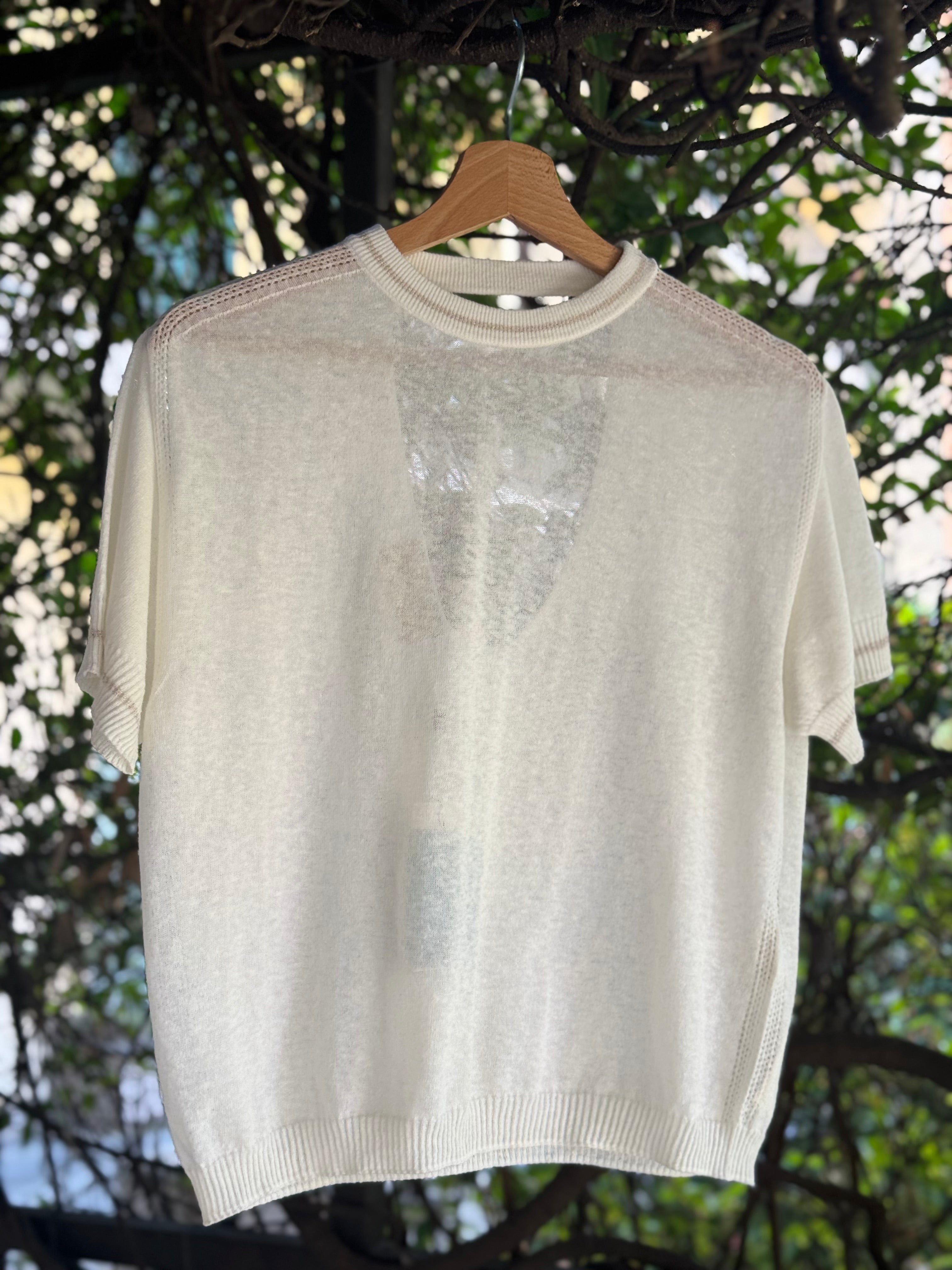 T-shirt in maglia girocollo con manica corta realizzata in filato di cotone e lino. Coste del collo e delle maniche sono arricchite con l'inserimento di un filato lurex a contrasto. Inoltre nel retro è presente un piccolo scollo a v per rendere più femminili una capo dal'uso quotidiano. Made in Italy
