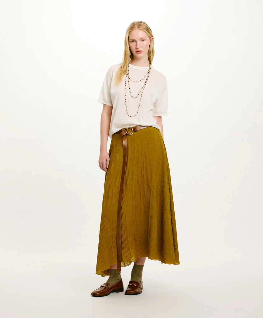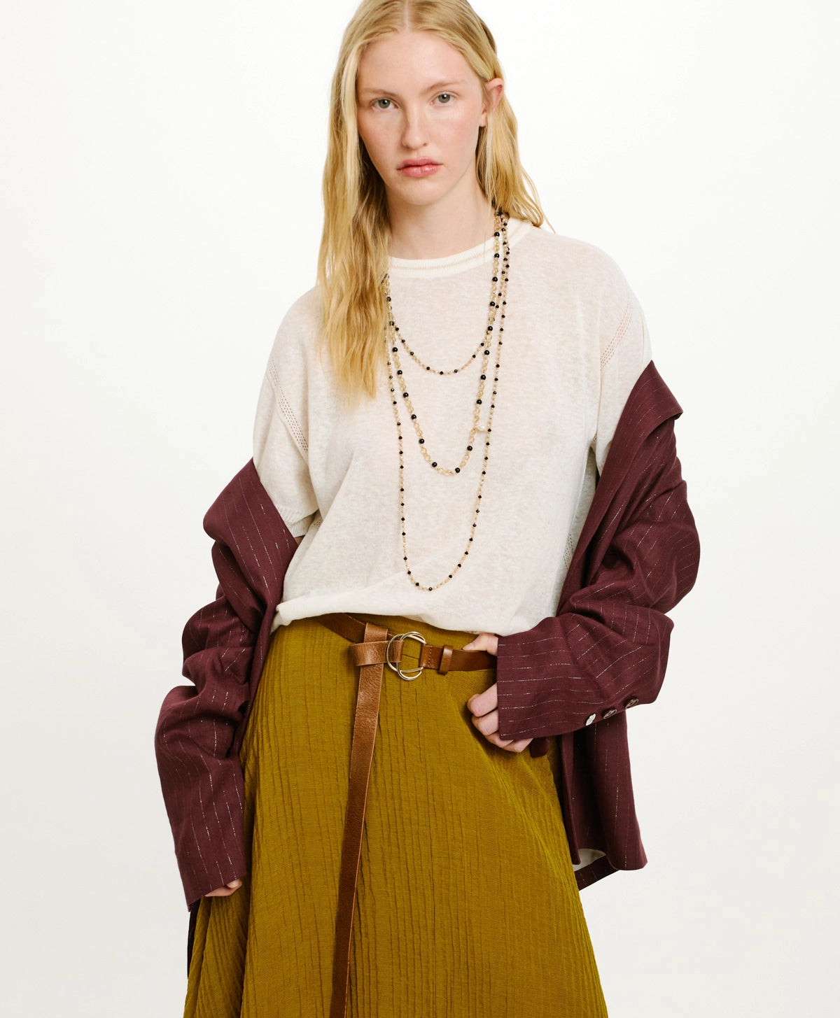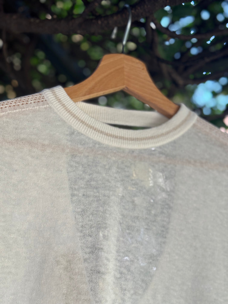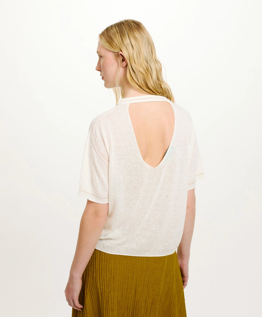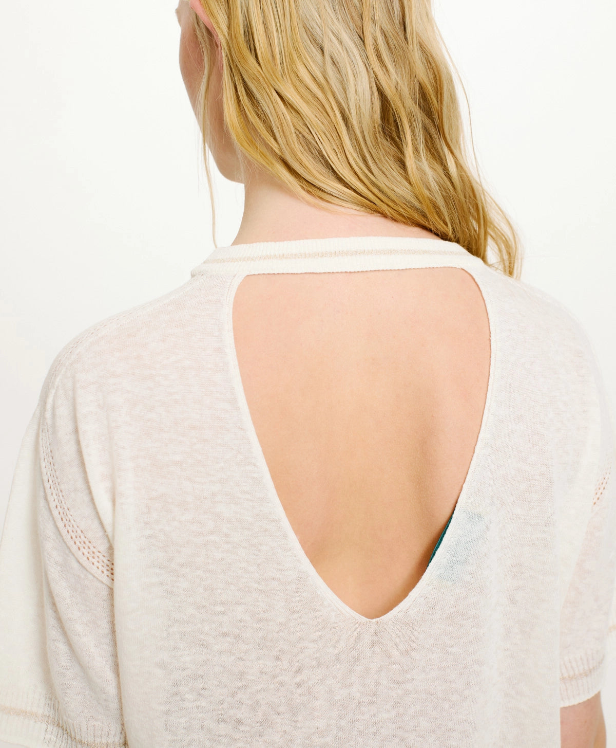 T-shirt in maglia girocollo con manica corta realizzata in filato di cotone e lino. Coste del collo e delle maniche sono arricchite con l'inserimento di un filato lurex a contrasto. Inoltre nel retro è presente un piccolo scollo a v per rendere più femminili una capo dal'uso quotidiano. Made in Italy