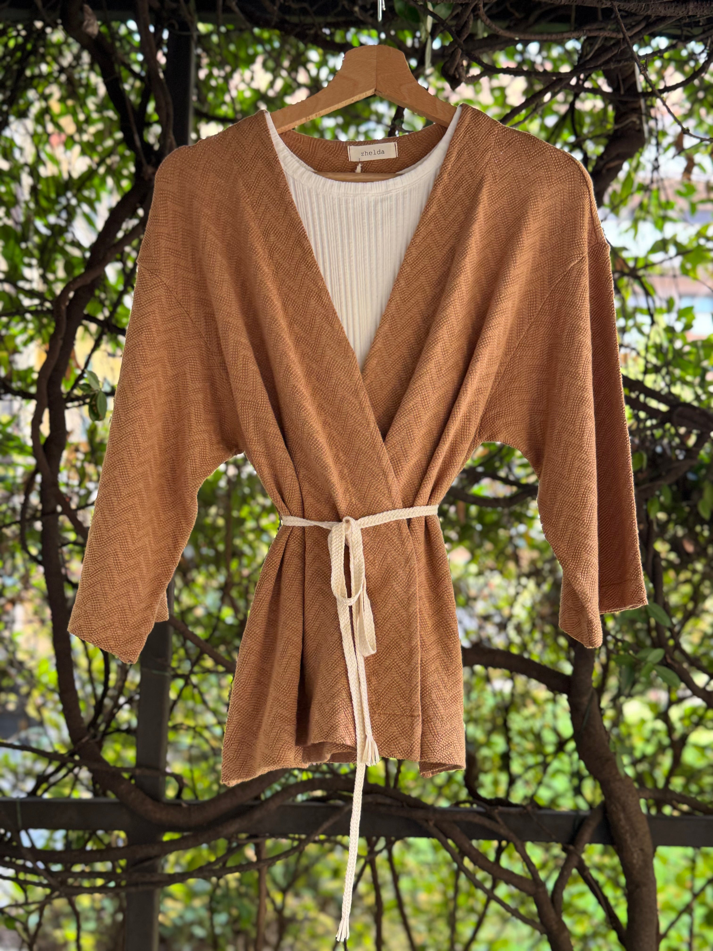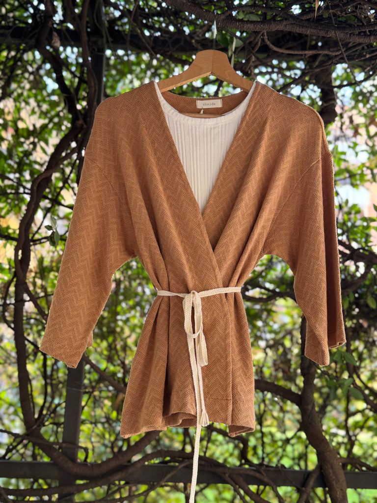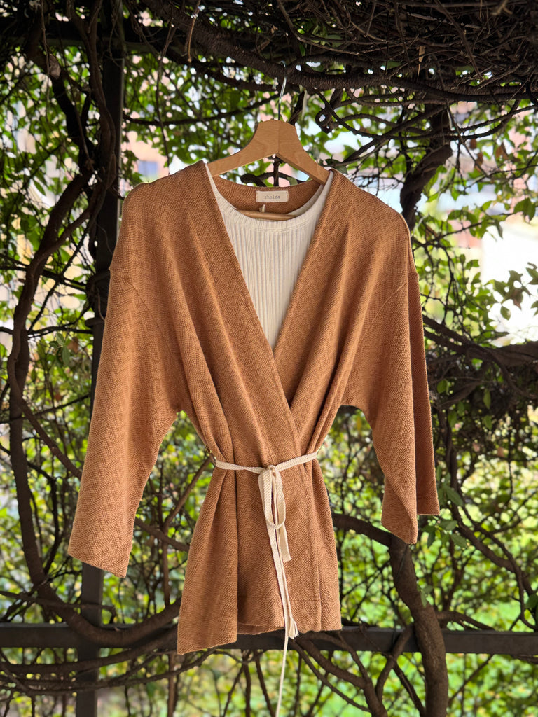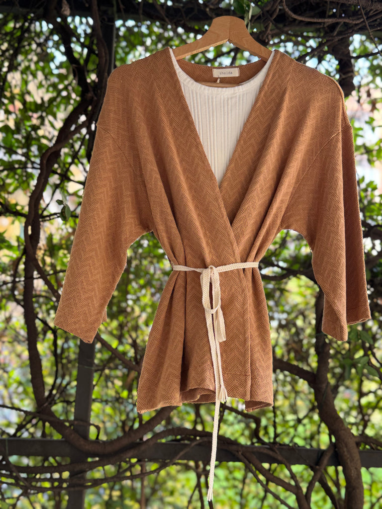 Maglia incrociata in cotone lavorato con maniche a trapezio al gomito. Made in Italy