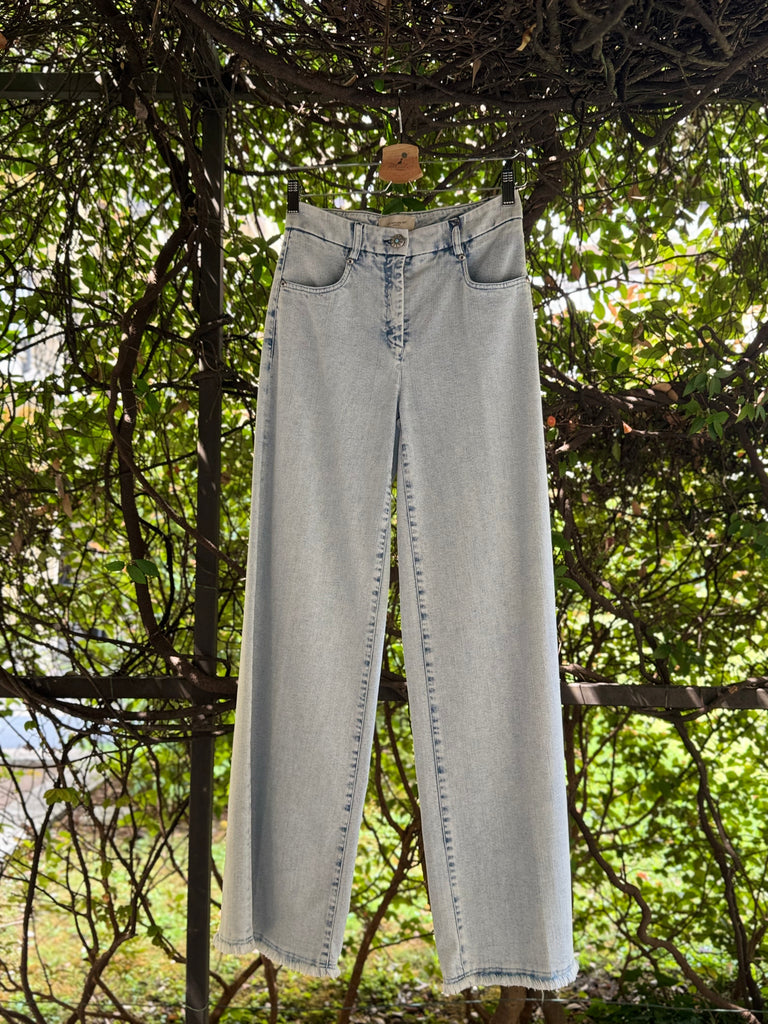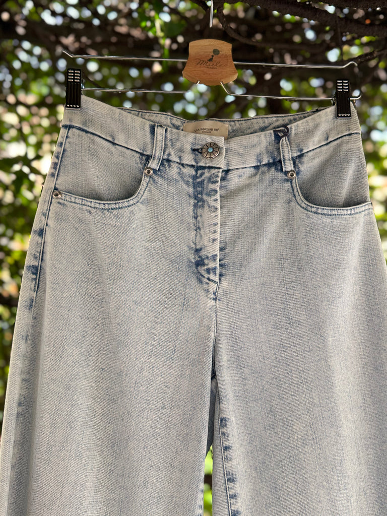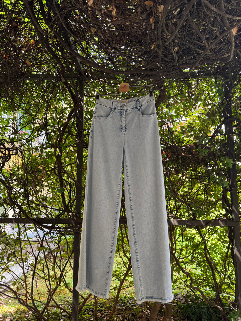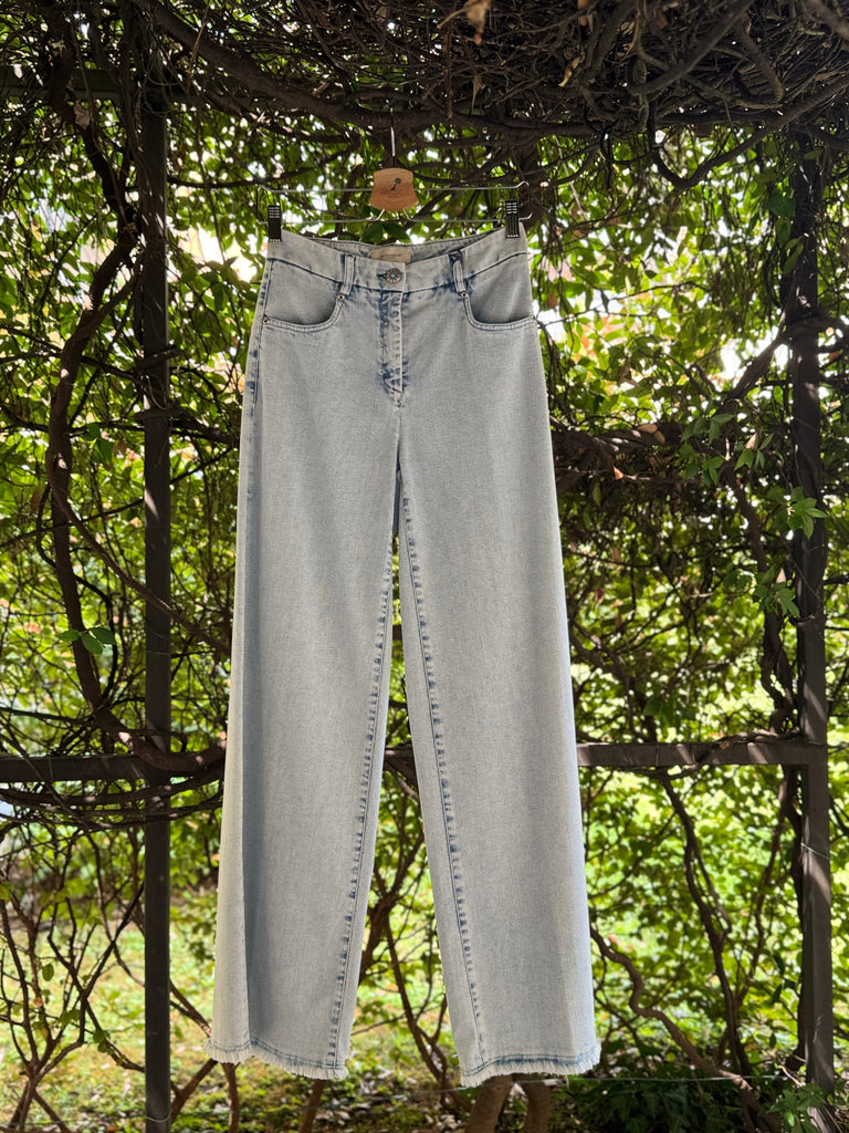 Pantaloni in denim estivo lavaggio chiaro in cotone stetch a gamba larga a palazzo con cimosa ferma a vista sul fondo e bottone gioiello. Made in Italy
