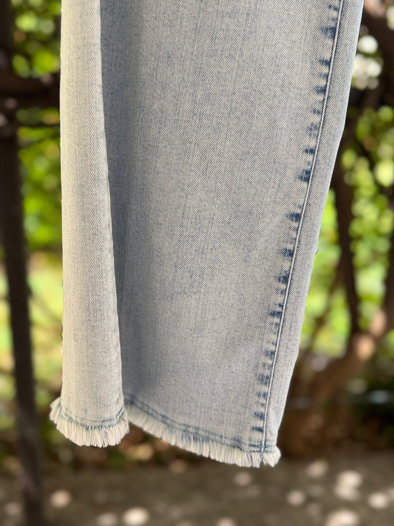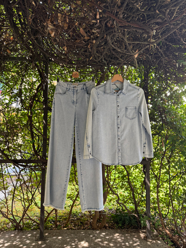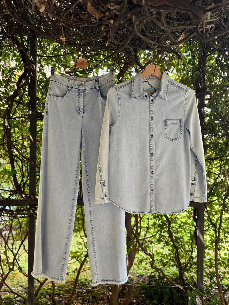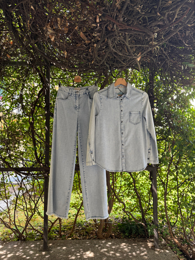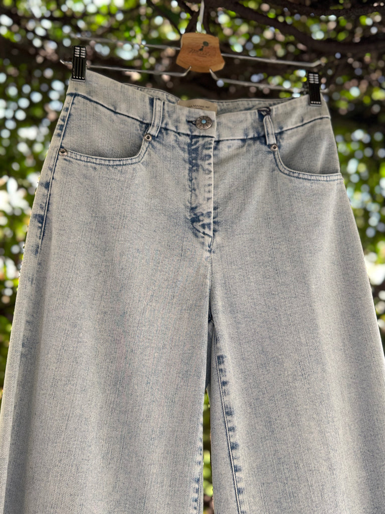 Pantaloni in denim estivo lavaggio chiaro in cotone stetch a gamba larga a palazzo con cimosa ferma a vista sul fondo e bottone gioiello. Made in Italy