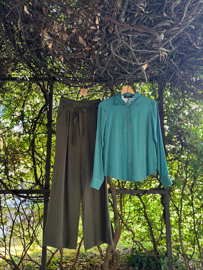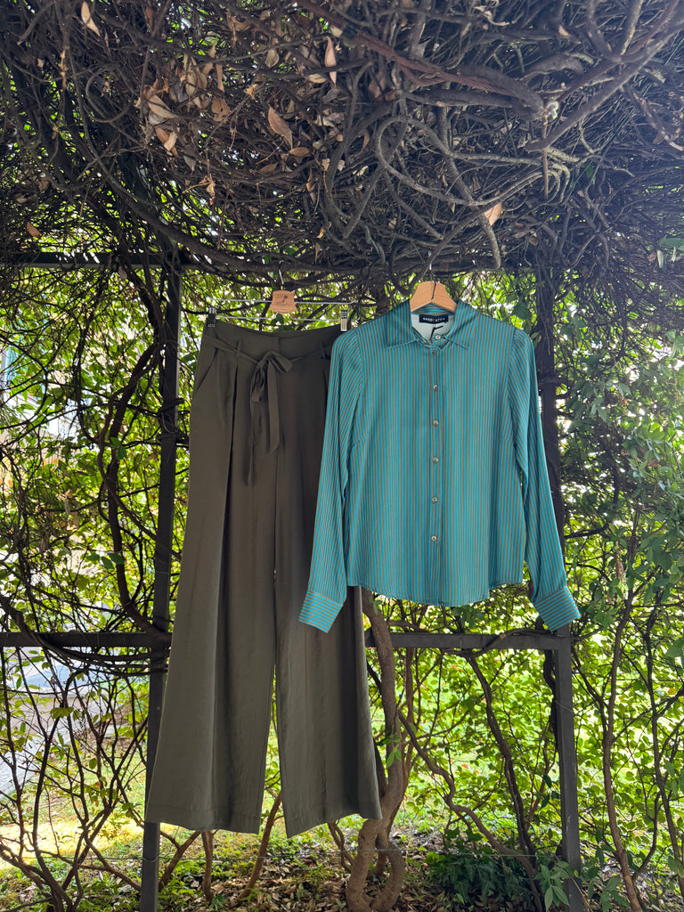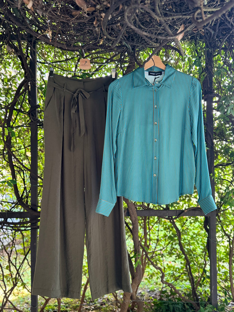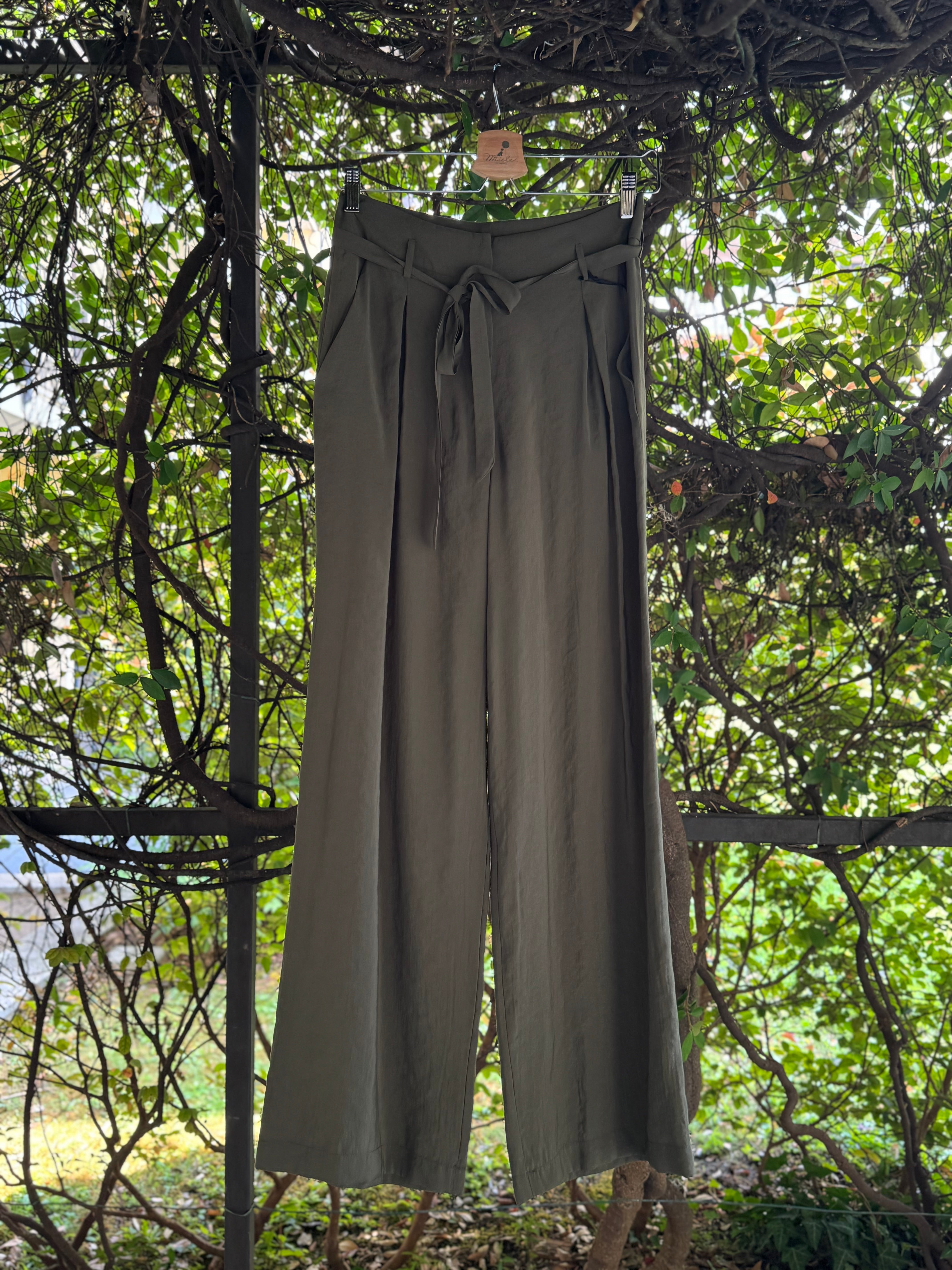 Pantaloni ampi a palazzo in leggero tessuto di viscosa, a vita alta con cinturina in vita, pences piatte, tasche laterali Made in Italy