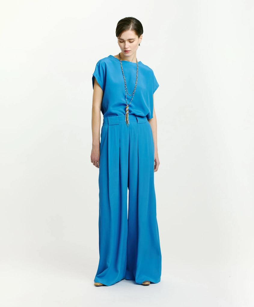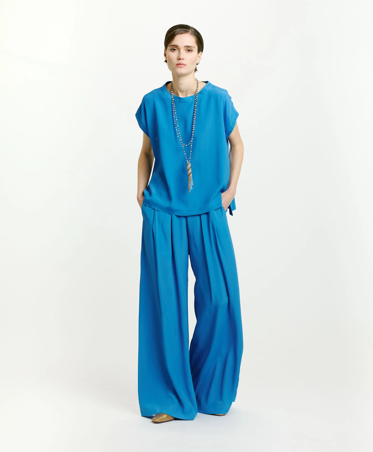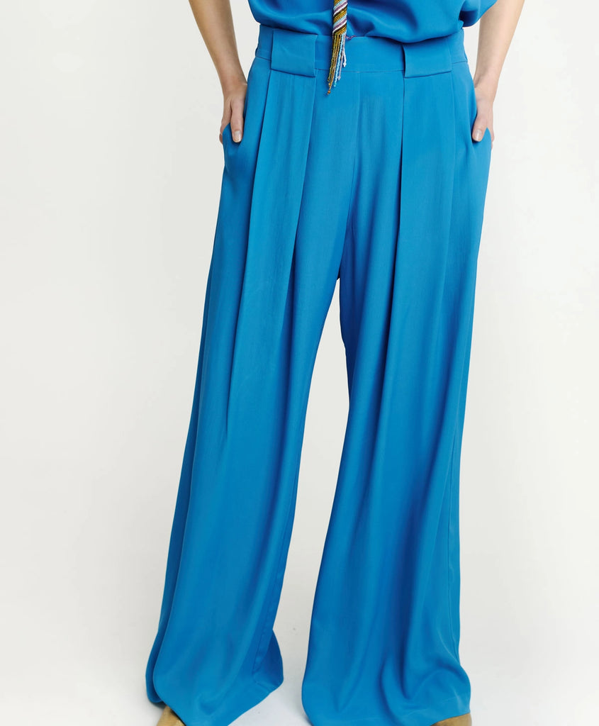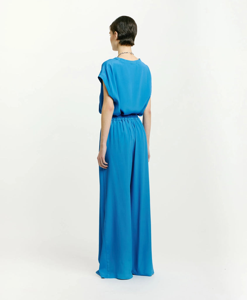 Pantalone carry-over a palazzo dalla linea ampia e ariosa, con pieghe frontali bloccate da maxi passanti, tasche inserite nel fianco e cintura elasticata sul retro, in tessuto acetato seta cobalto