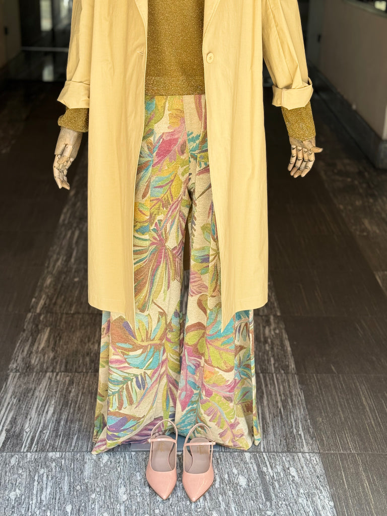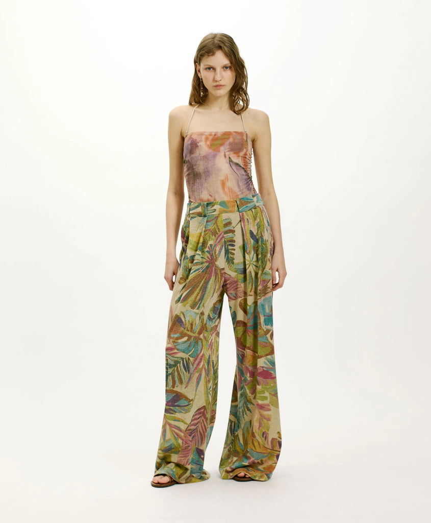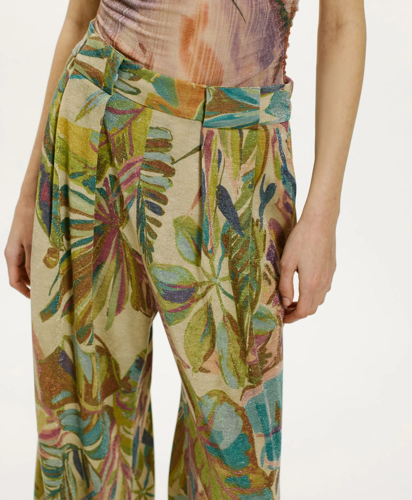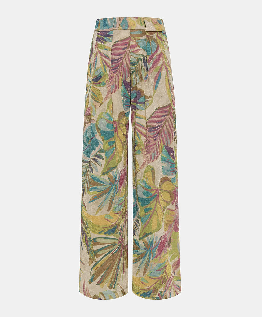 Pantalone carry over in jersey lurex stampato, a palazzo dalla linea ampia e ariosa, con pieghe frontali a faldone, maxi passanti, tasche inserite nel fianco e cintura elasticata solo sul retro.