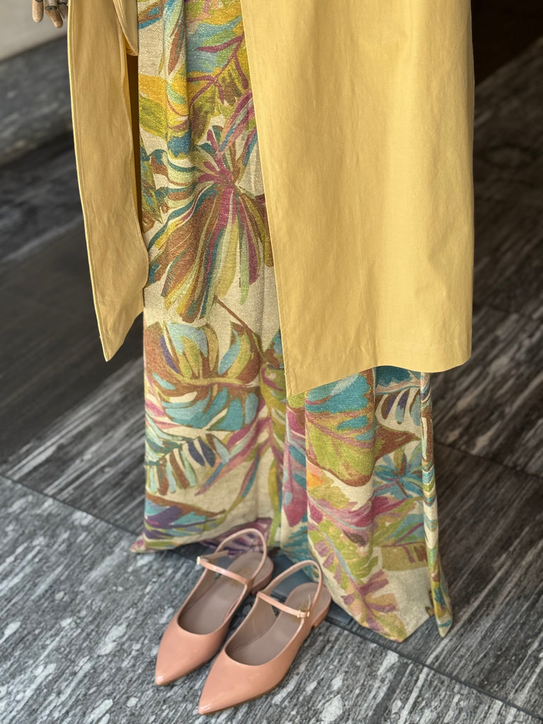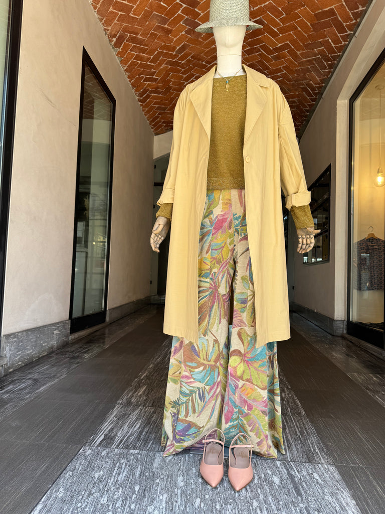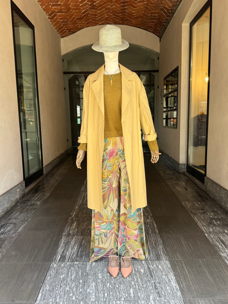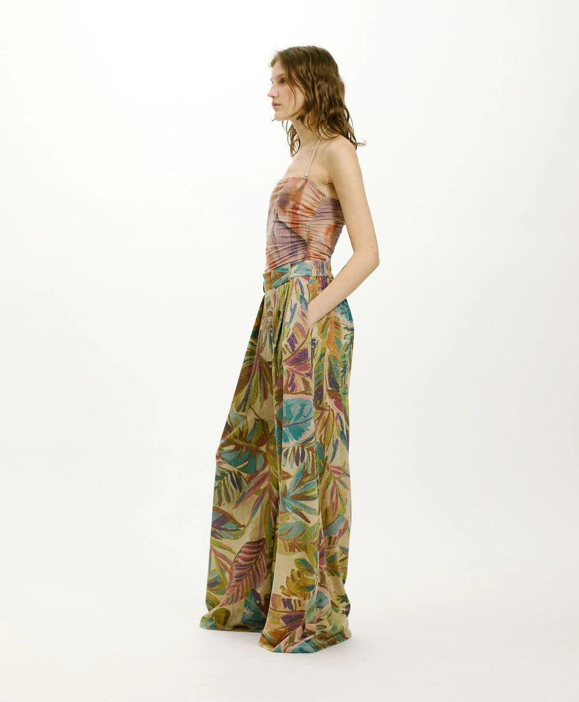 Pantalone carry over in jersey lurex stampato, a palazzo dalla linea ampia e ariosa, con pieghe frontali a faldone, maxi passanti, tasche inserite nel fianco e cintura elasticata solo sul retro.