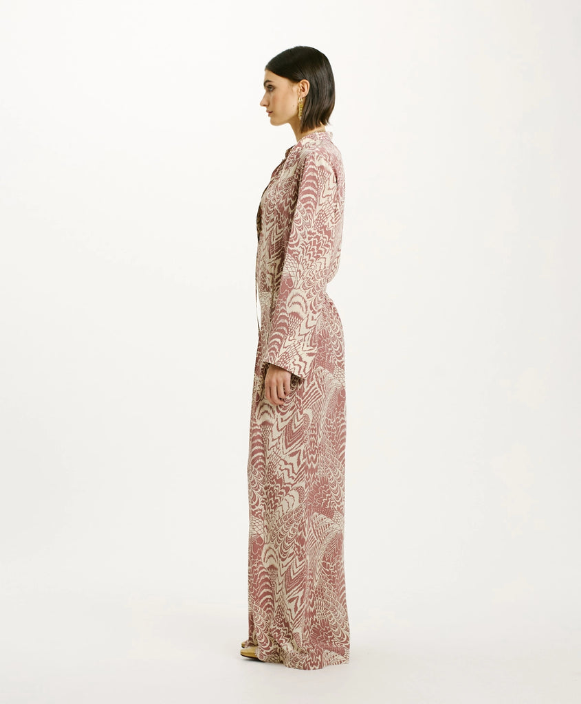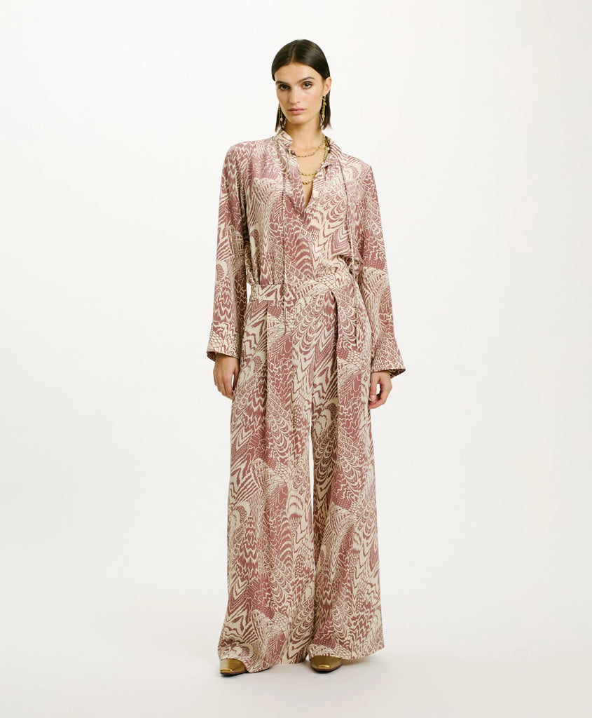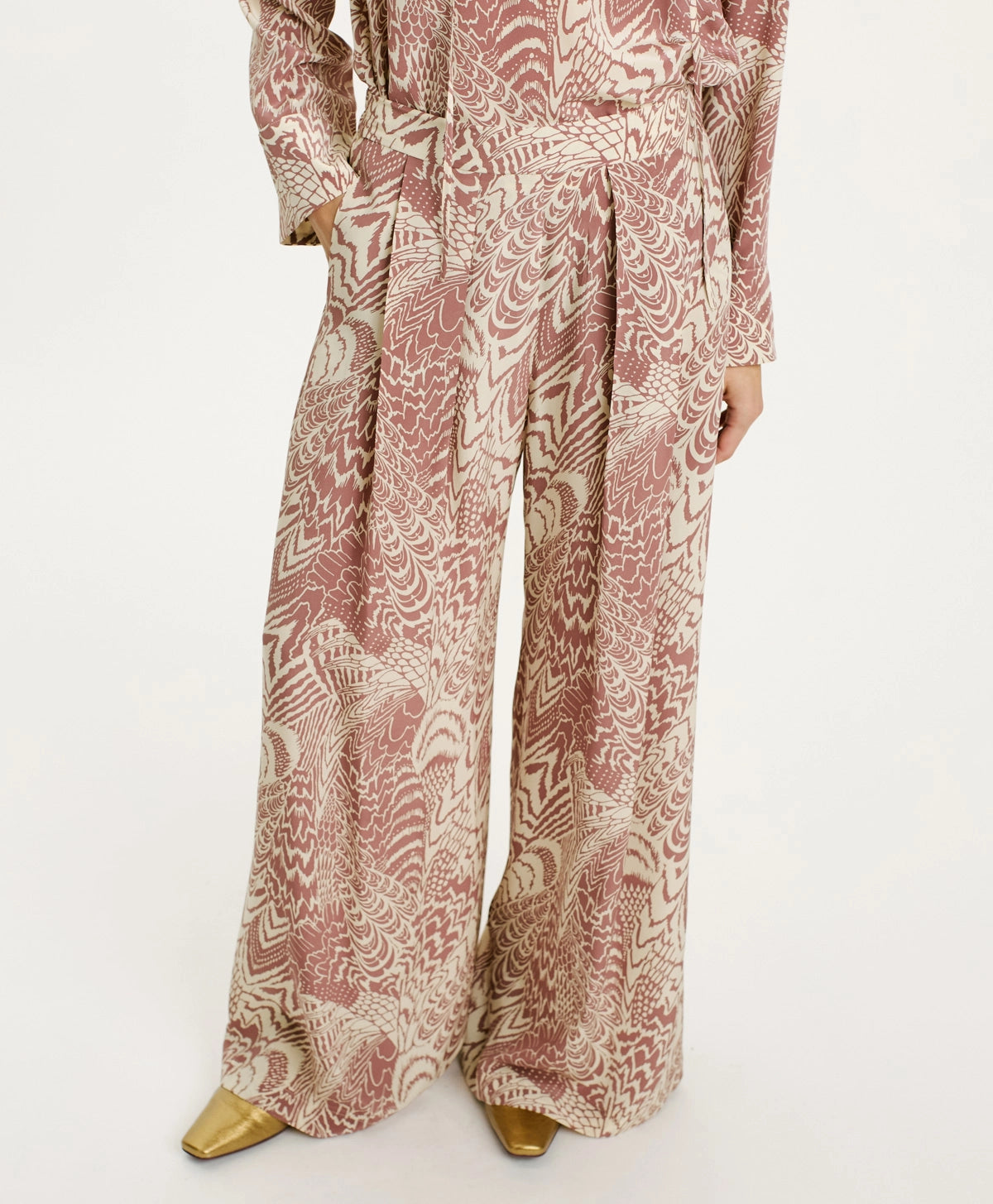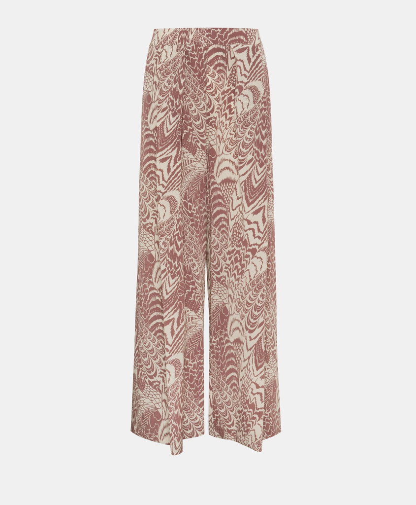 Pantalone in seta crepe de chine stampata all-over, a palazzo, dalla linea ampia e ariosa. Pieghe frontali, tasche inserite nel fianco e cintura elasticata sul retro. Colore panna/mosto