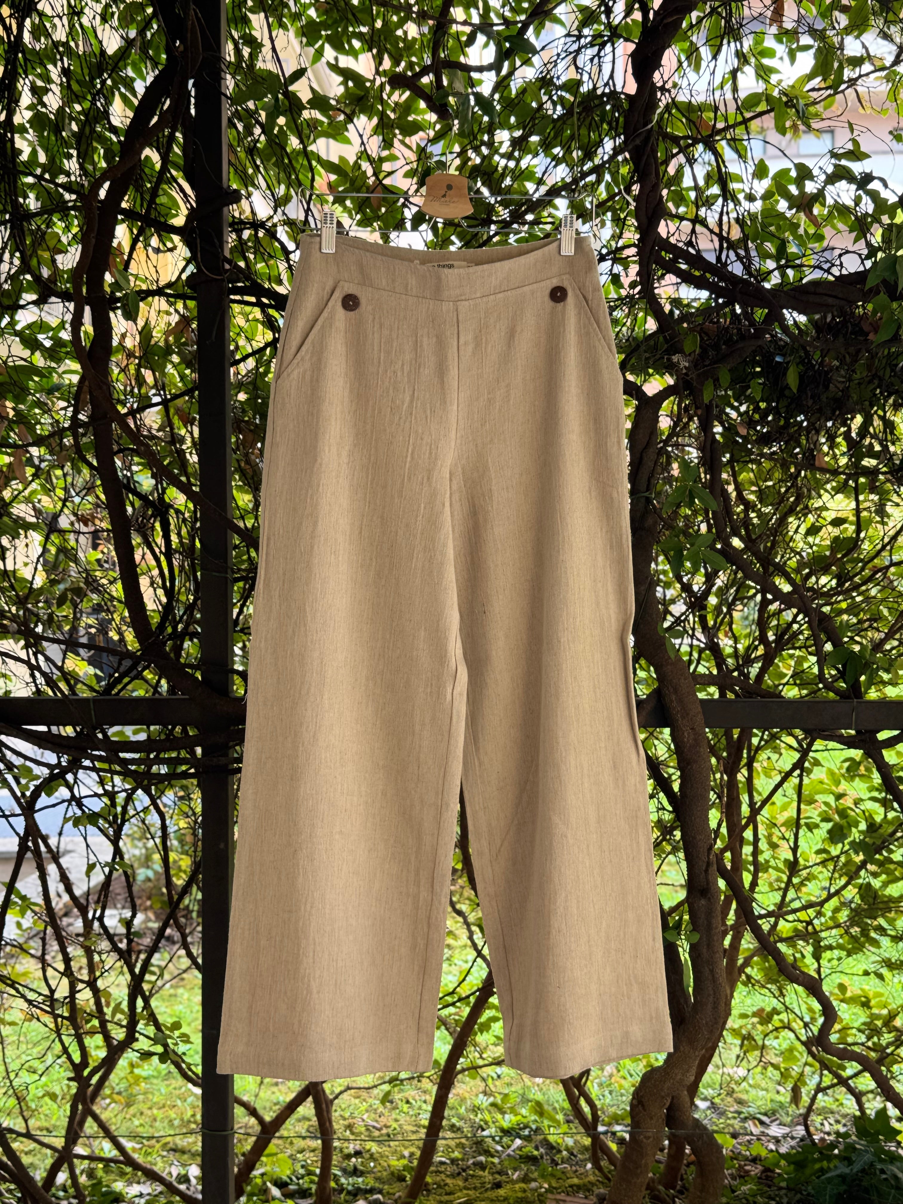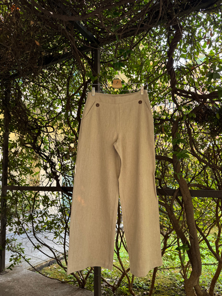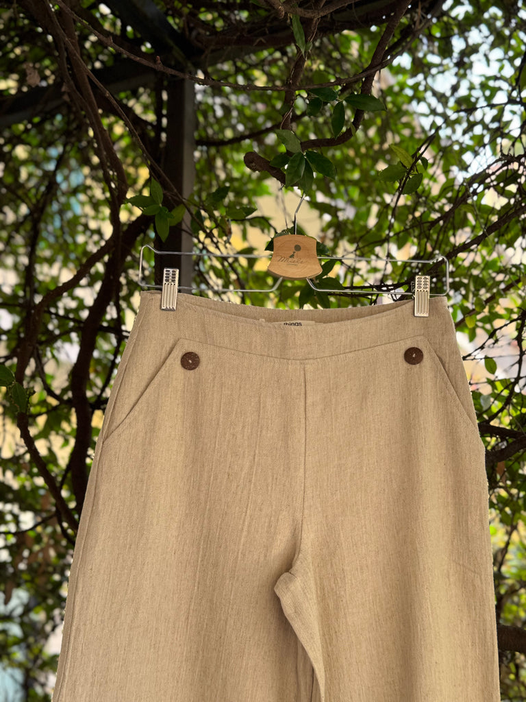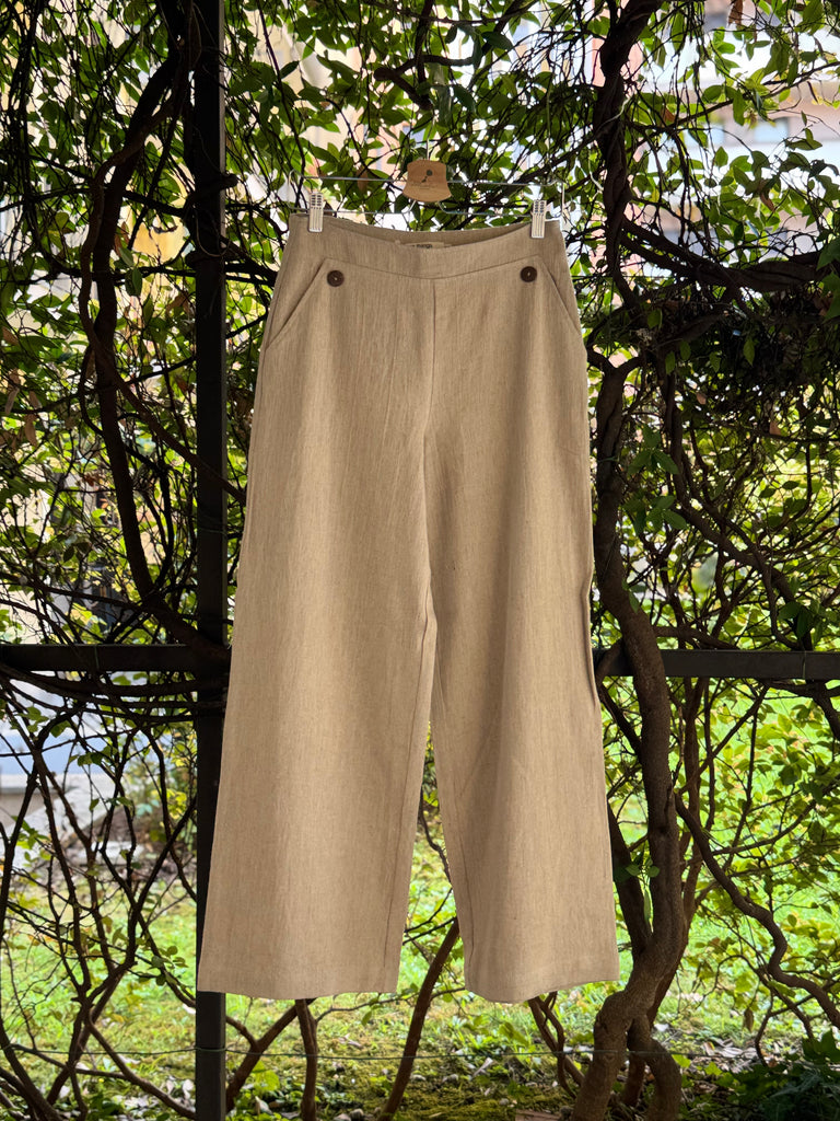 Pantaloni a vita alta svasati in lino con bottoncini nella parte davanti all’altezza delle tasche, cerniera laterale