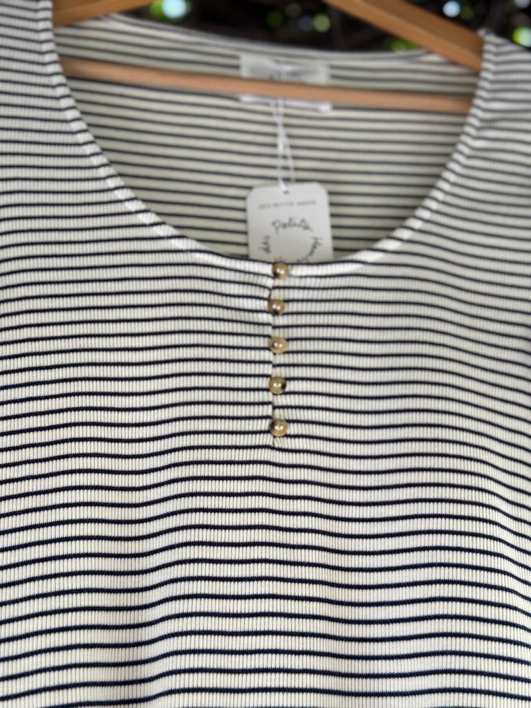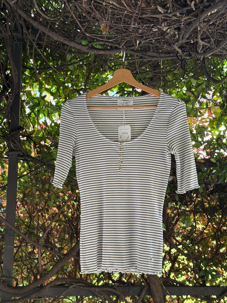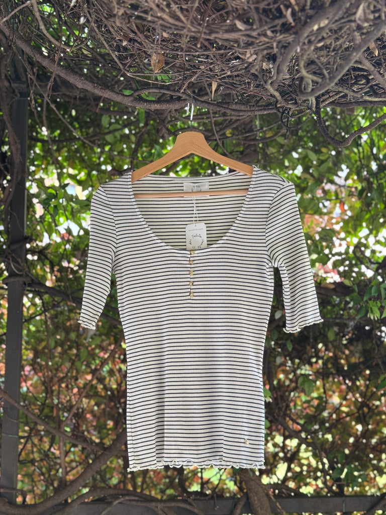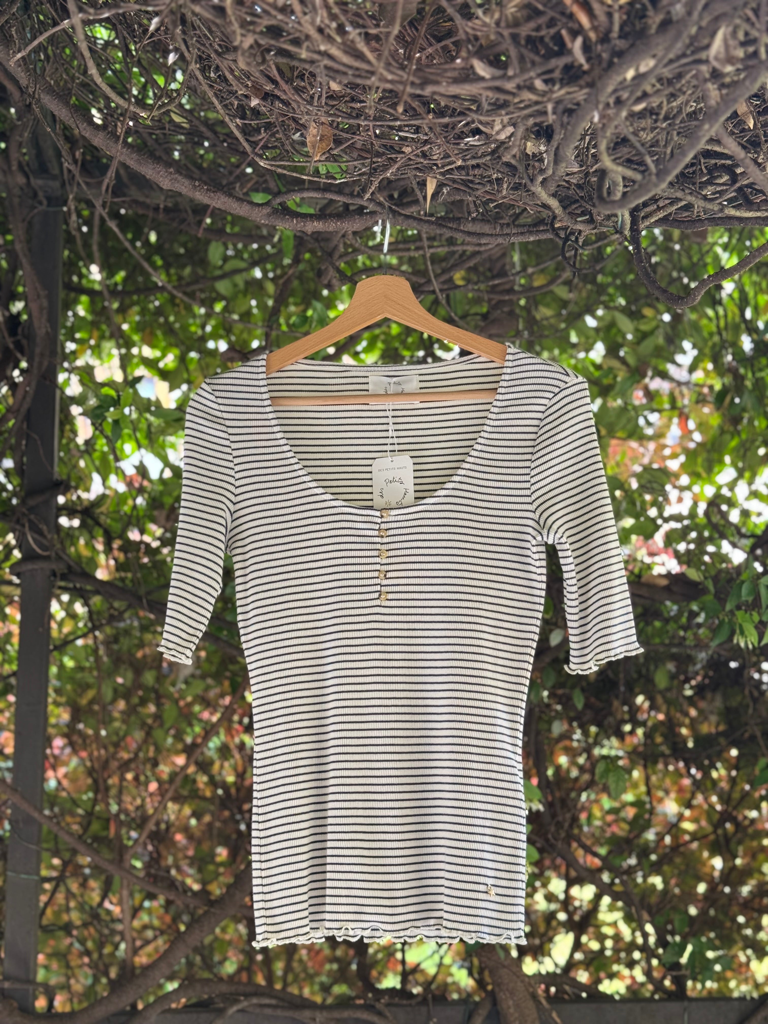 T-shirt in cotone a costine a righe blue, maniche corte lunghezza al gomito con cuciture in raso sul bordo, bottoncini a vista per uno stile bretone perfetto!