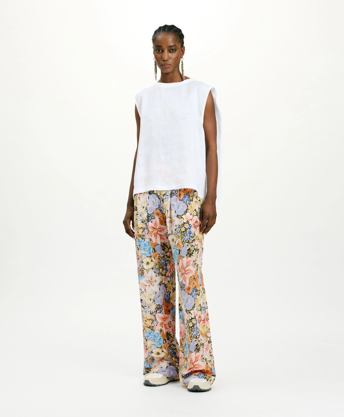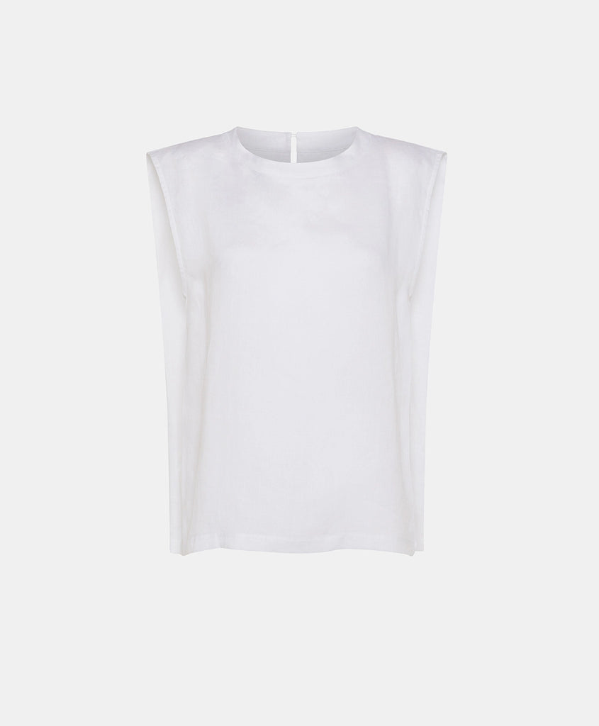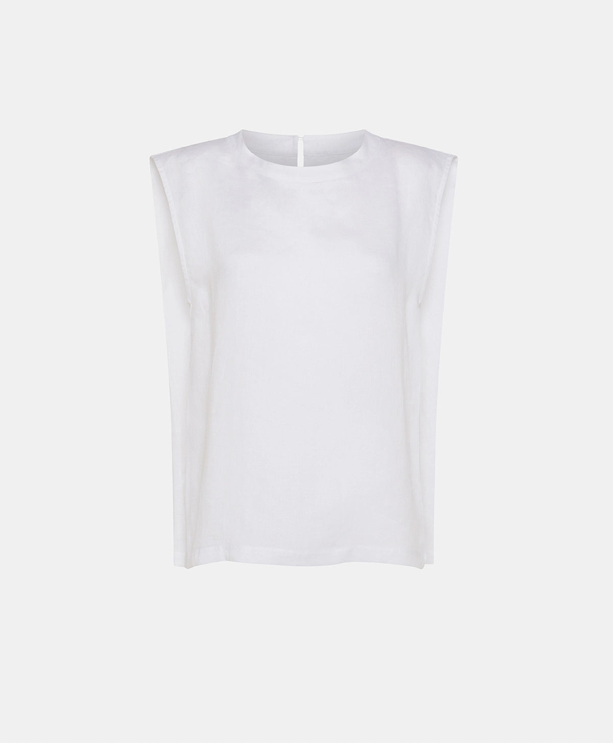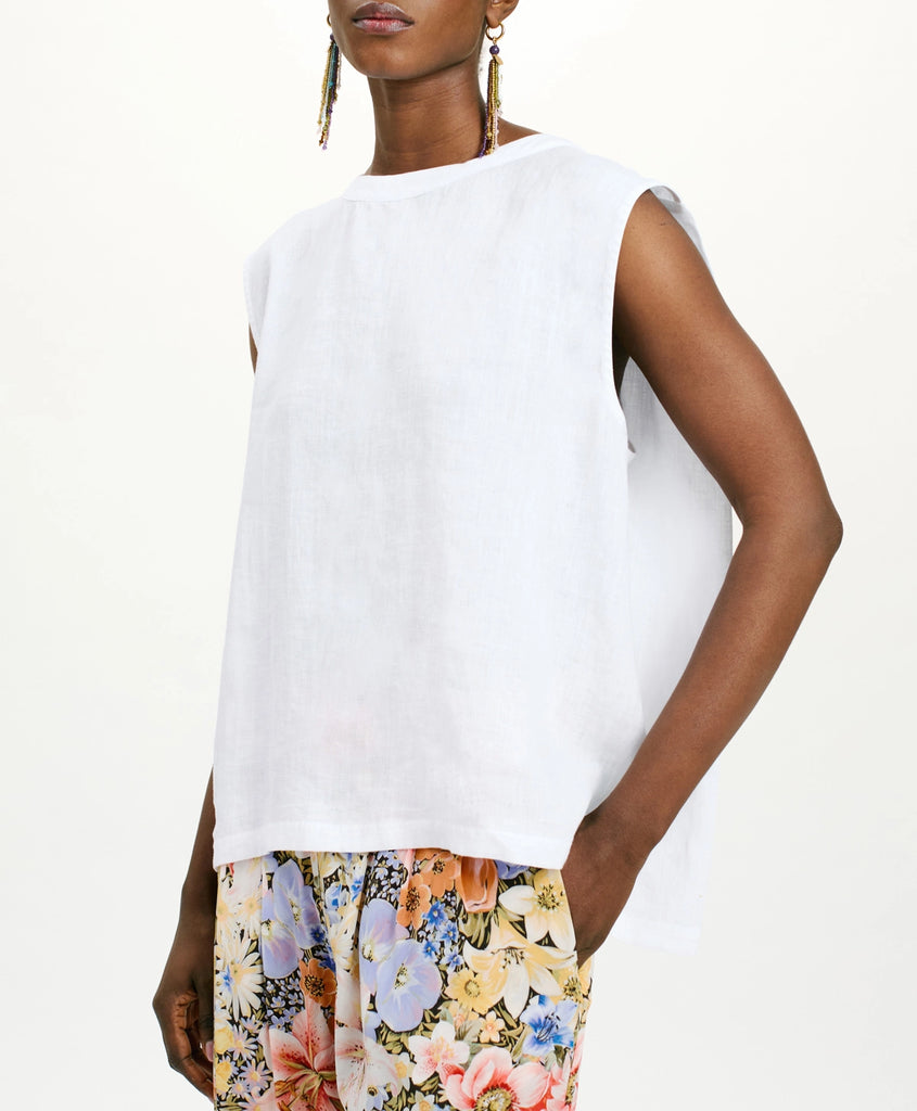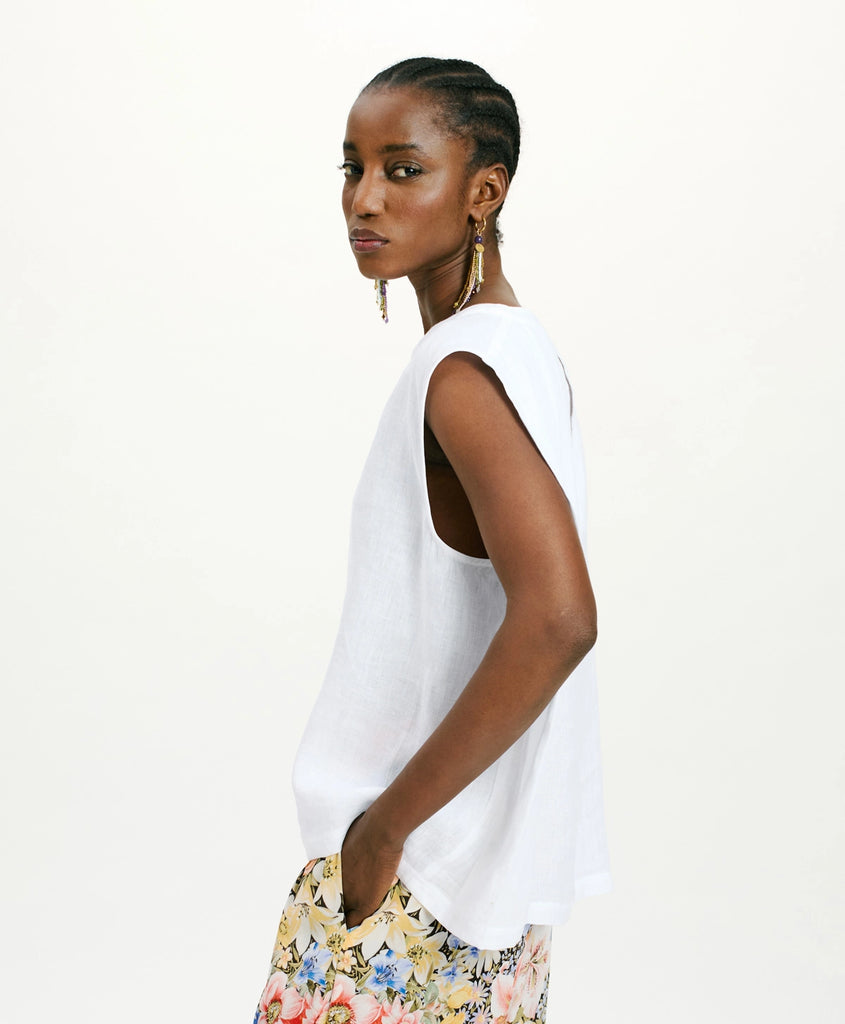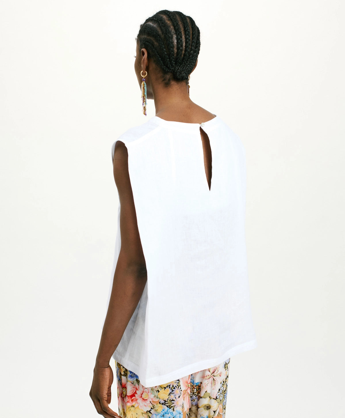 Top smanicato, in lino tinto filo, con scollo a giro e apertura a goccia chiusa da bottoncino sul dietro. Schiena ampia che crea delle maxi pieghe verso il davanti.