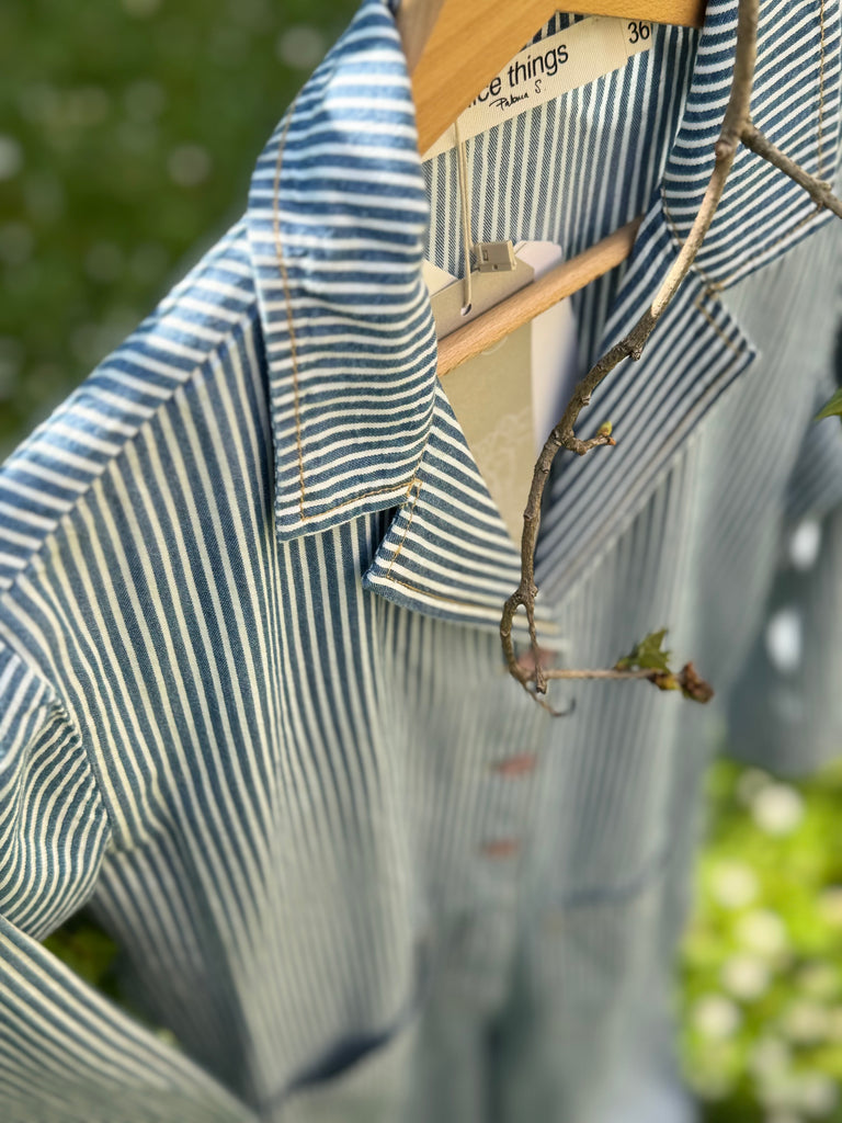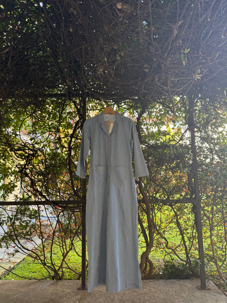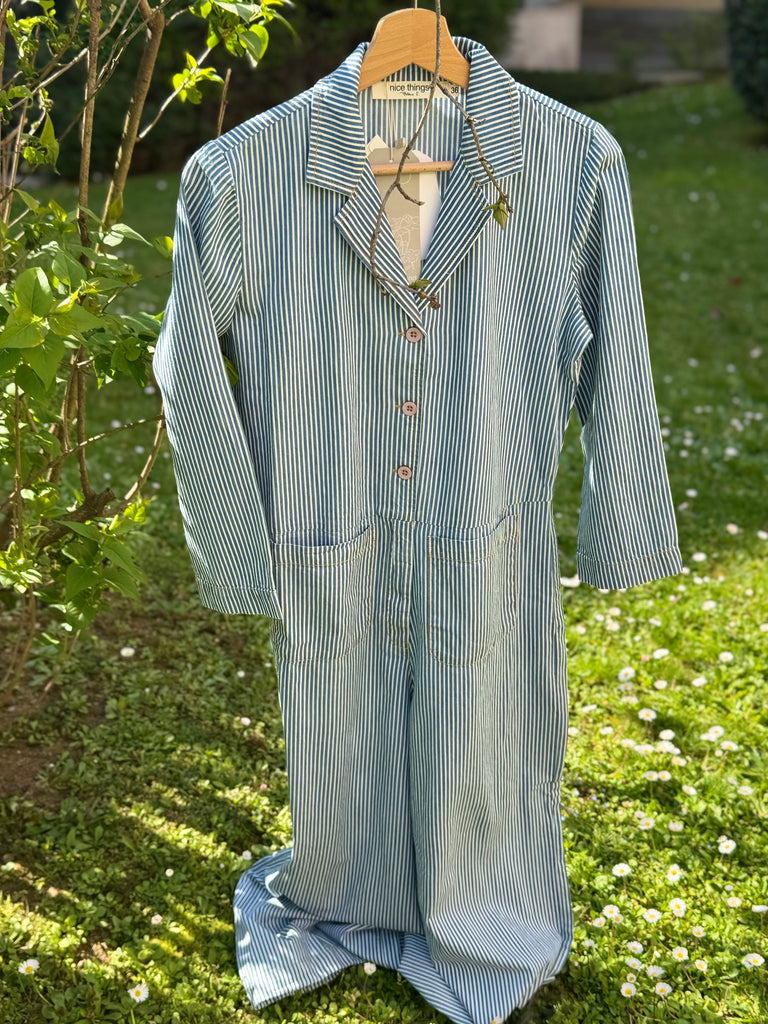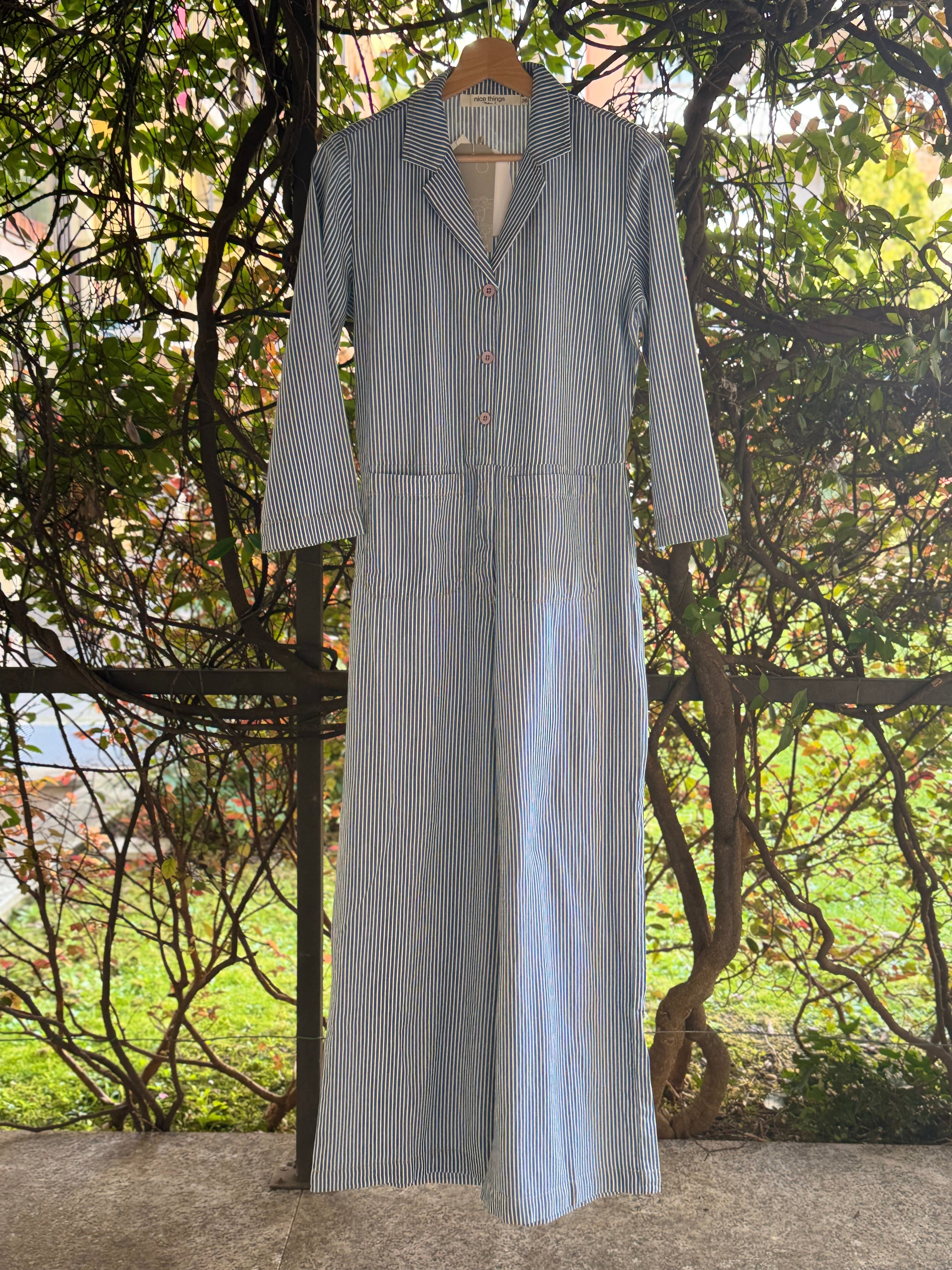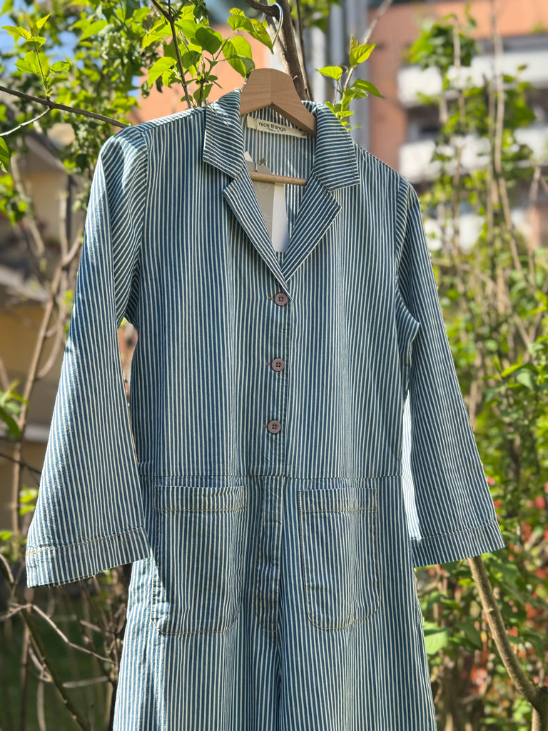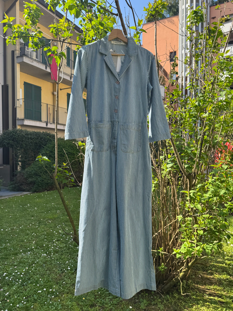 Tuta in denim chiaro a righe, con bottoni a vista, taschine applicate sul davanti