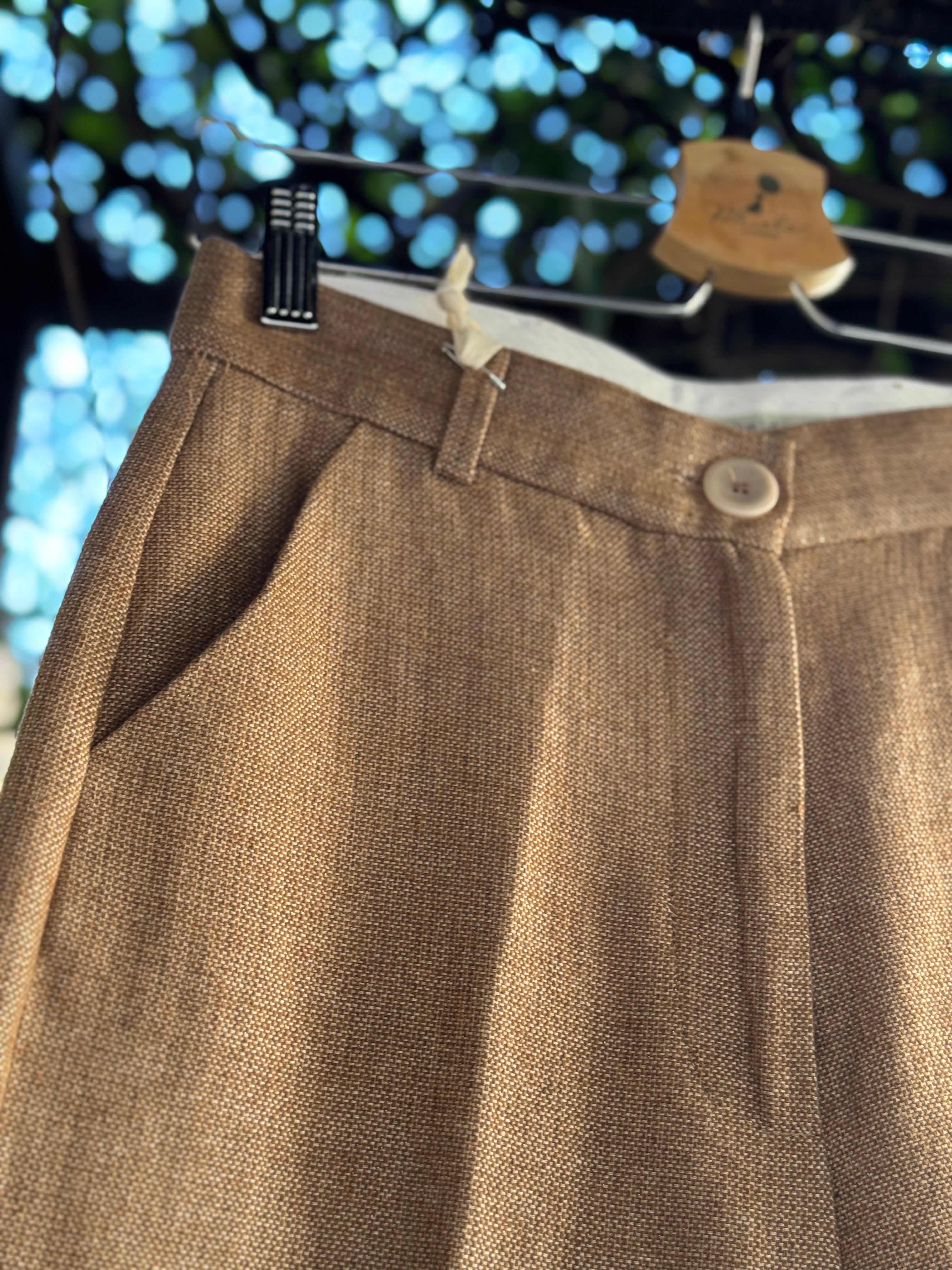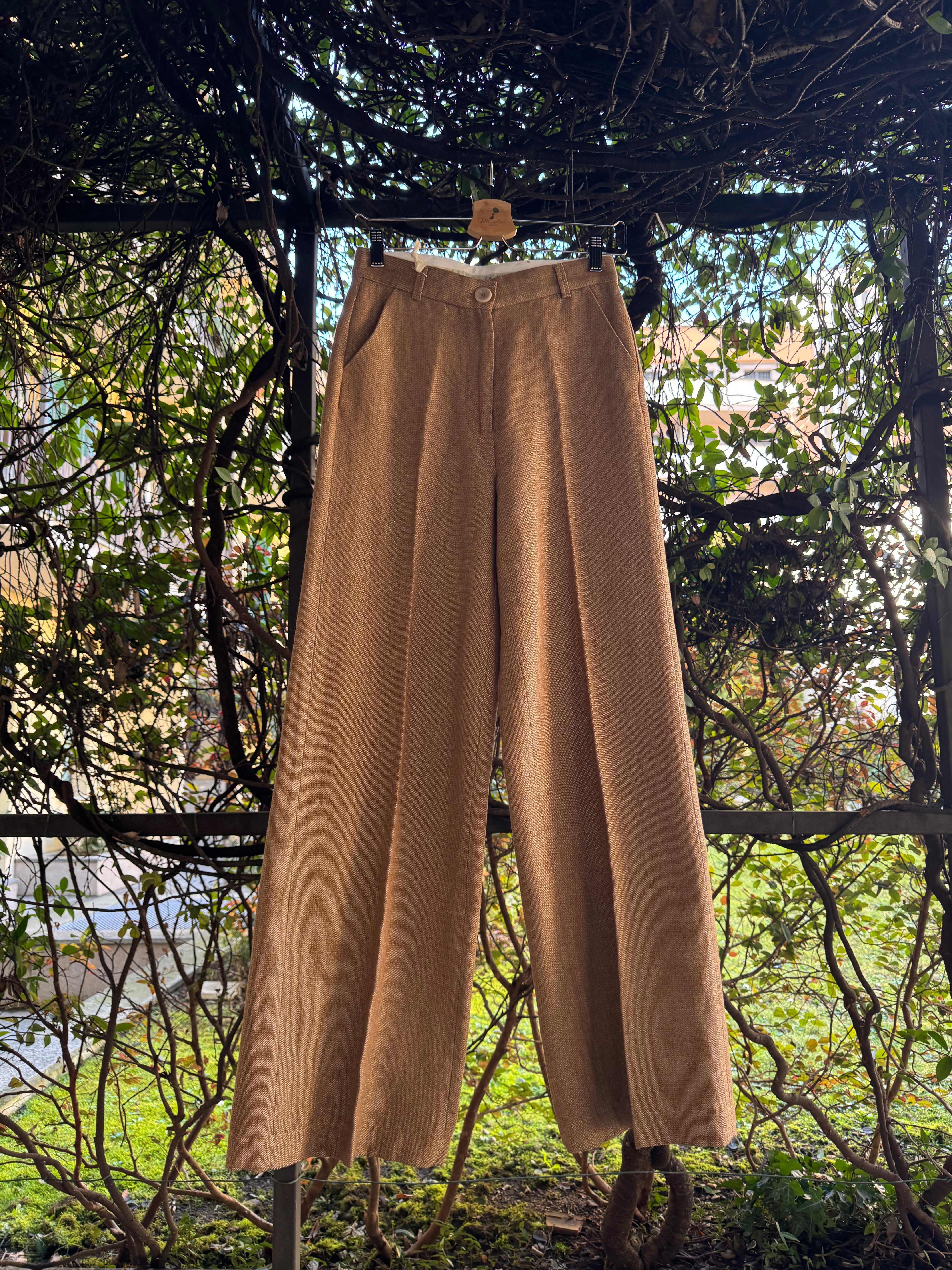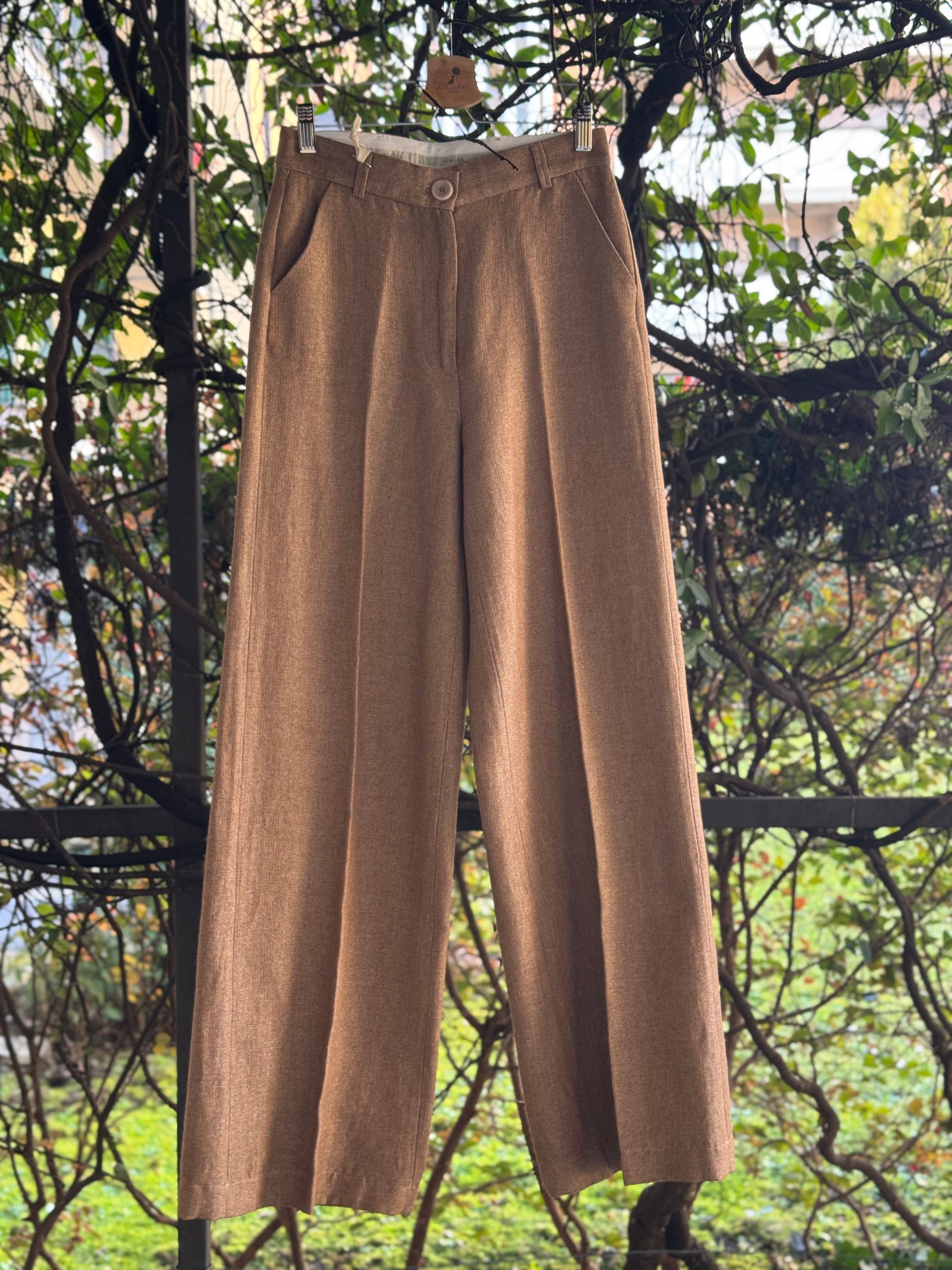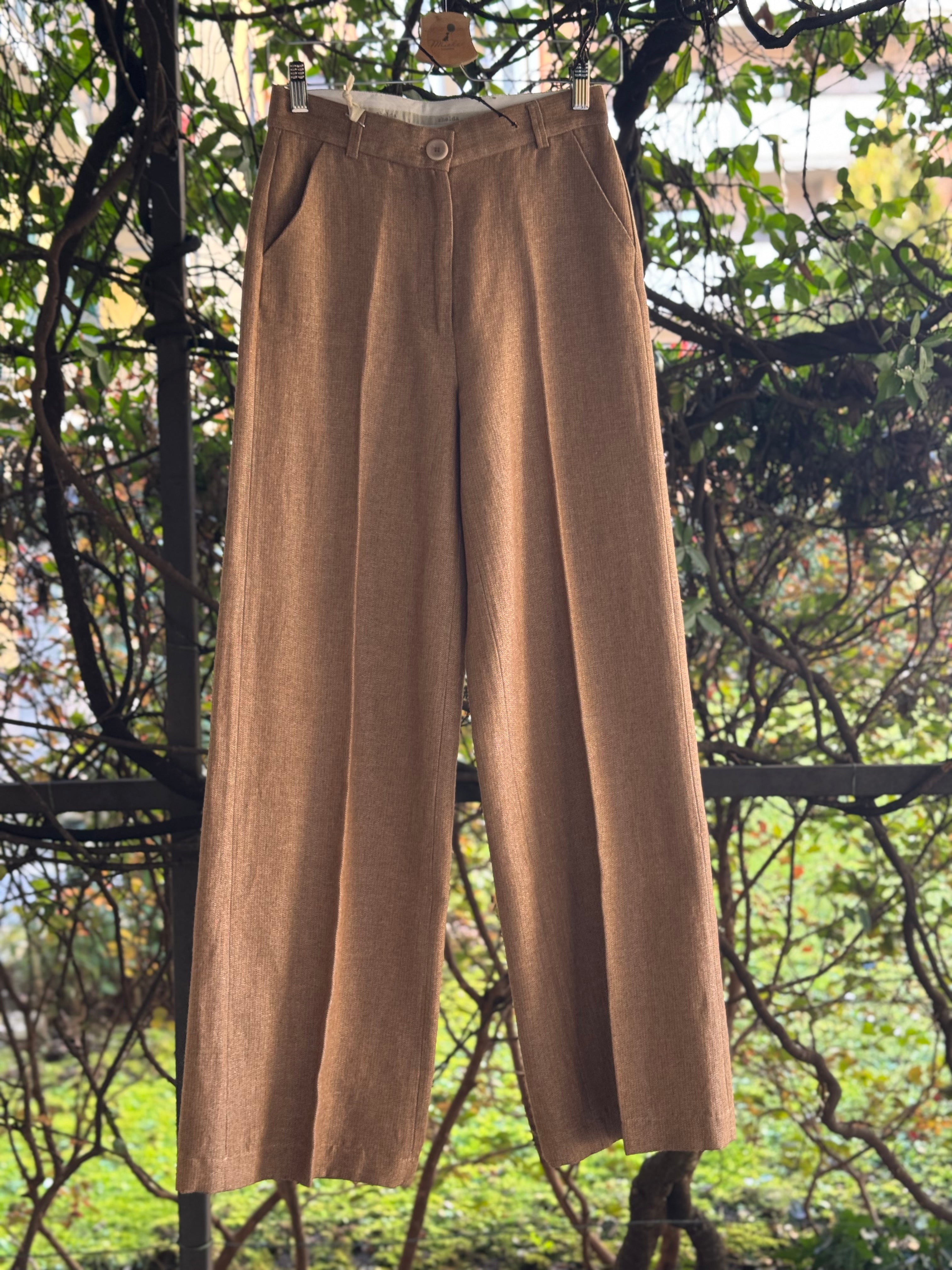 Pantaloni a palazzo in tessuto prezioso sui toni caldi del cammello/beige, con tasche laterali, vestibilità regolare