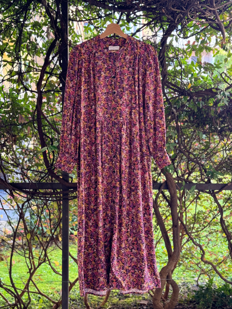 Abito ampio in tessuto di viscosa a fiori con collo alla coreana, allacciato con bottoncini in madreperla e maniche ampie