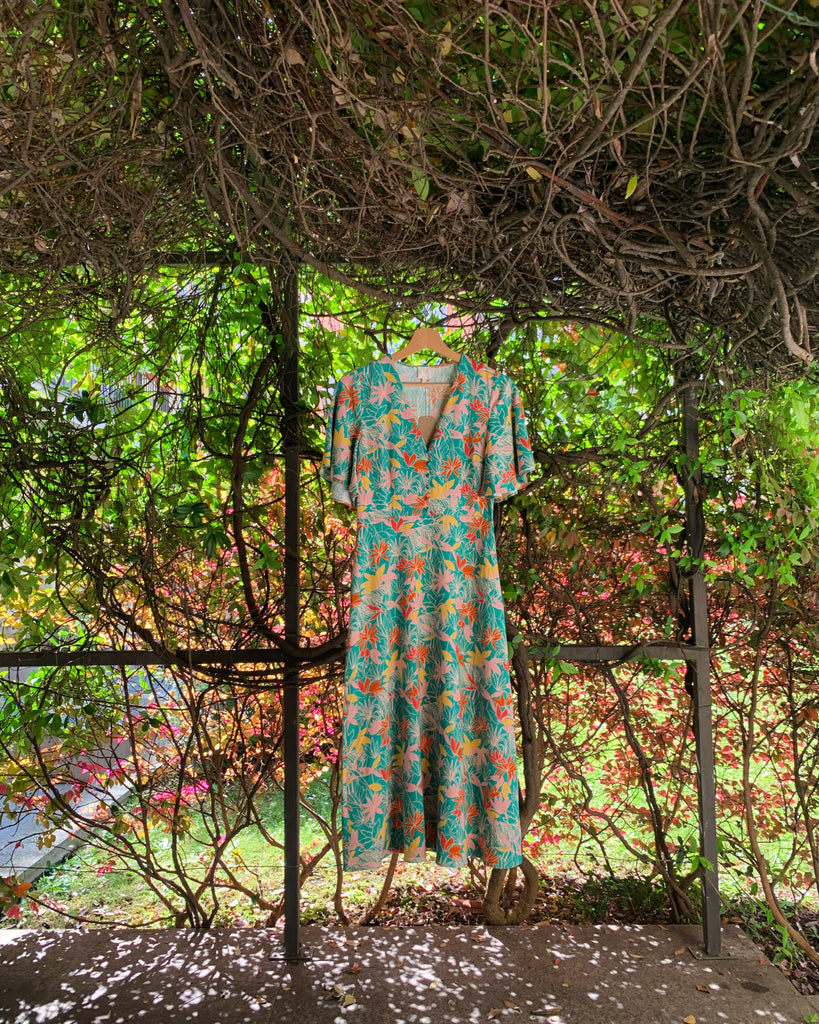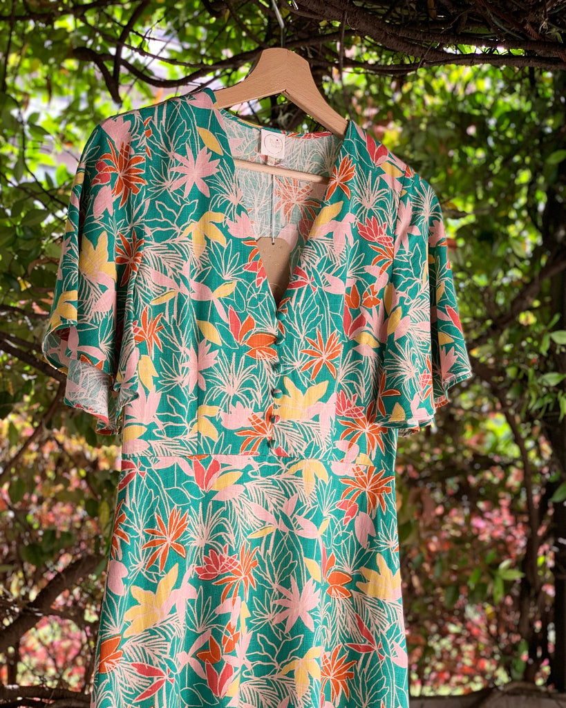 Abito longuette con manica a farfalla, gonna svasata, chiusura con cerniera laterale, stampa floreale su tessuto di viscosa e lino