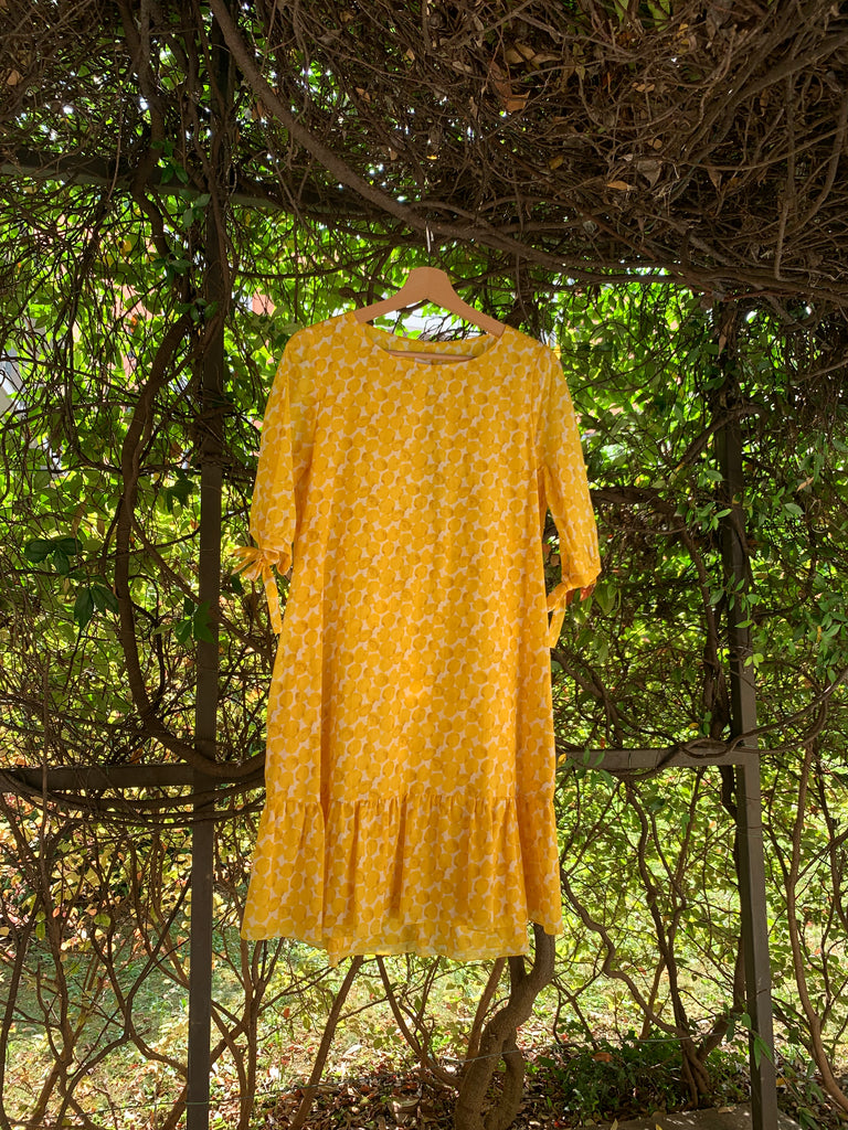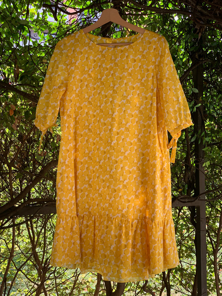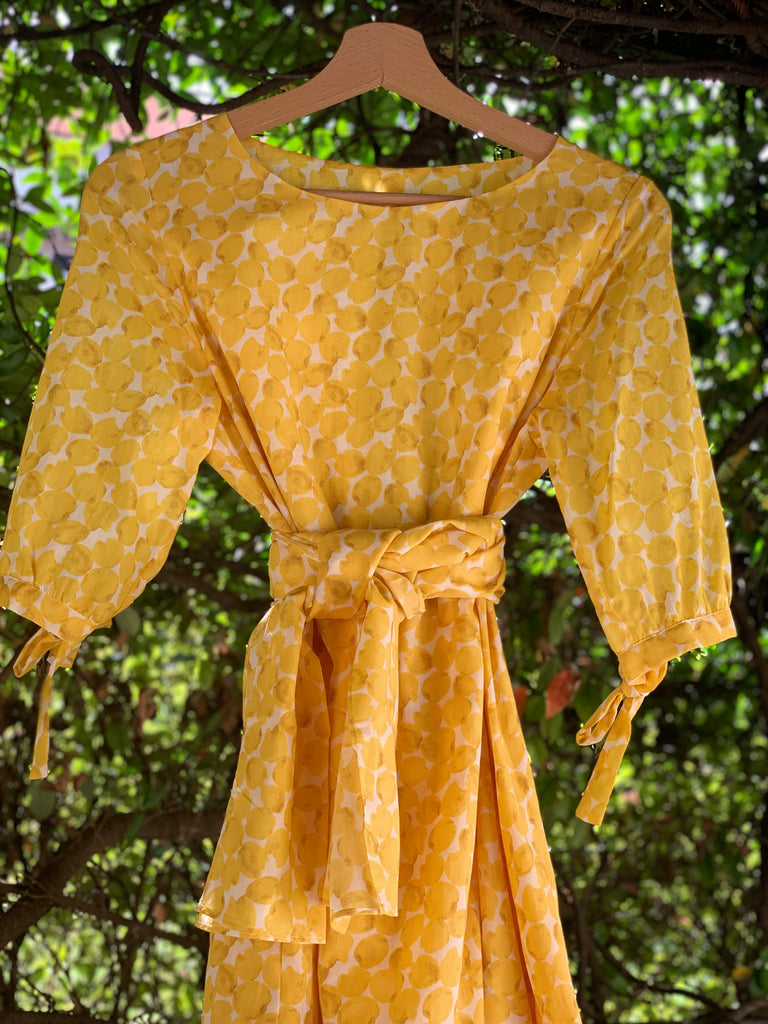 Abito in voile di cotone doppiato con manica a sbuffo, e fusciacca da legare in vita