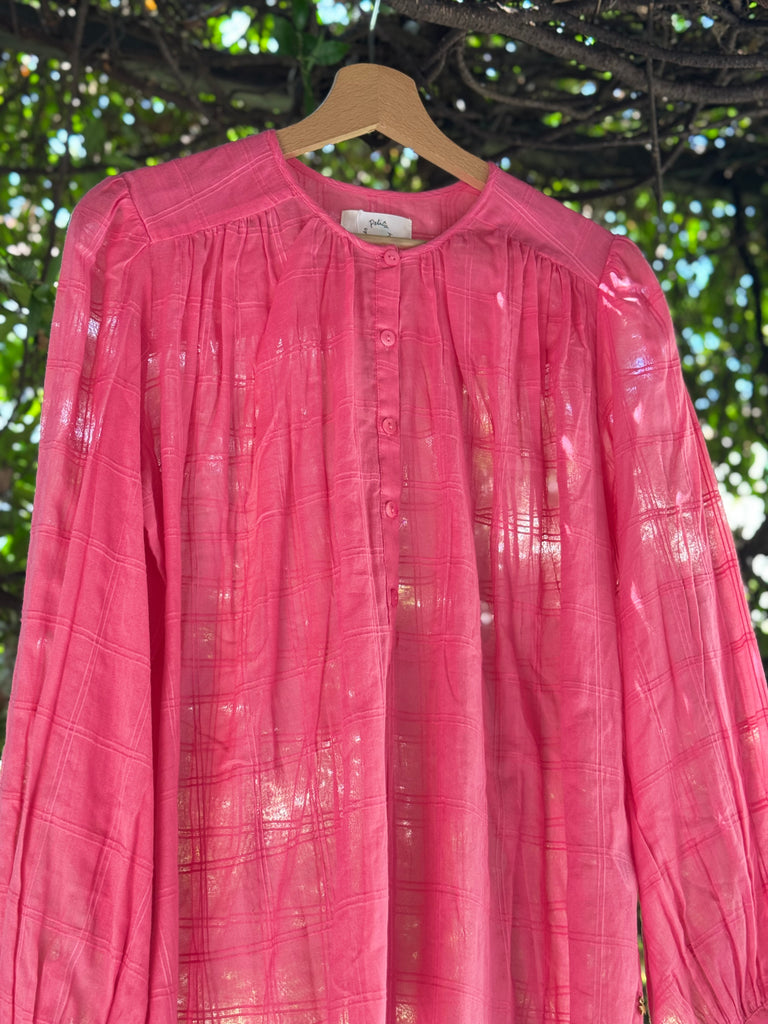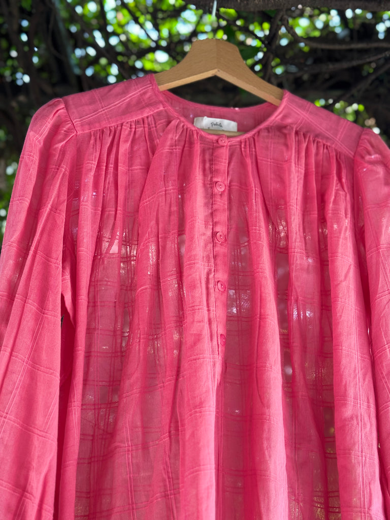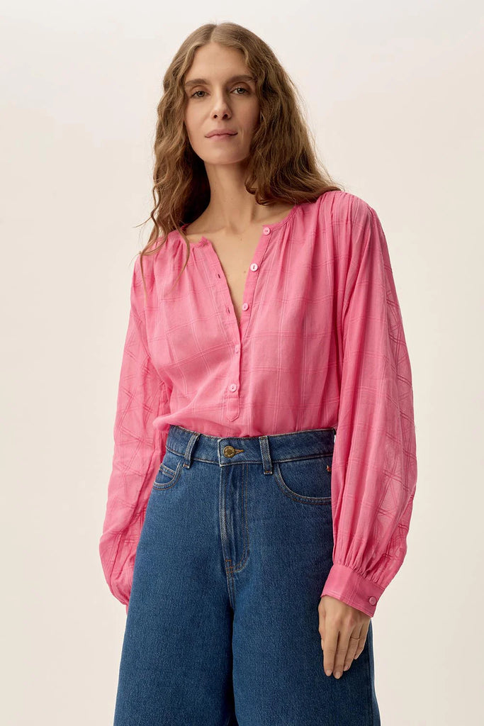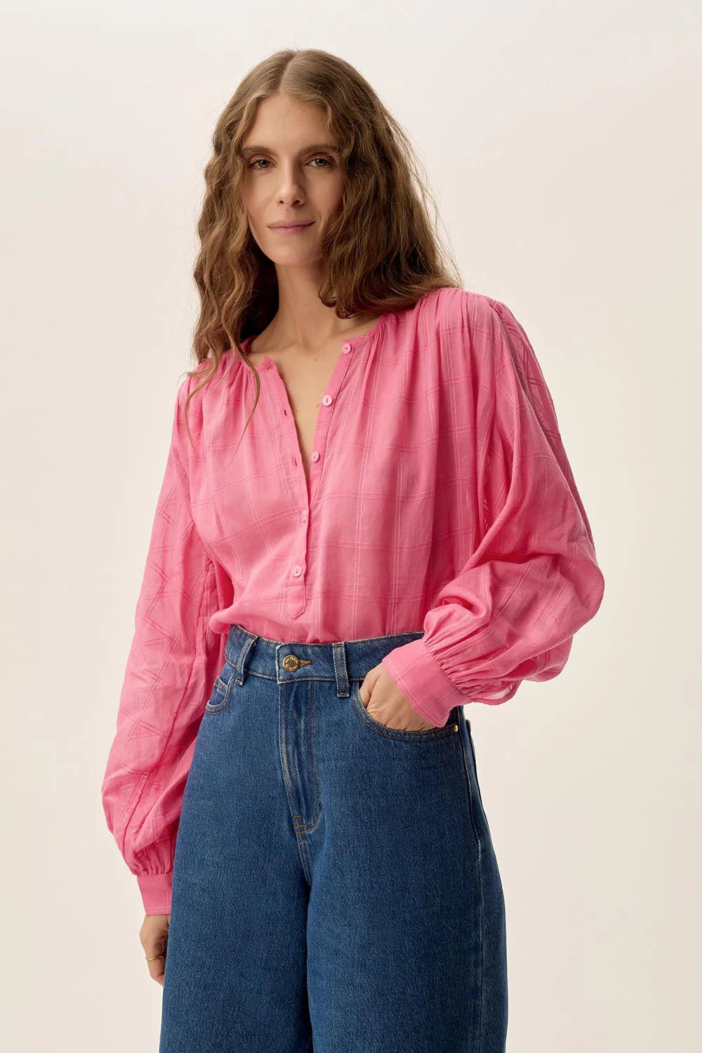 Camicia rosa intenso dal volume ampio leggero con manica a sbuffo con trama a rilievo ricamata che fa un motivo check, collo ala coreana allacciatura con bottoncini