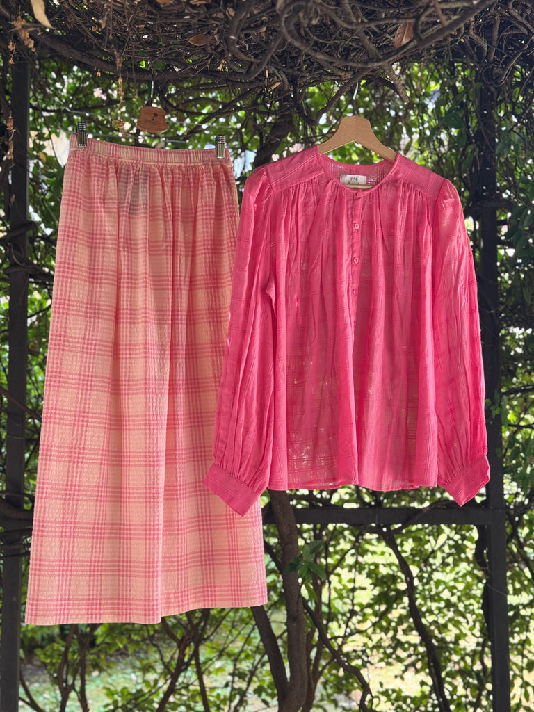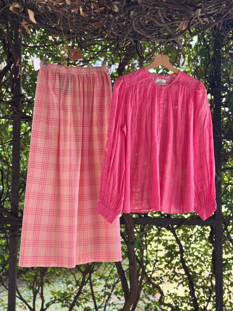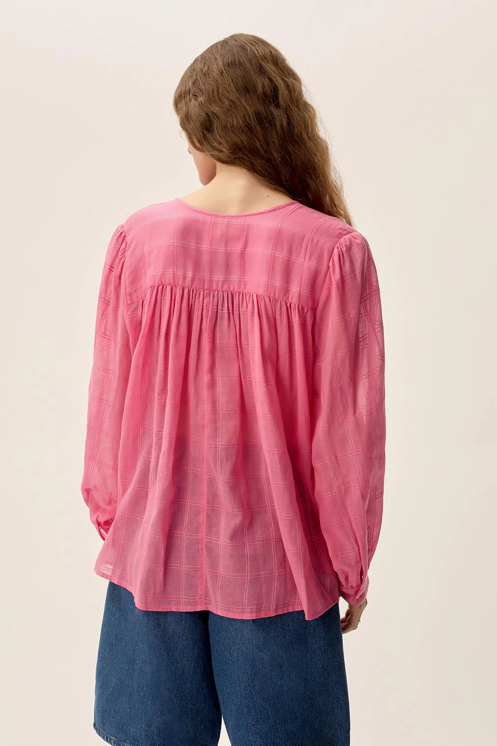 Camicia rosa intenso dal volume ampio leggero con manica a sbuffo con trama a rilievo ricamata che fa un motivo check, collo ala coreana allacciatura con bottoncini