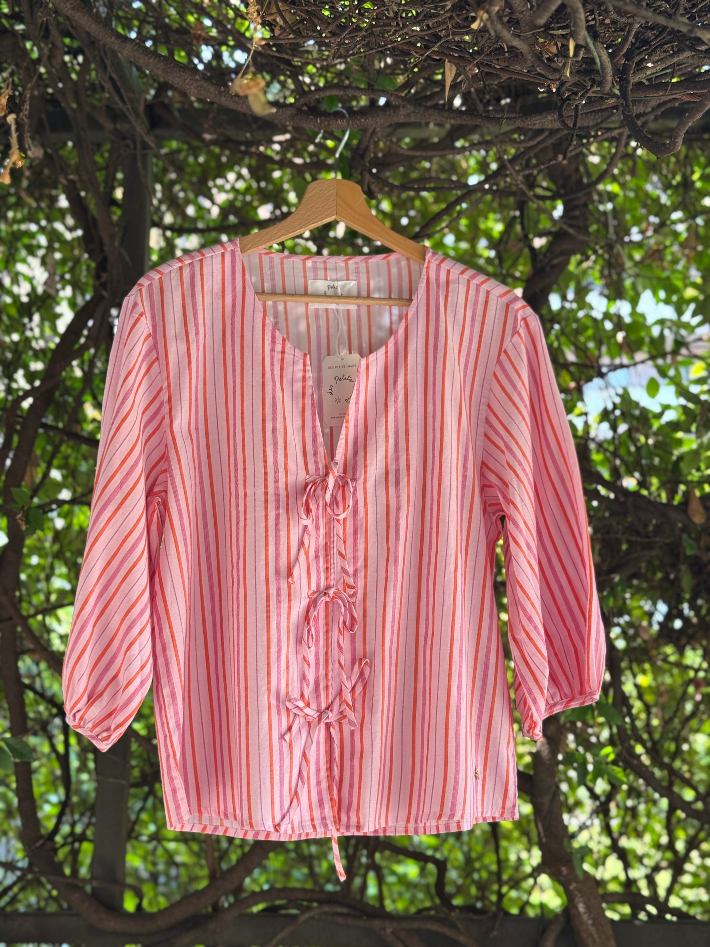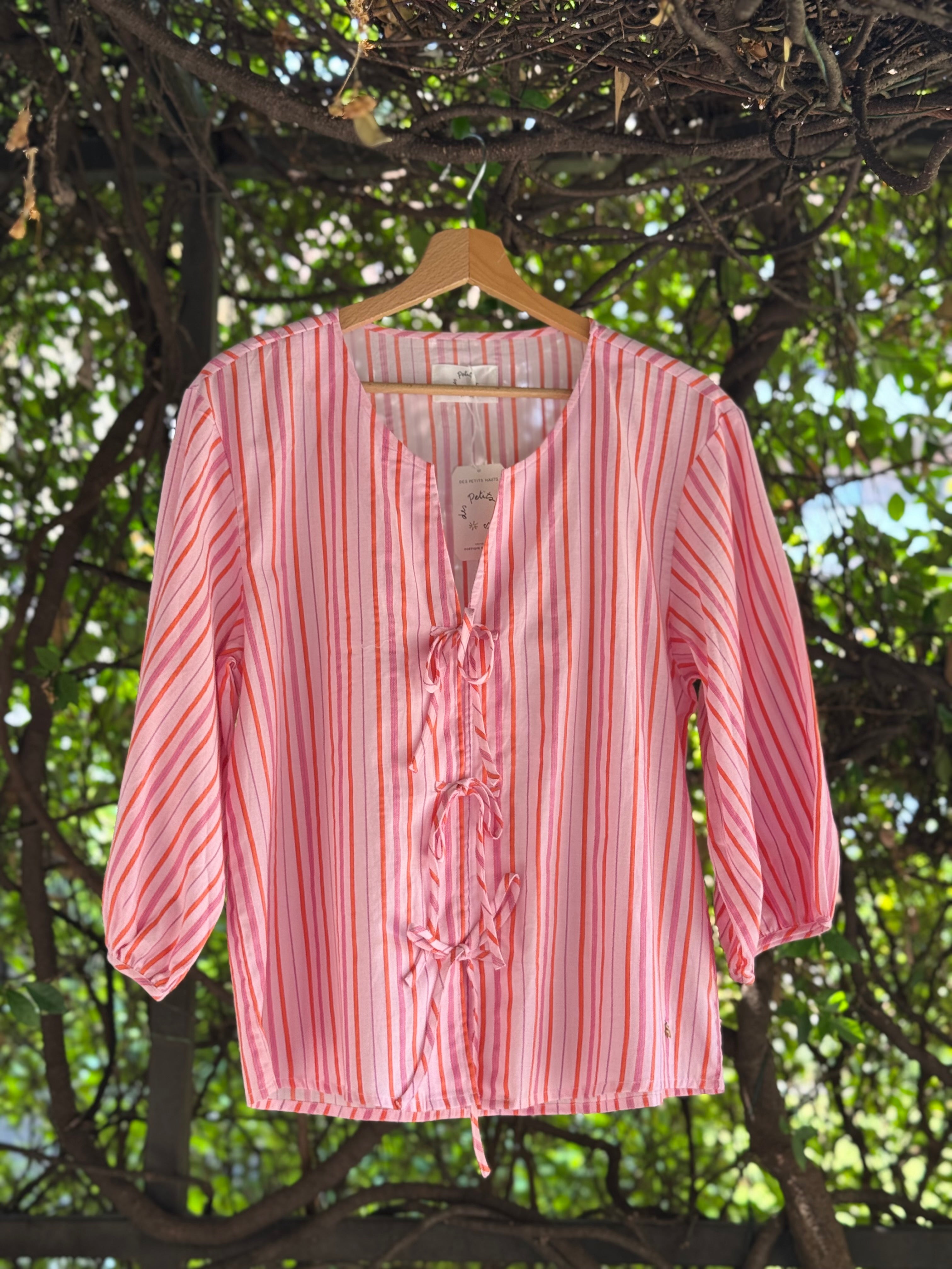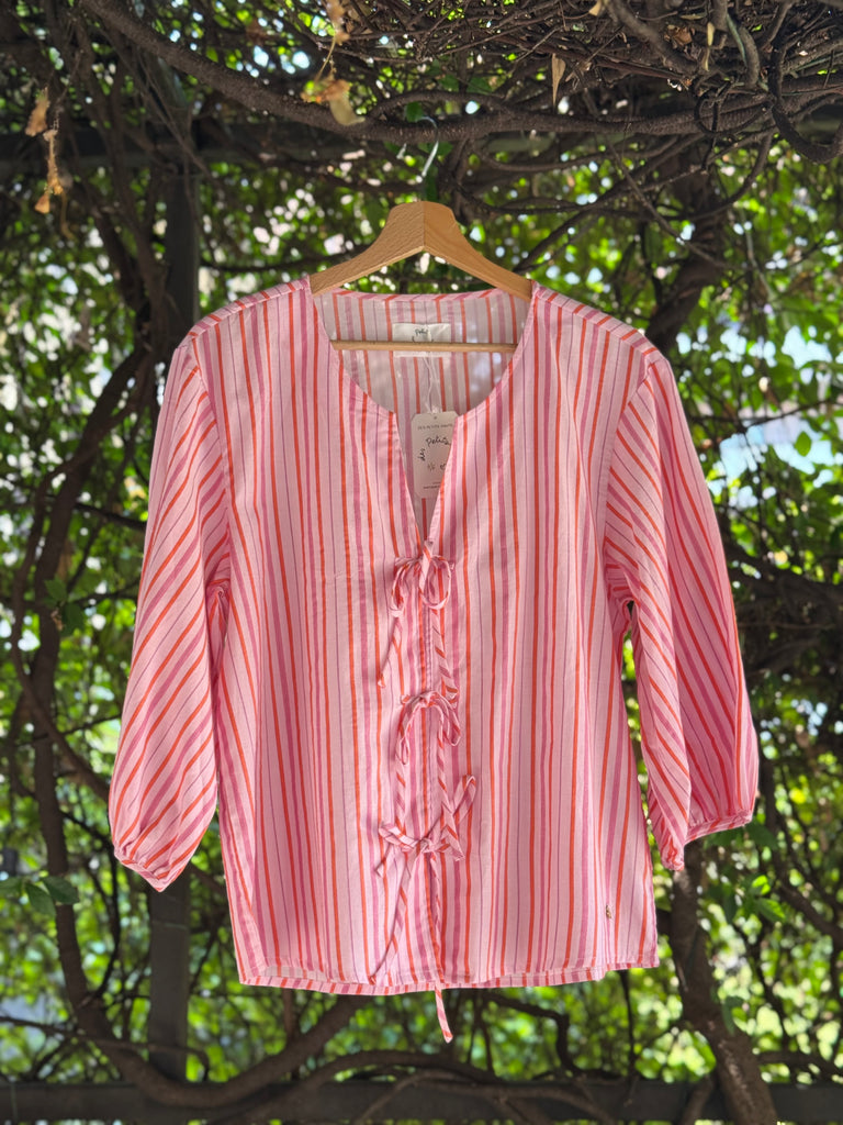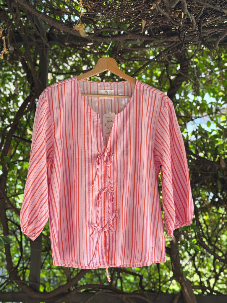 Blusa in cotone con scollo tondo senza collo, allacciata con fiocchetti sul davanti, a righe verticali rosa e arancio con ampie maniche a sbuffo