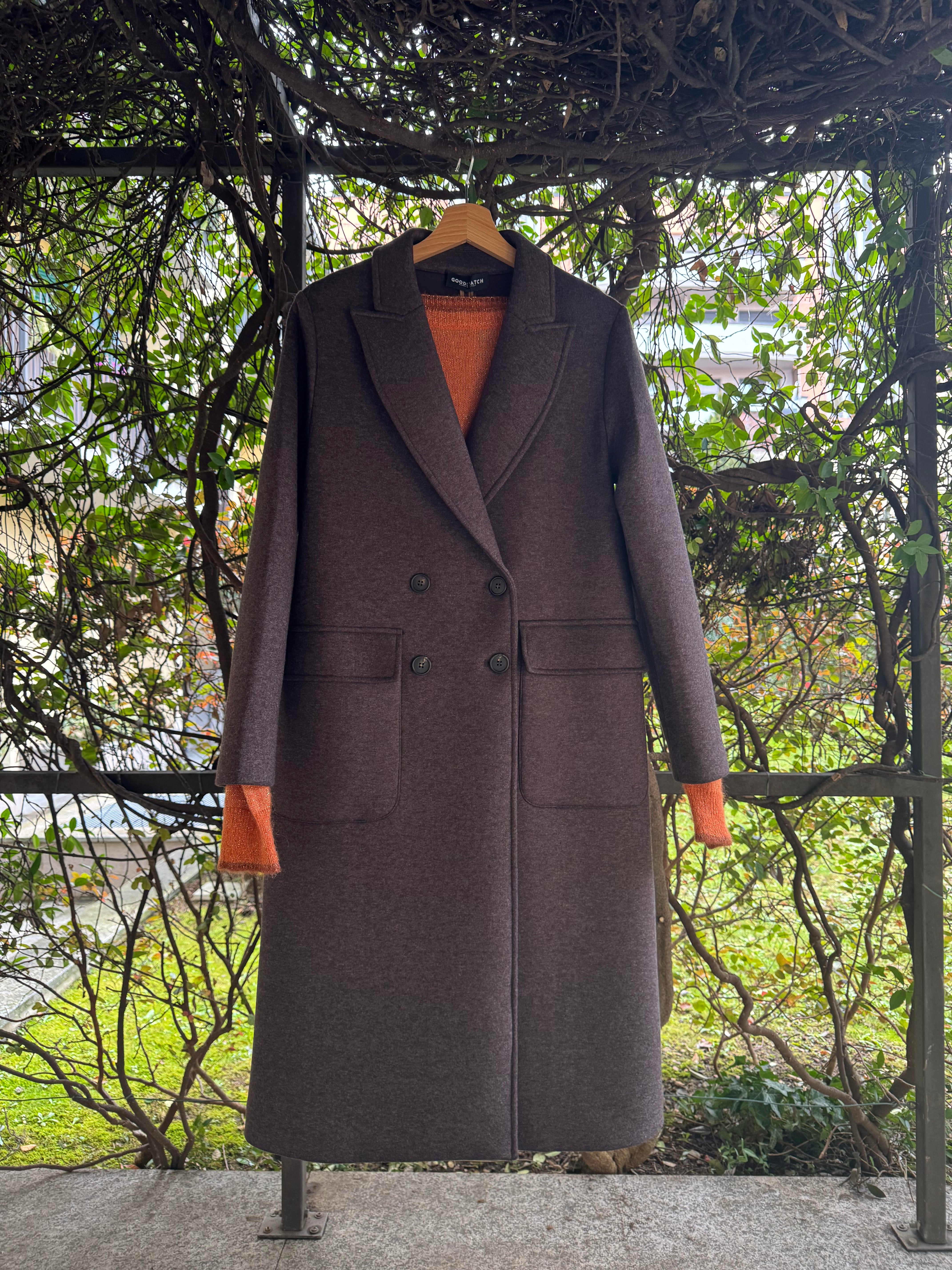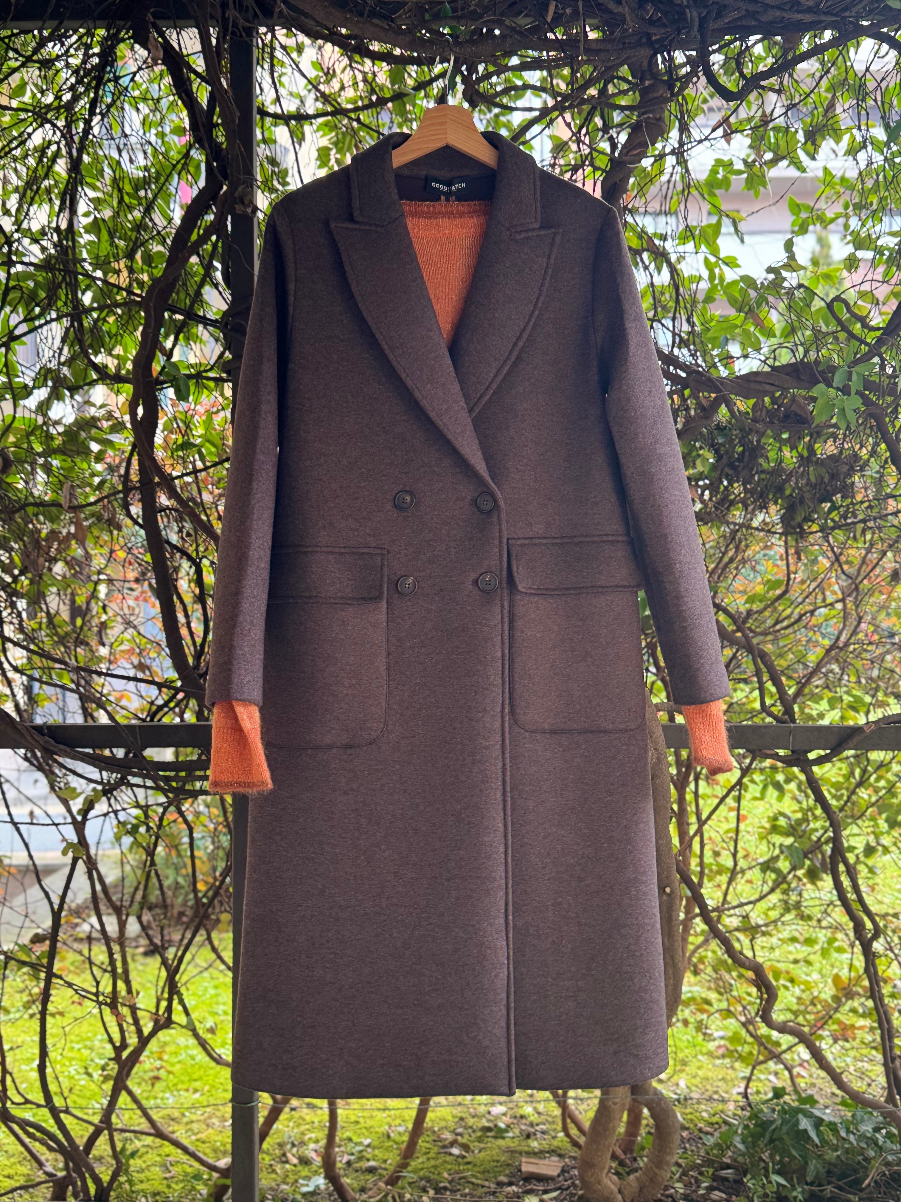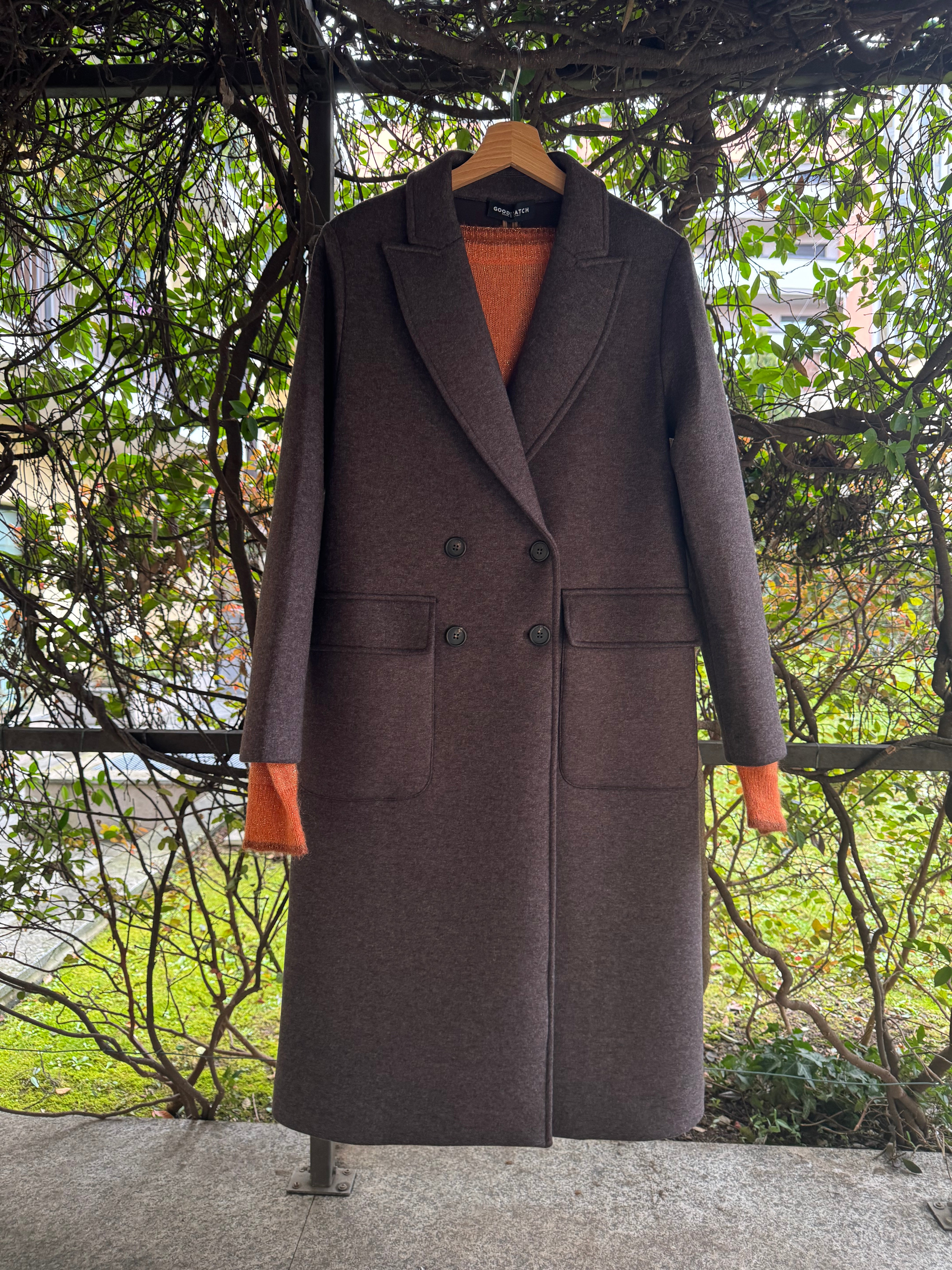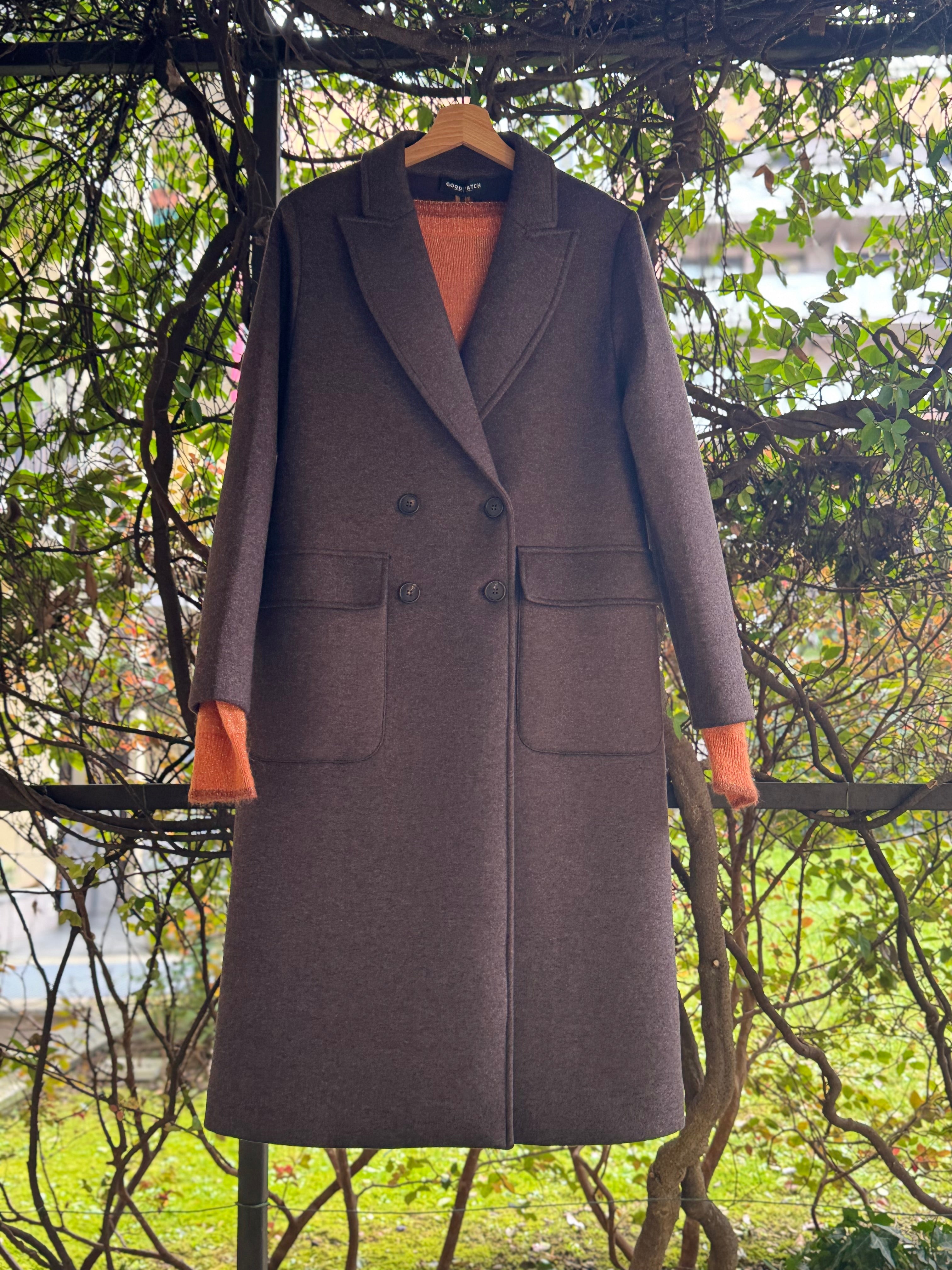 Cappotto marrone lungo a doppio petto con tasche applicate