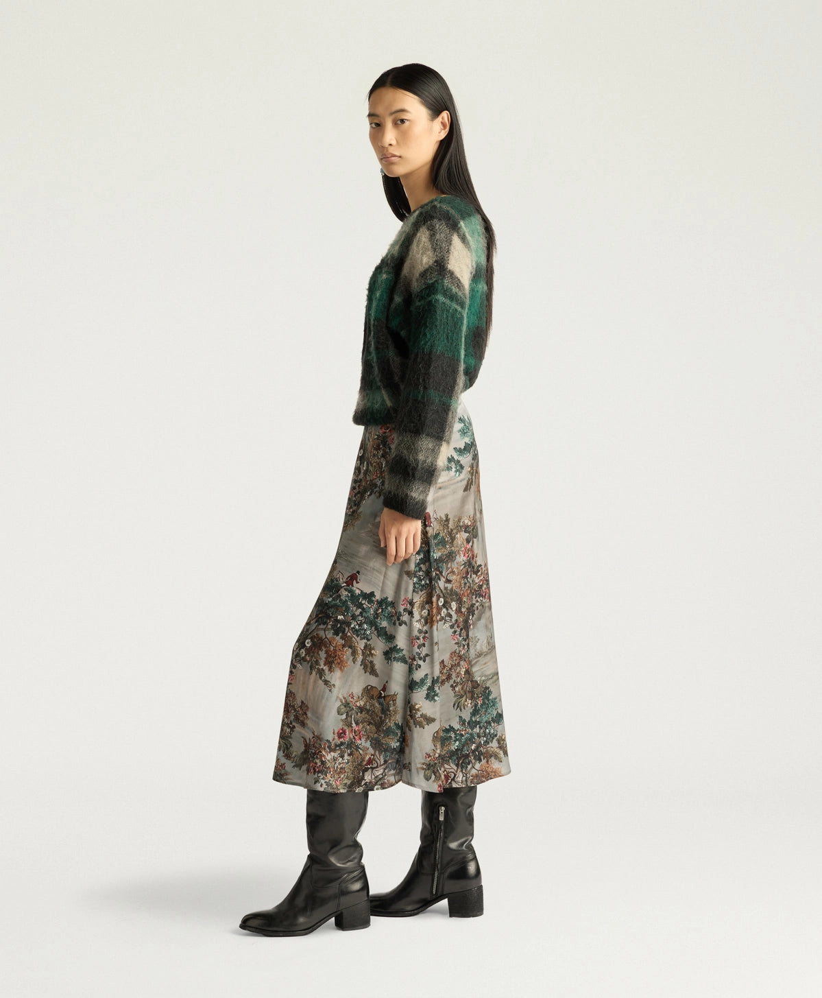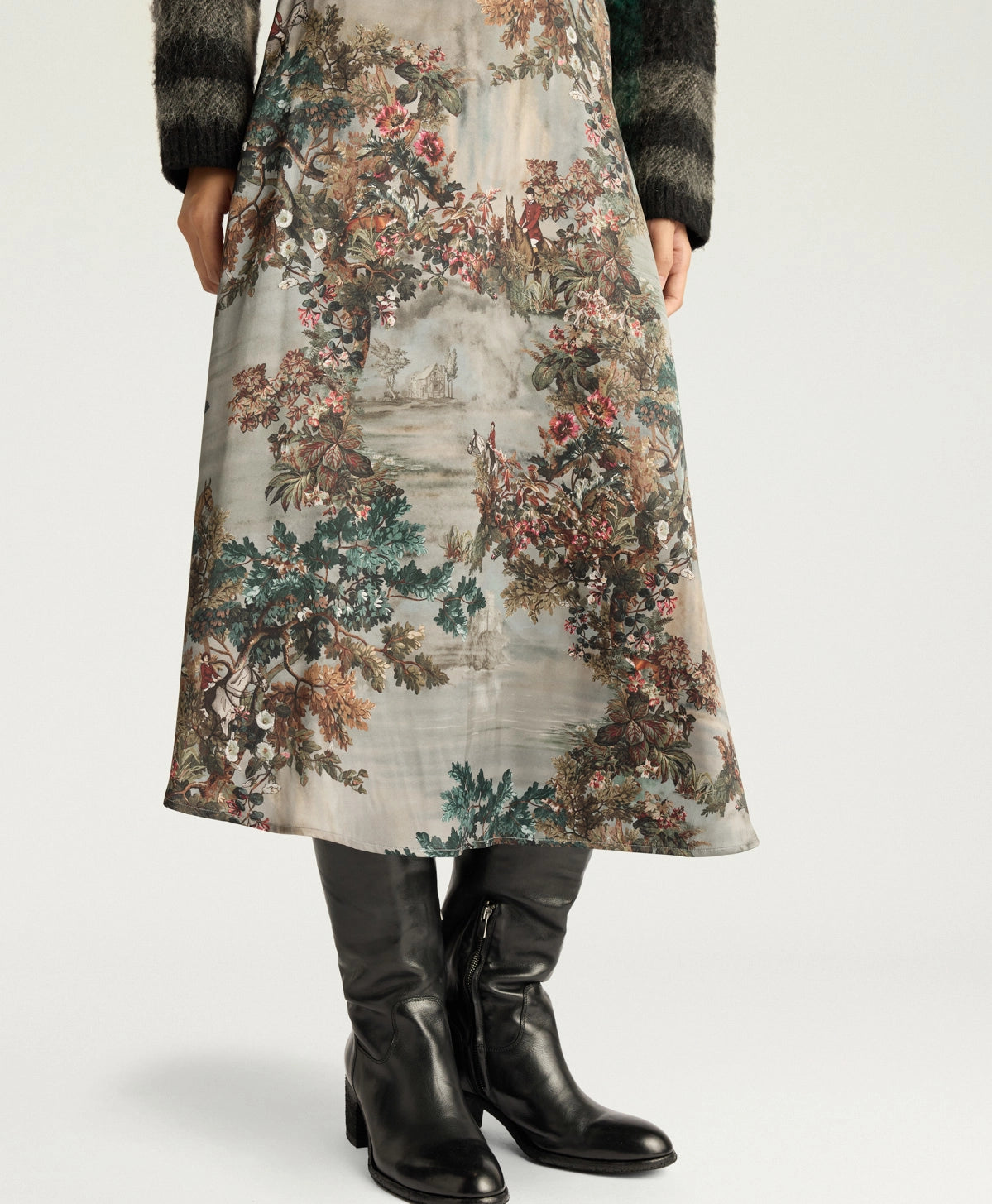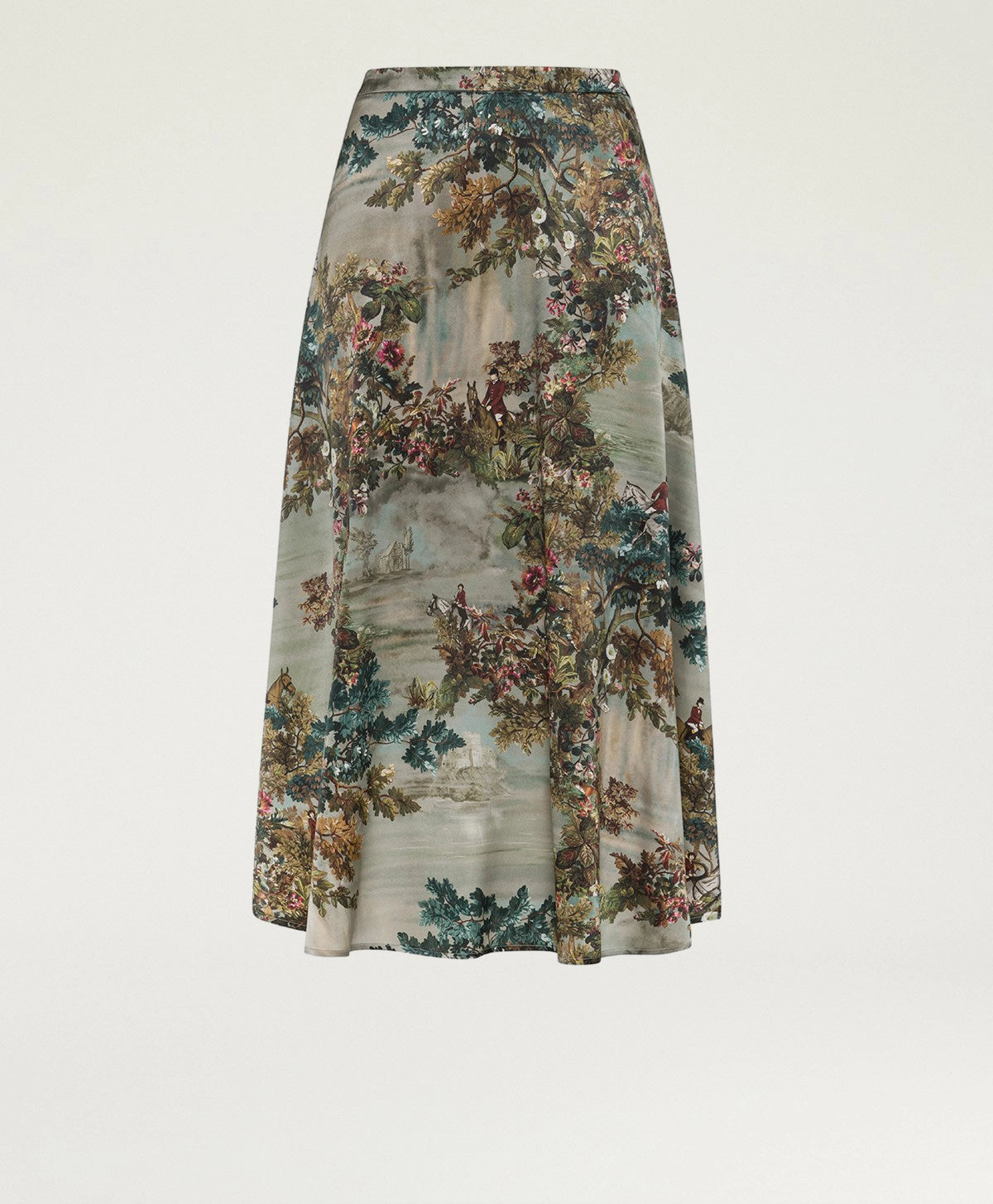 Gonna midi in prezioso raso stretch di pura seta stampata. Il taglio a mezza ruota di questa gonna dalla linea essenziale, crea movimento ed esalta la preziosità della stampa. Hebe è adatta ad arricchire tutti i look, da giorno e sera.