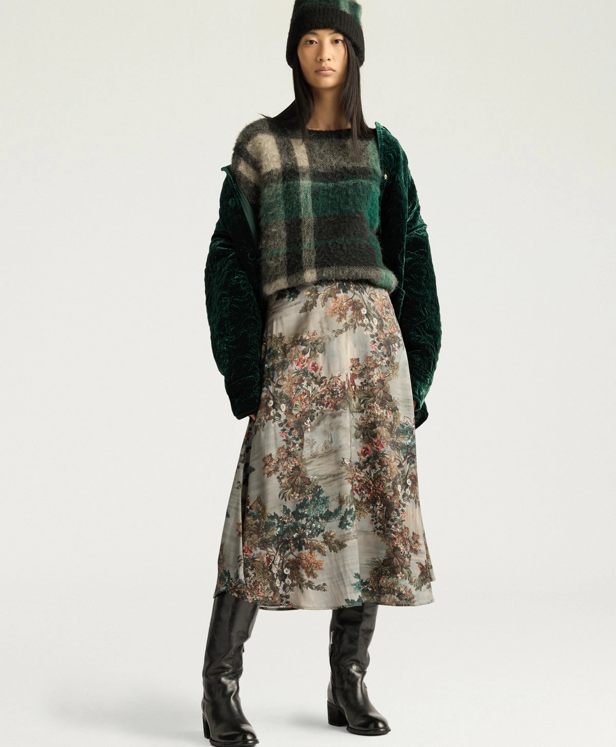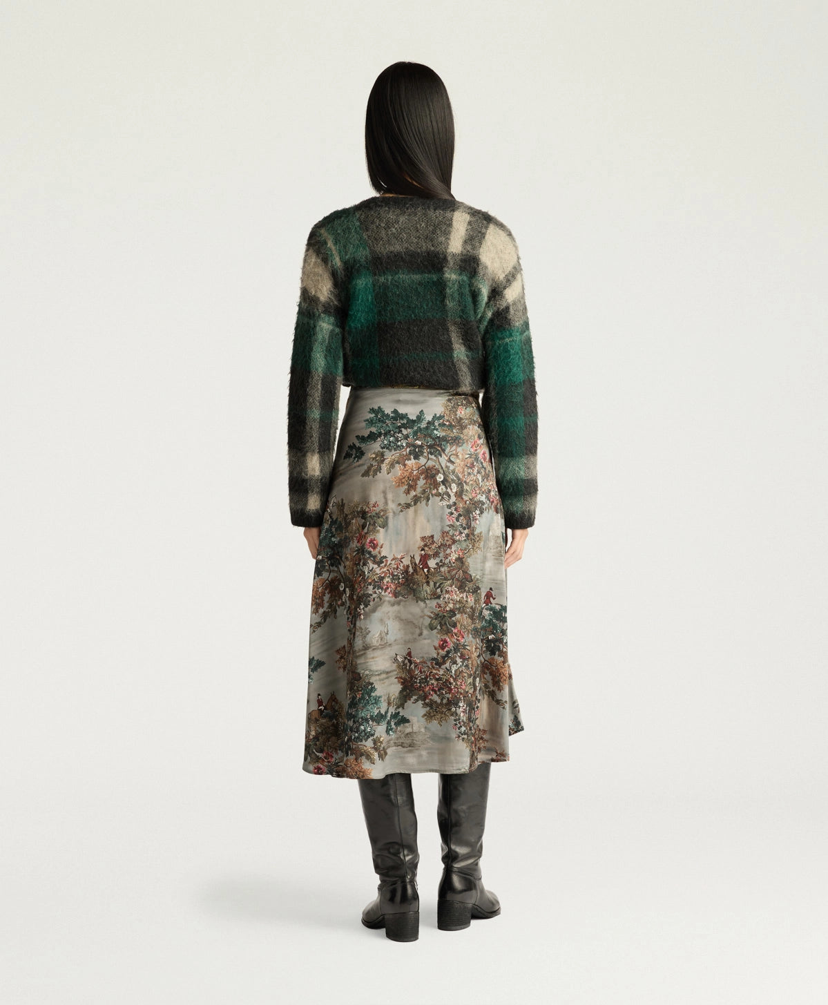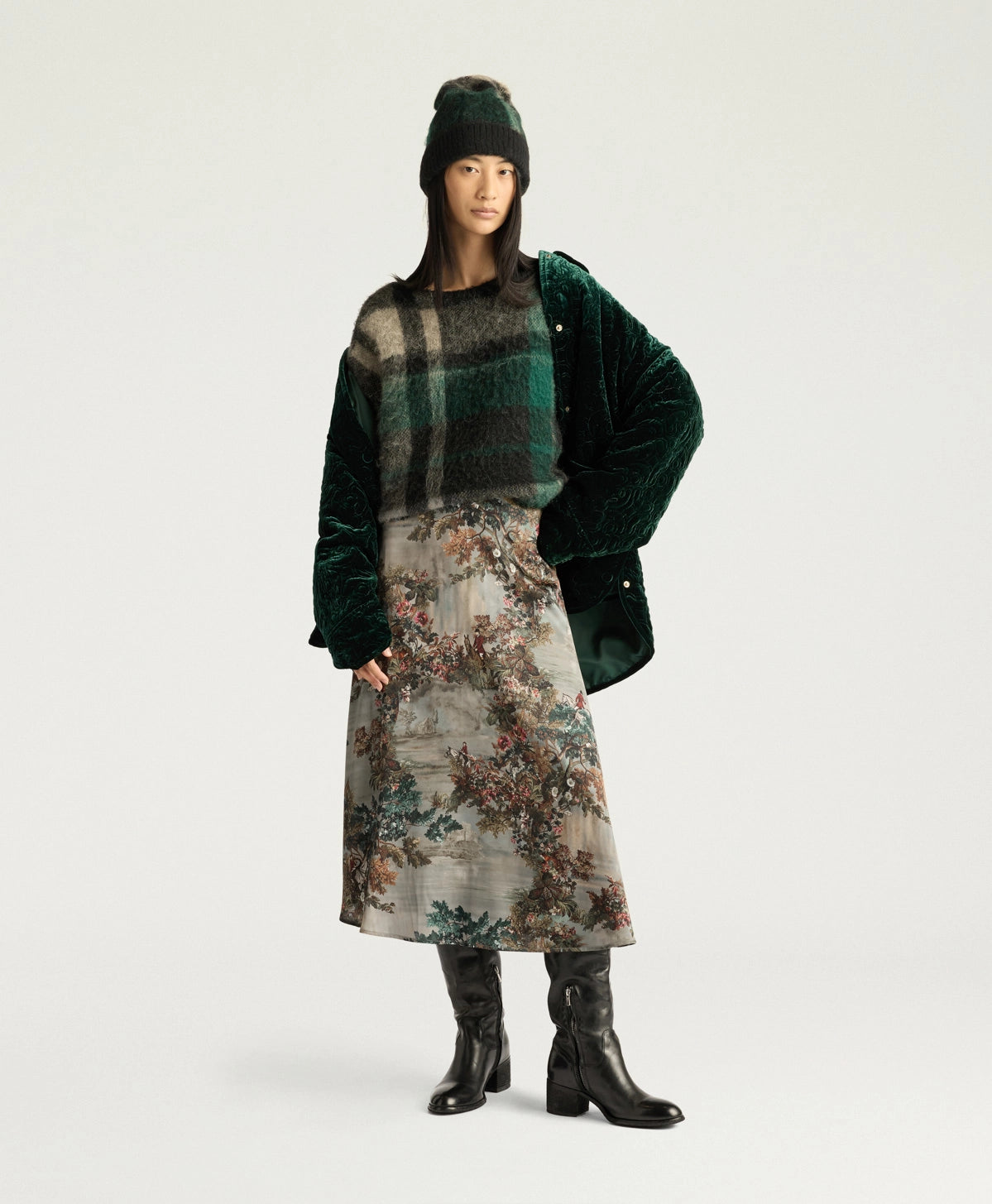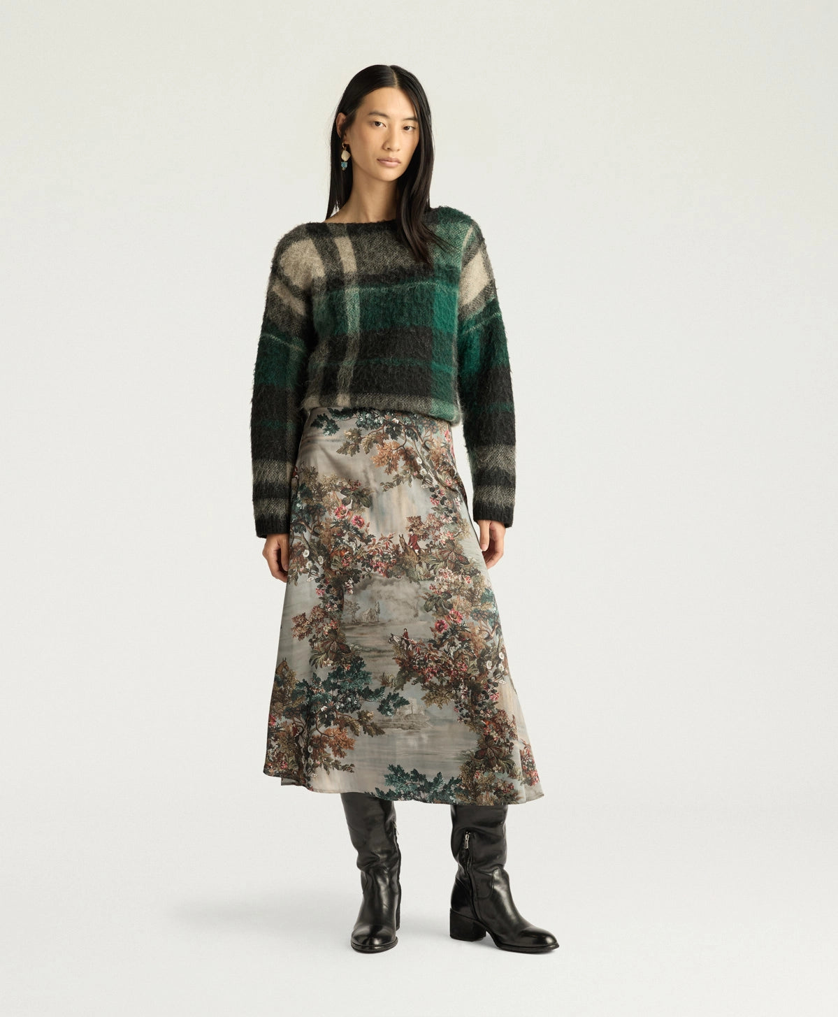 Gonna midi in prezioso raso stretch di pura seta stampata. Il taglio a mezza ruota di questa gonna dalla linea essenziale, crea movimento ed esalta la preziosità della stampa. Hebe è adatta ad arricchire tutti i look, da giorno e sera.