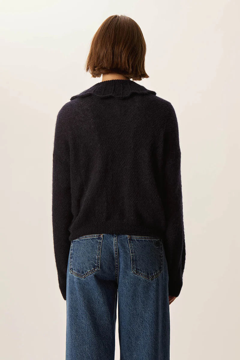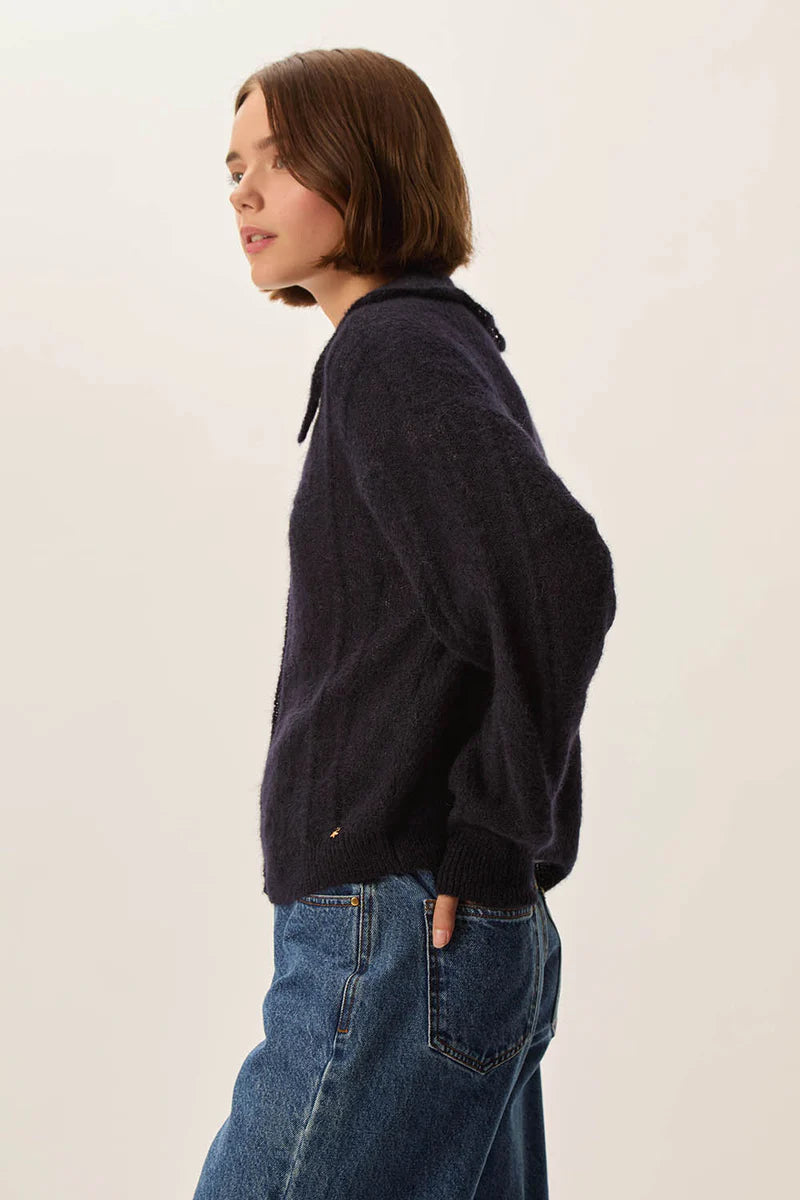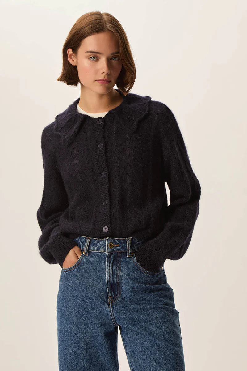 Maglia cardigan dal sapore romantico con ampie maniche e polsino alto, con collo ampio lavorata con motivo tricot in filato super kids mohair e baby alpaca