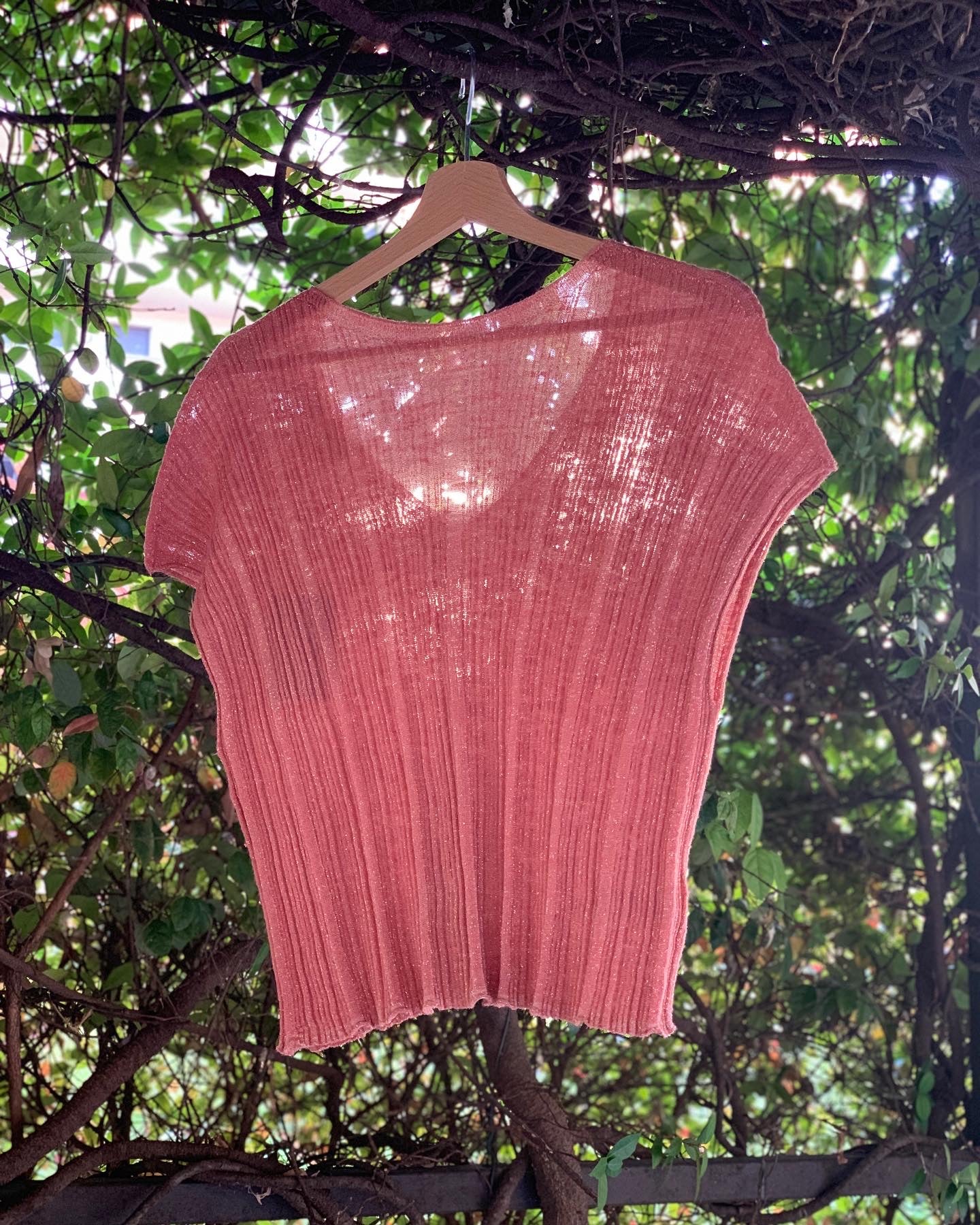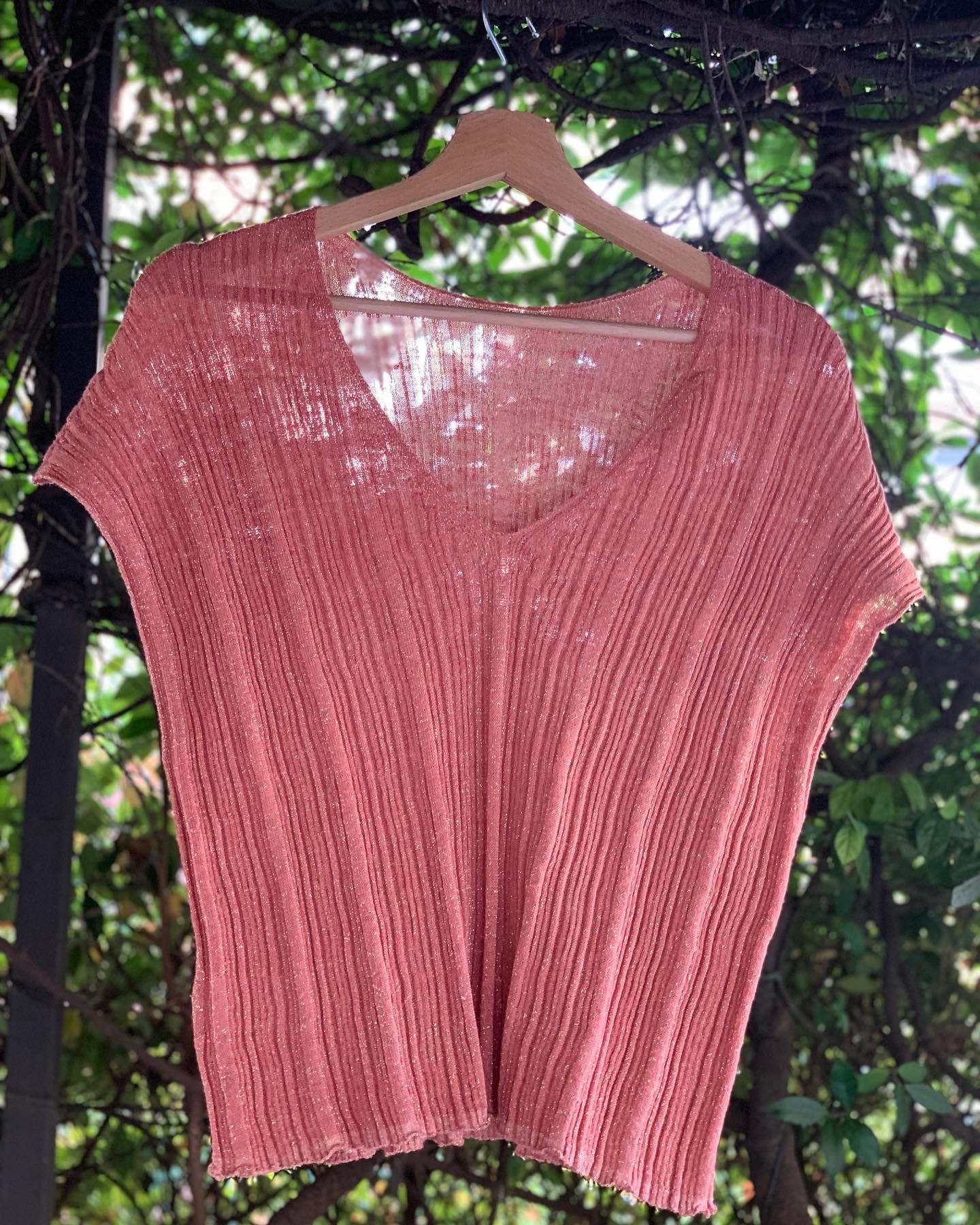 Maglia ampia scollata sulla schiena, pesca e lurex si può portare anche con lo scollo a V davanti