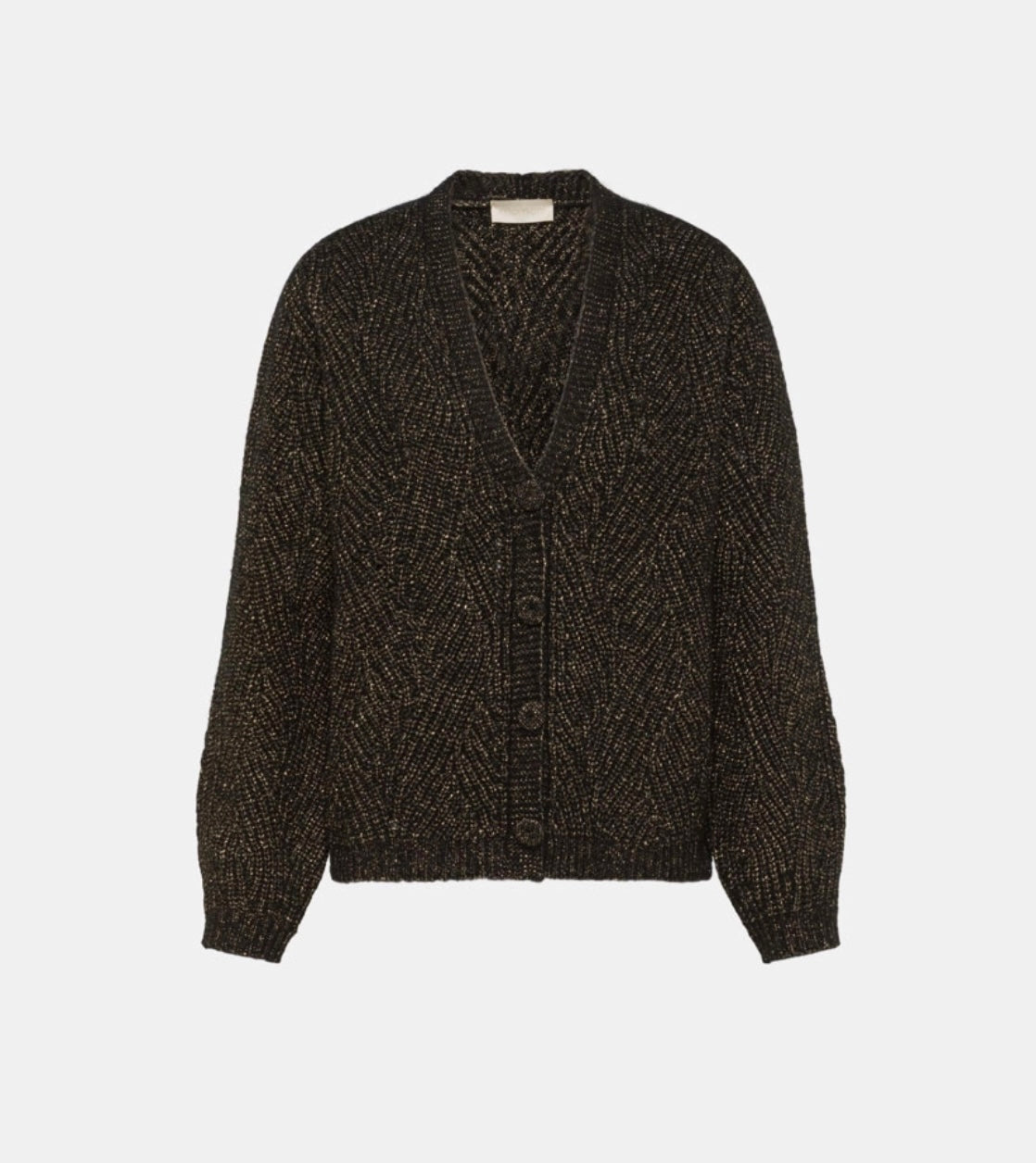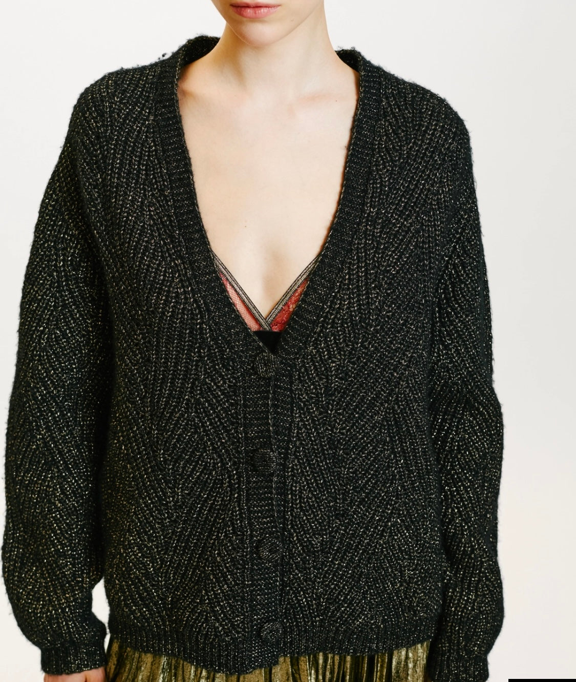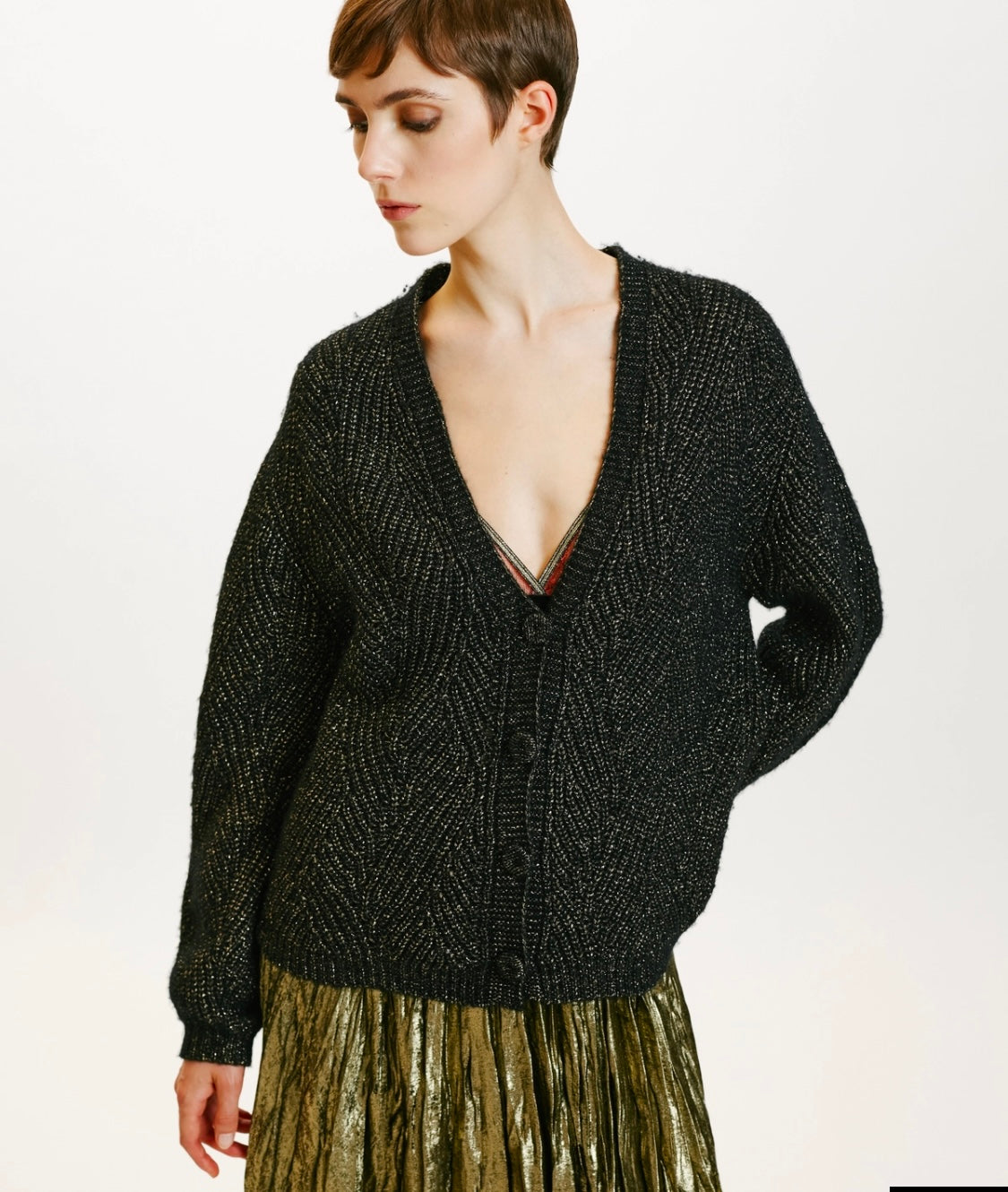 Cardigan effetto boxy in filato lana Vergine. Maniche lunghe, scollattura a "v", con rifinitura a coste sul fondo.