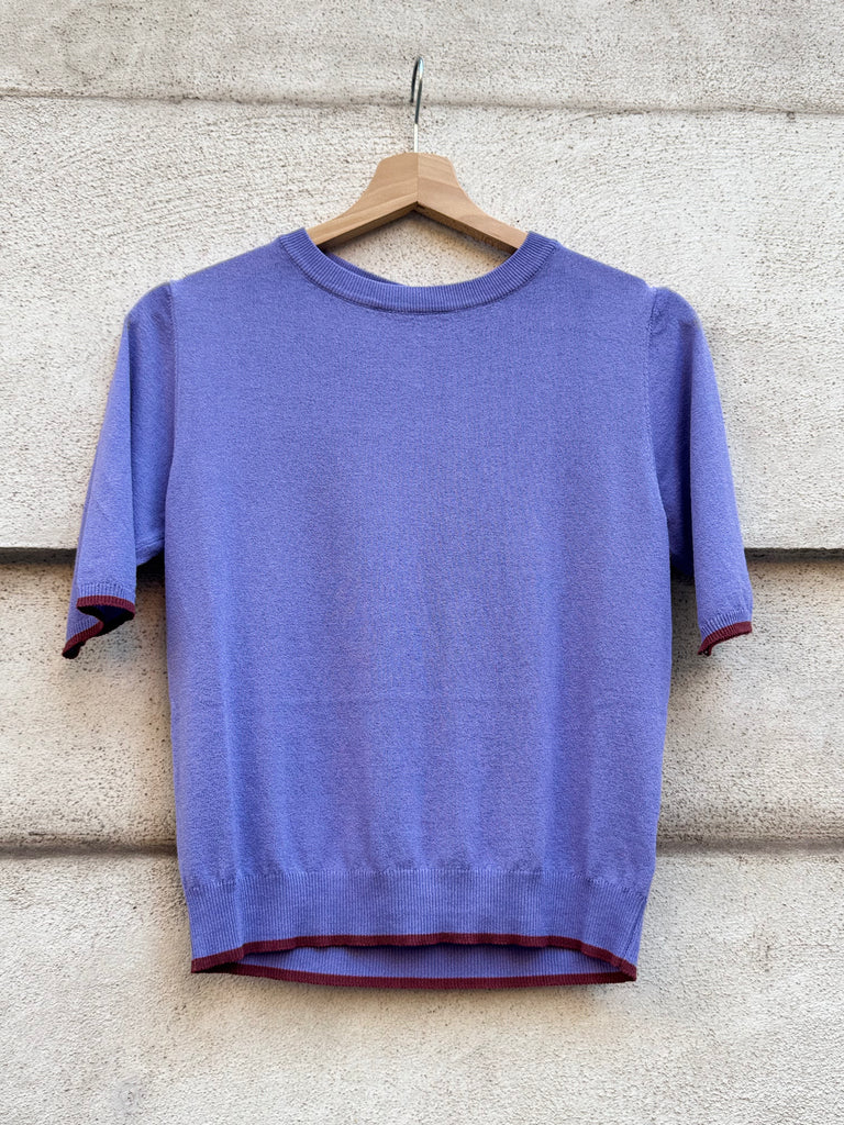 Maglia in filo di viscosa, a girocollo con manica al gomito, con profili a contrasto. Made in Italy
